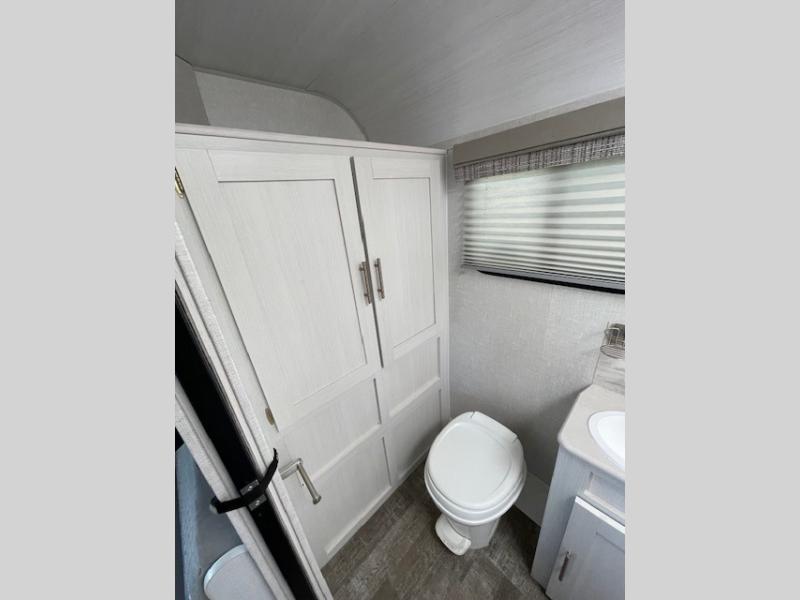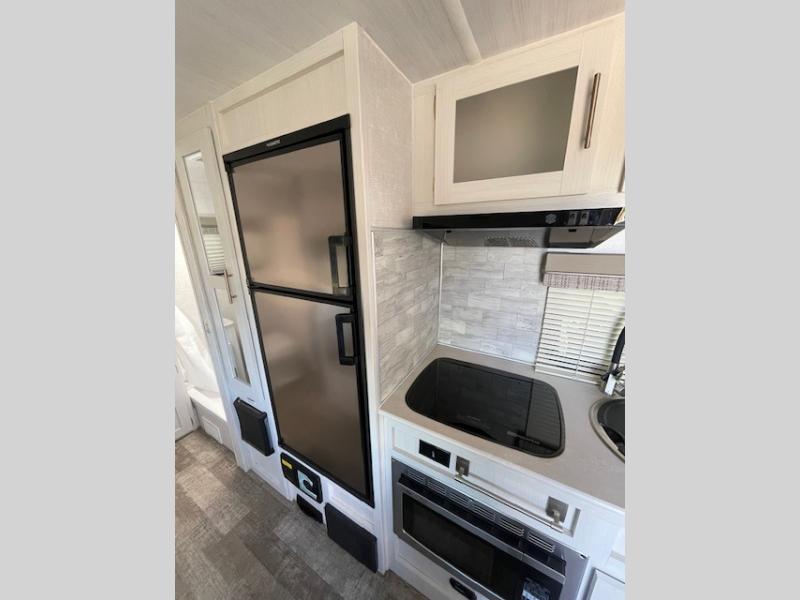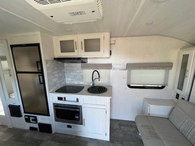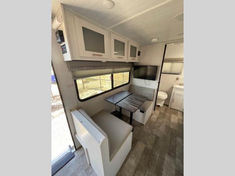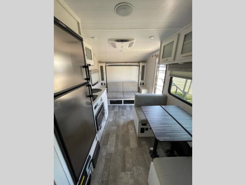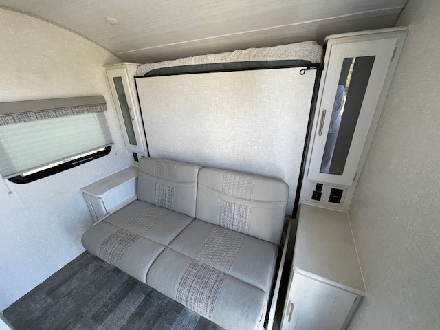 You're going to love all of the conveniences and versatility of this R-Pod travel trailer! The front Murphy bed folds away to reveal the sofa which gives you a comfortable place to sit during the day and to sleep at night too. The rear full bath features everything you will need to get squeaky clean each morning as well as a large wardrobe for you to store your linens. After you have whipped up your best meal with the two-burner cooktop, you can head to the 30" x 75" booth dinette and enjoy eating it there comfortably. There is plenty of storage space inside, but if you need more space, then you can use the exterior pass-through storage!