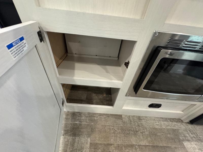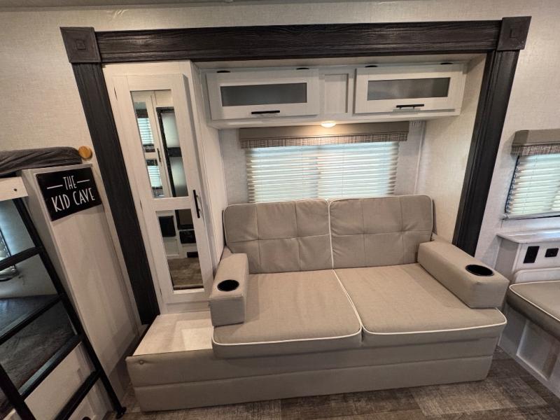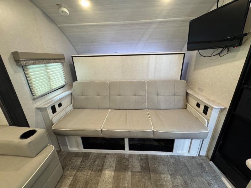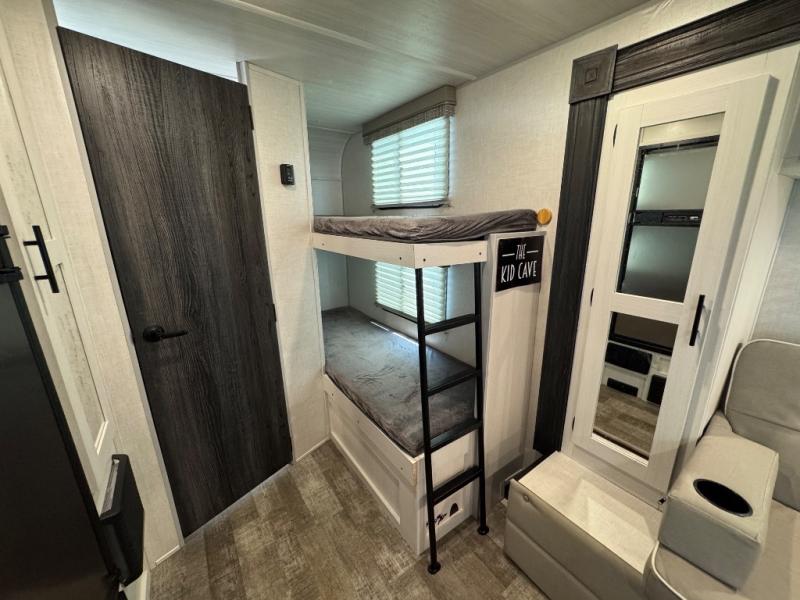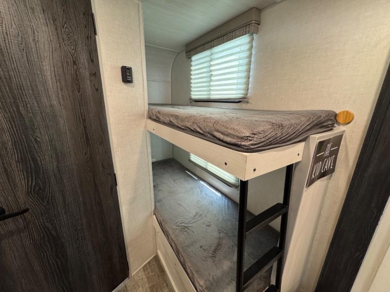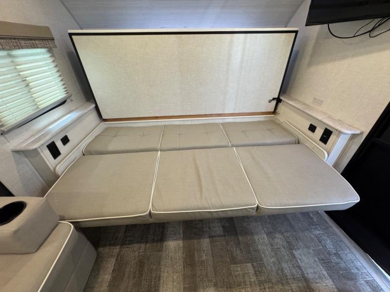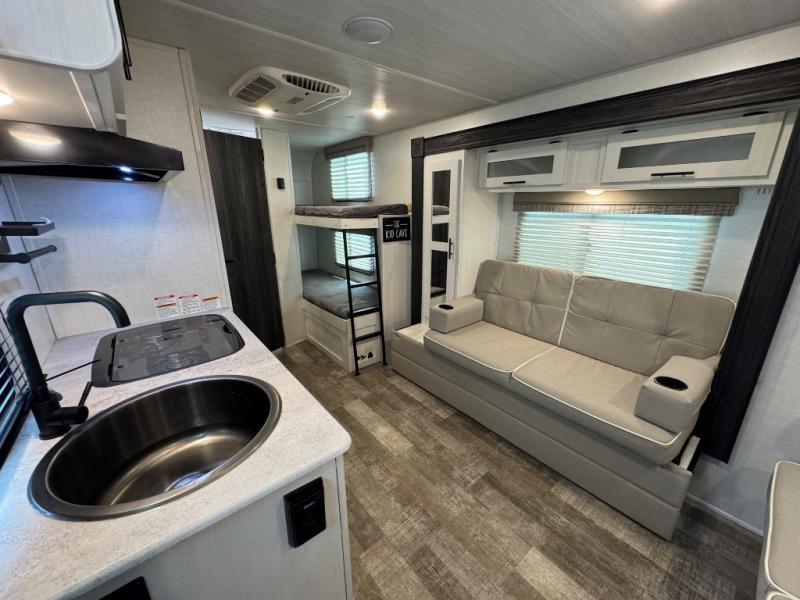 The whole family will enjoy this trailer with sleeping space for five between the bunk beds, the queen Murphy bed and the second sofa within the slide out. This sofa also includes a table for dining, and there is a closet to hang your clothes. During the day you will be able to relax inside while visiting with the cook in the kitchen with full amenities including a pantry for dry good storage. And the bathroom includes a toilet, linen storage, and a shower with a sink, so load up and head out to easily set up and enjoy your own accommodations in the great outdoors.