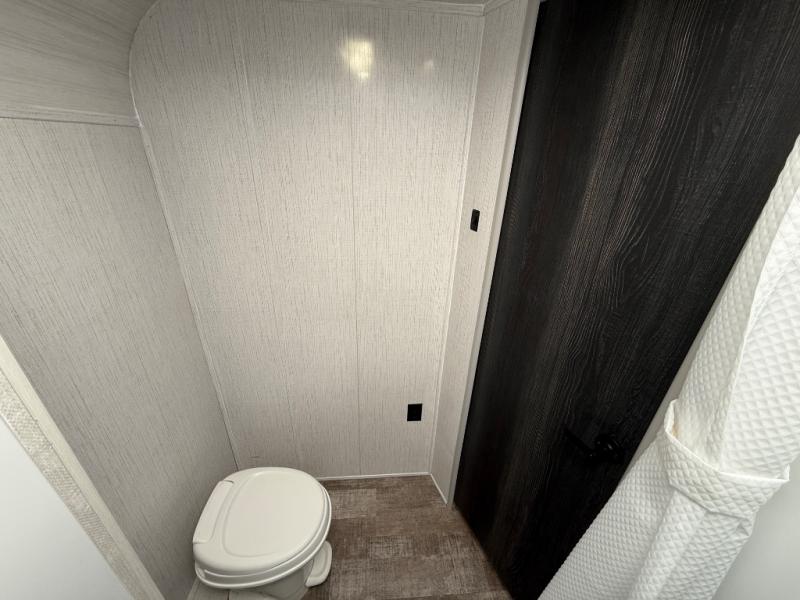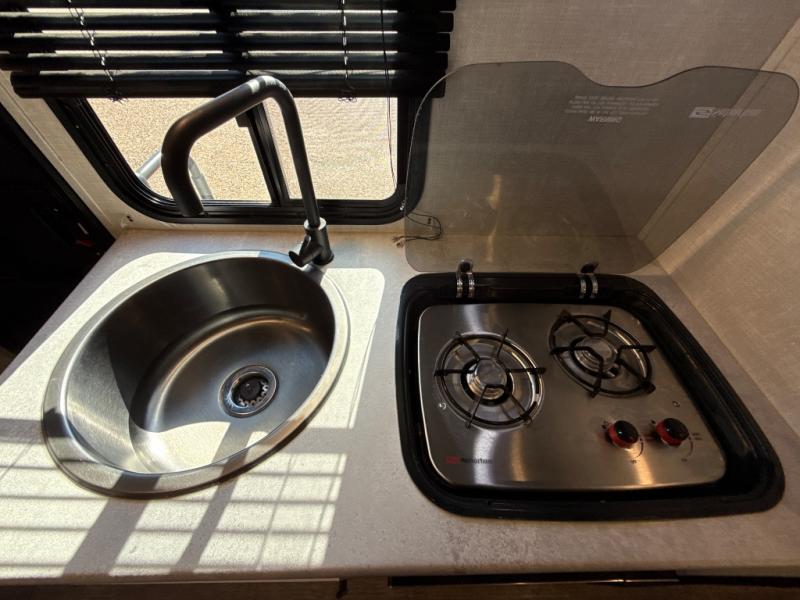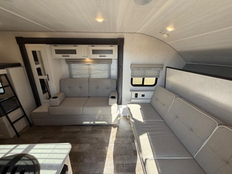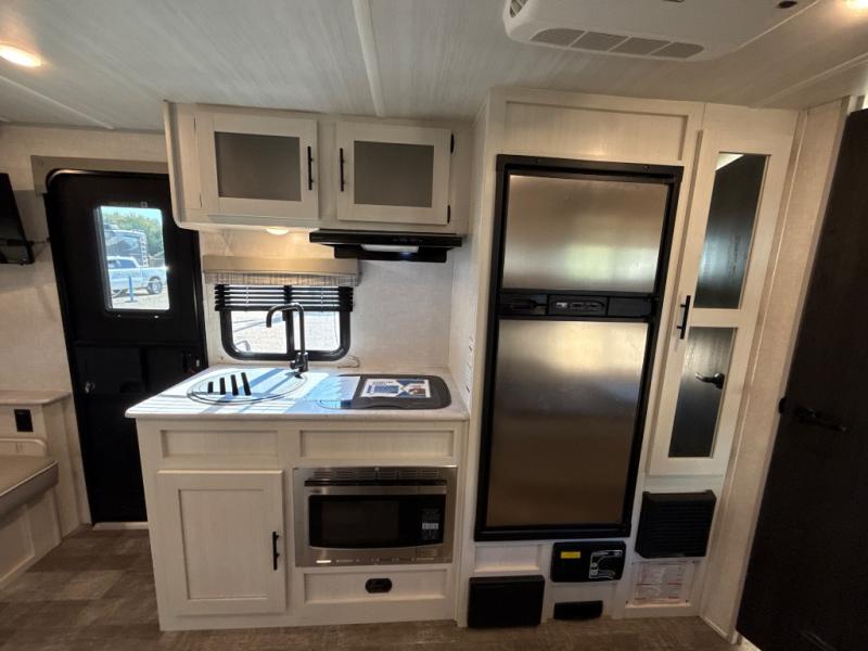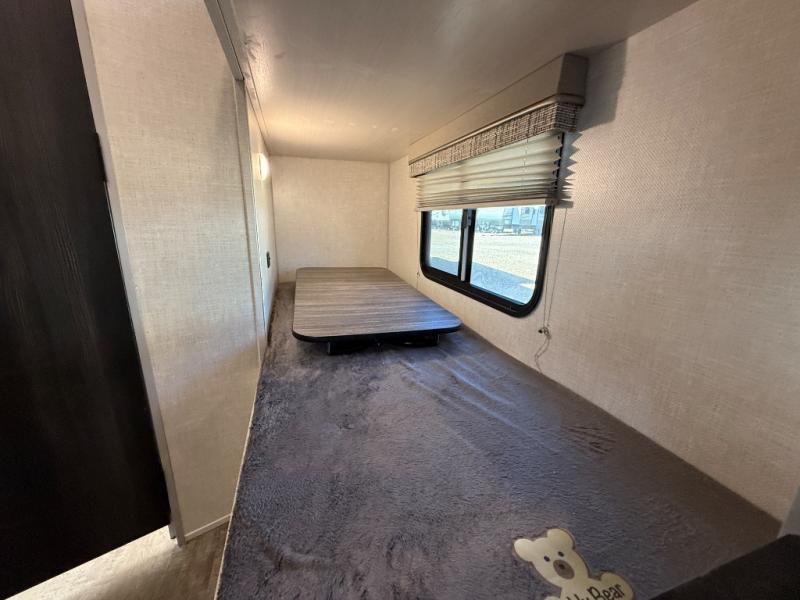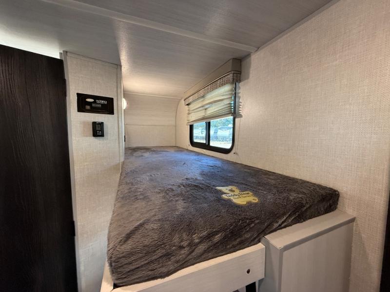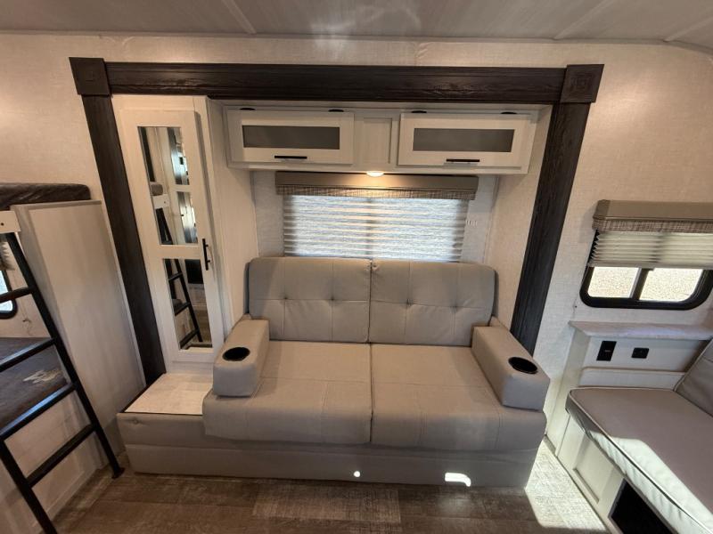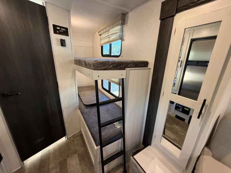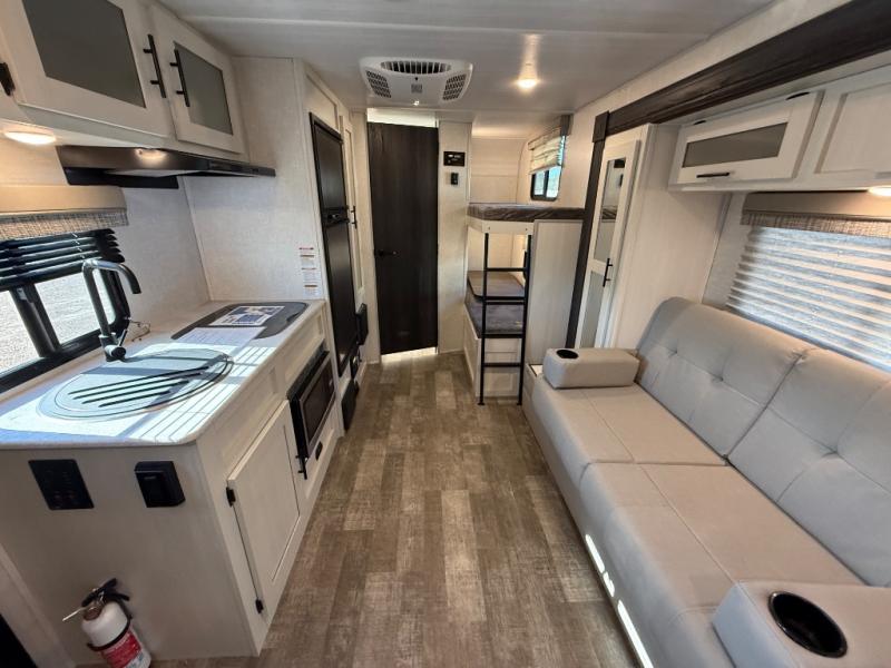 The whole family will enjoy this trailer with sleeping space for five between the bunk beds, the queen Murphy bed and the second sofa within the slide out. This sofa also includes a table for dining, and there is a closet to hang your clothes. During the day you will be able to relax inside while visiting with the cook in the kitchen with full amenities including a pantry for dry good storage. And the bathroom includes a toilet, linen storage, and a shower with a sink, so load up and head out to easily set up and enjoy your own accommodations in the great outdoors.