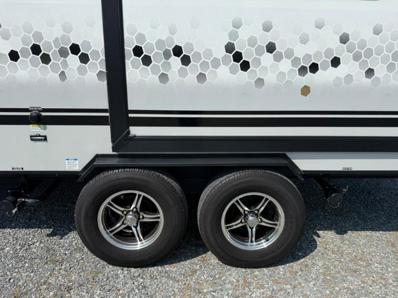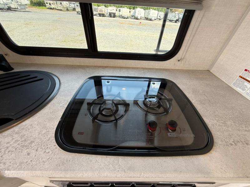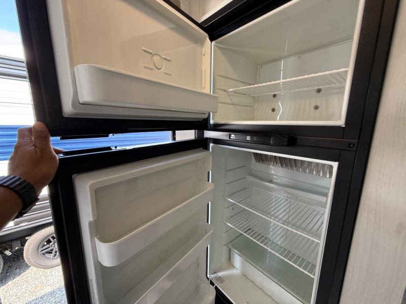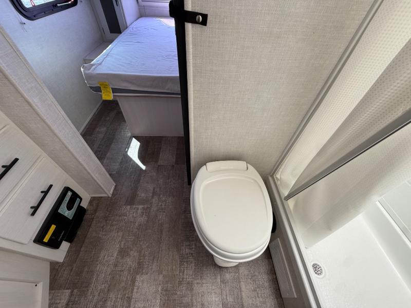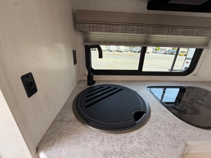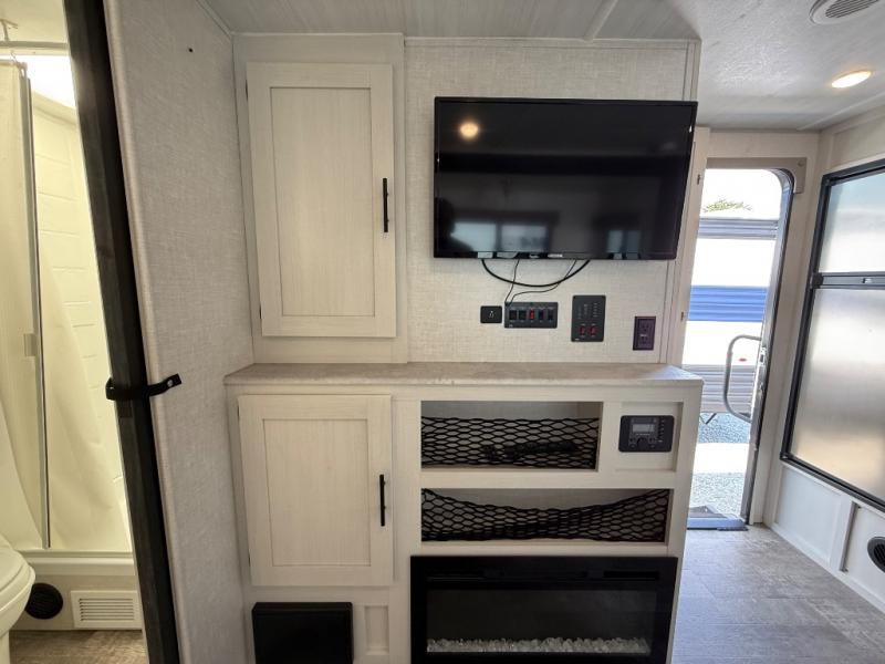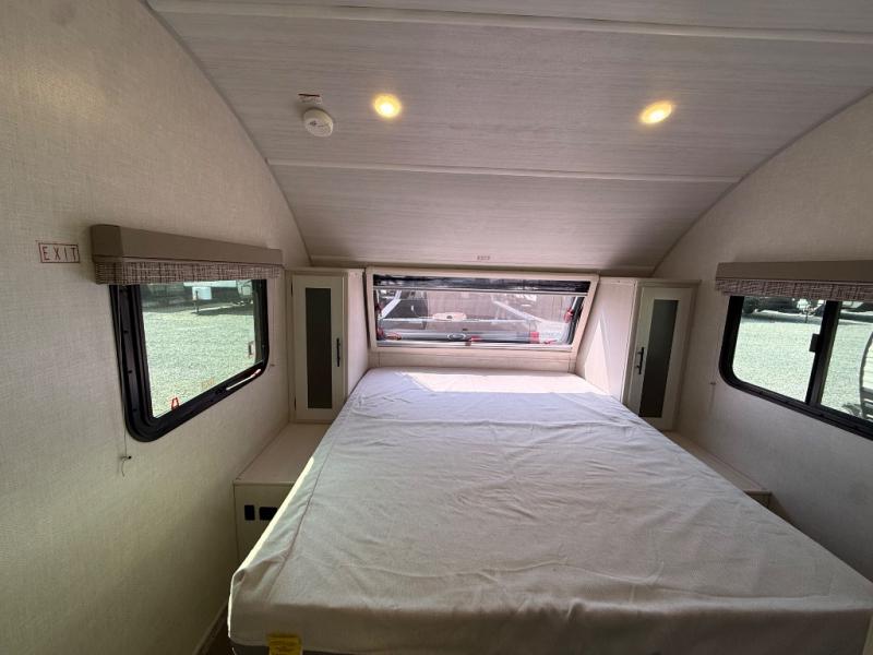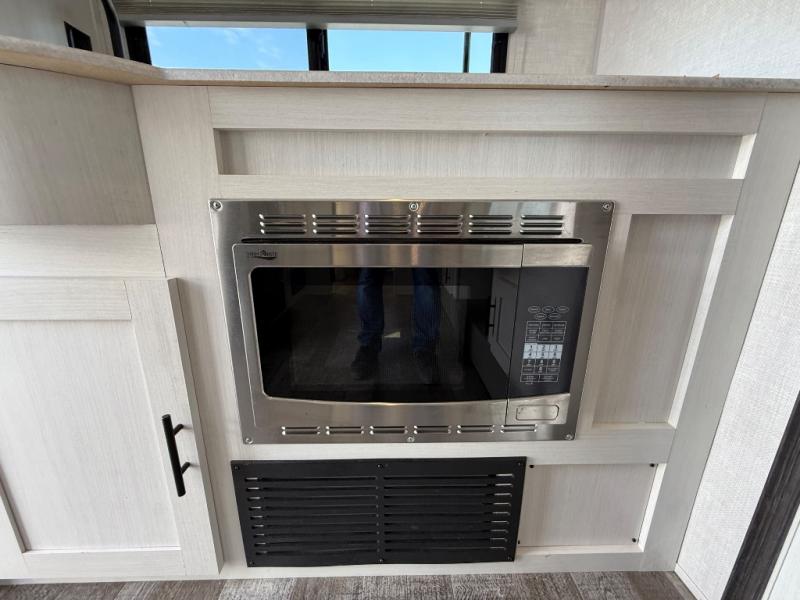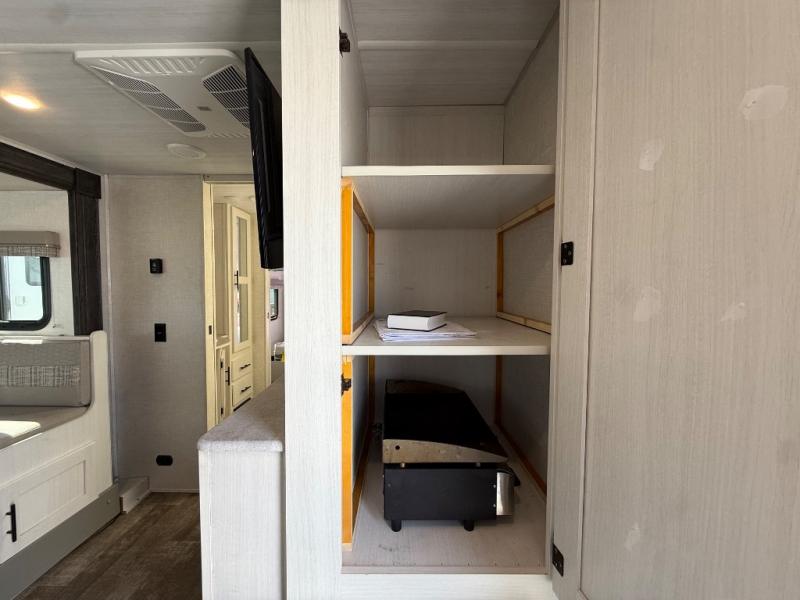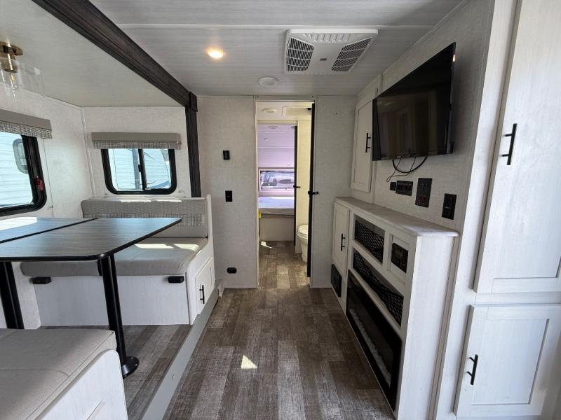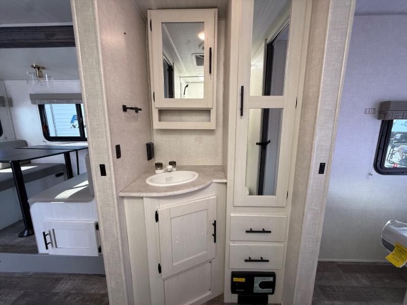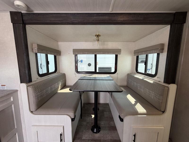 A private bedroom with a walk-around RV queen bed, a walk-through bathroom, and an outside kitchen are a few of the features that you are sure to want in your next RV! You can rest comfortably each night, plus all your clothing can be stored in the dual wardrobes to keep everything tidy. Everyone will stay clean with the full bathroom only steps away, and there is linen storage as well. The main living and kitchen area offers a slide out dinette that can also sleep one more camper. The rear kitchen provides everything you will need, plus the outside kitchen gives you more choices. Step inside to start planning your weekend trip!