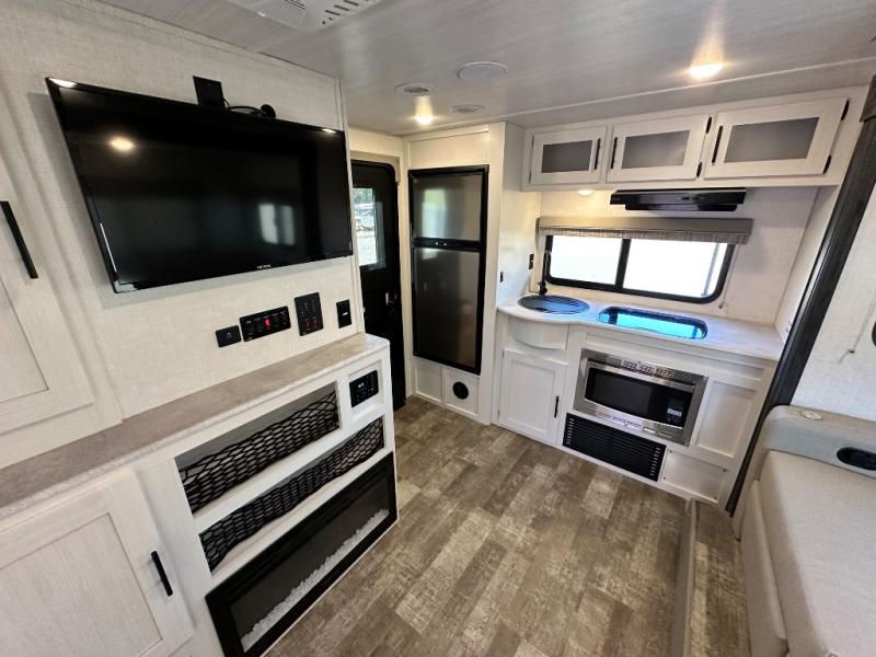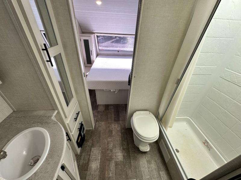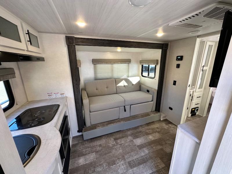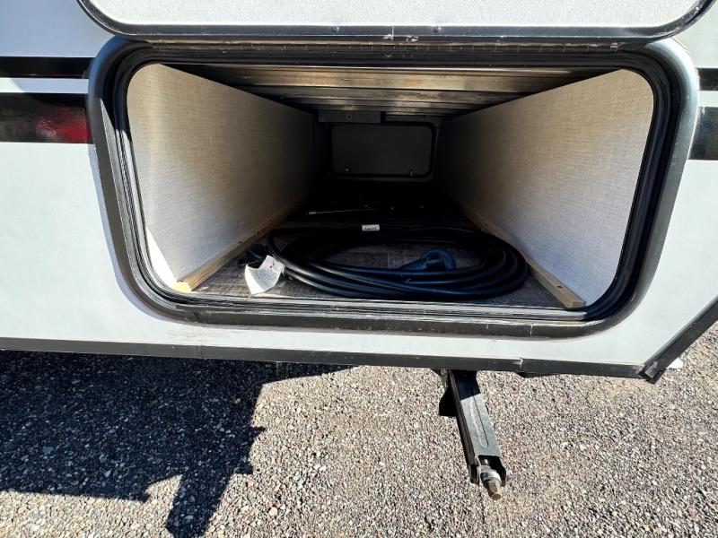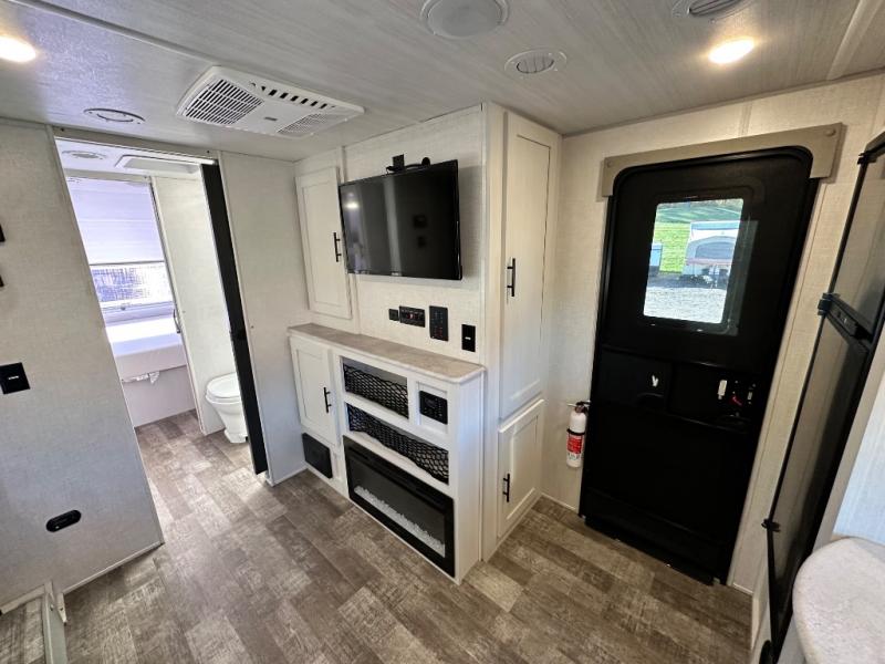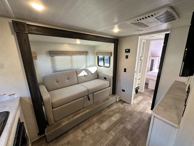 A private bedroom with a walk-around RV queen bed, a walk-through bathroom, and an outside kitchen are a few of the features that you are sure to want in your next RV! You can rest comfortably each night, plus all your clothing can be stored in the dual wardrobes to keep everything tidy. Everyone will stay clean with the full bathroom only steps away, and there is linen storage as well. The main living and kitchen area offers a slide out dinette that can also sleep one more camper. The rear kitchen provides everything you will need, plus the outside kitchen gives you more choices. Step inside to start planning your weekend trip!