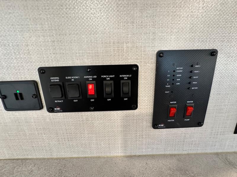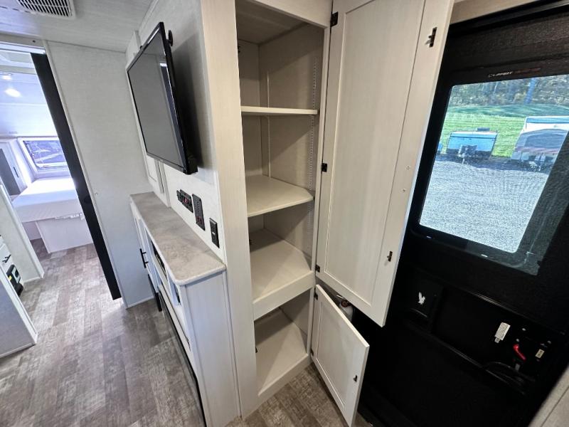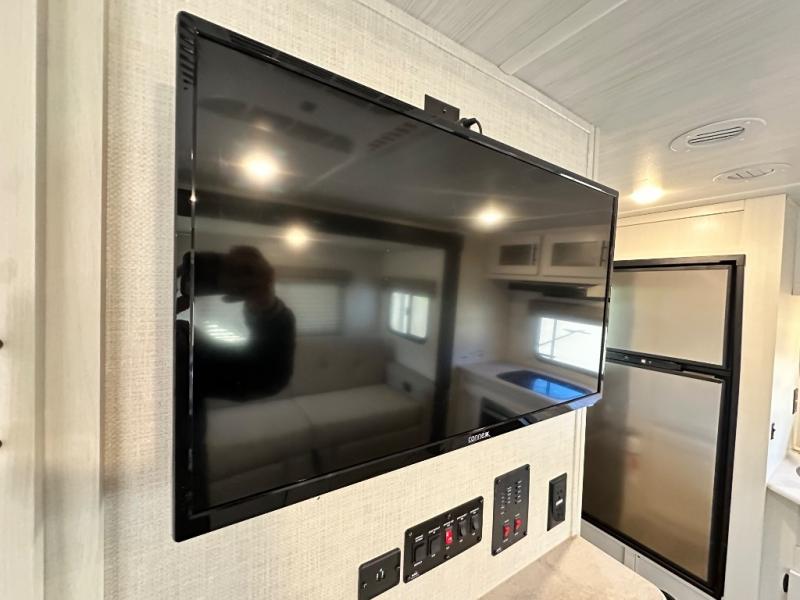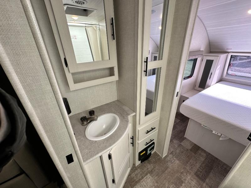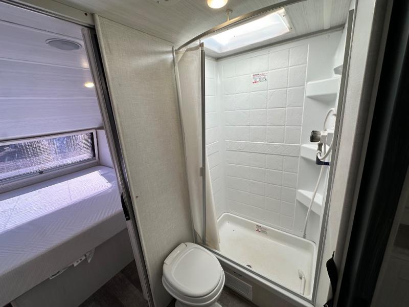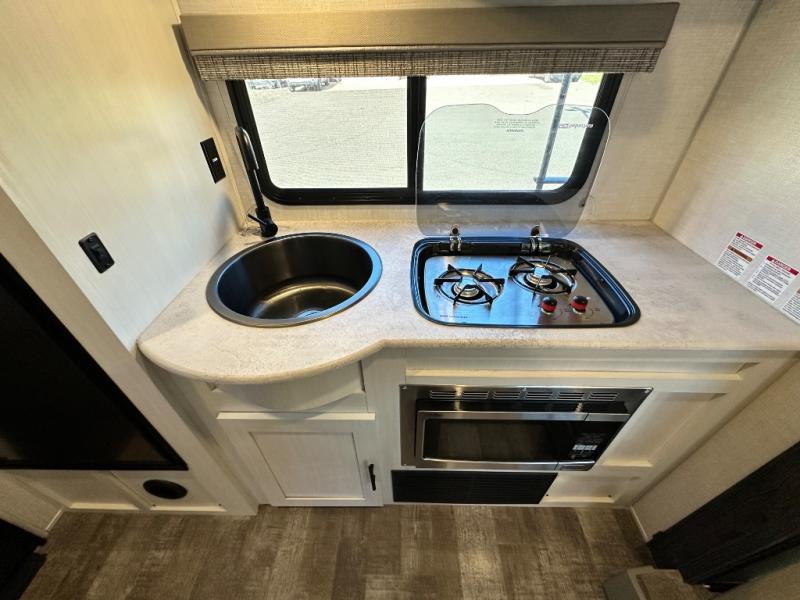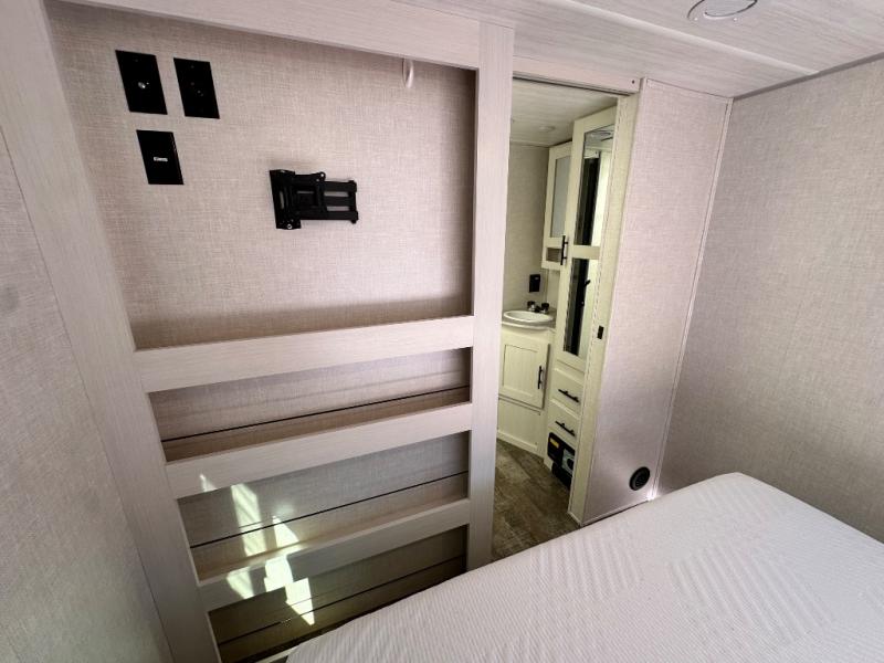 A private bedroom with a walk-around RV queen bed, a walk-through bathroom, and an outside kitchen are a few of the features that you are sure to want in your next RV! You can rest comfortably each night, plus all your clothing can be stored in the dual wardrobes to keep everything tidy. Everyone will stay clean with the full bathroom only steps away, and there is linen storage as well. The main living and kitchen area offers a slide out dinette that can also sleep one more camper. The rear kitchen provides everything you will need, plus the outside kitchen gives you more choices. Step inside to start planning your weekend trip!
