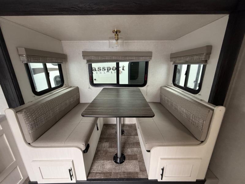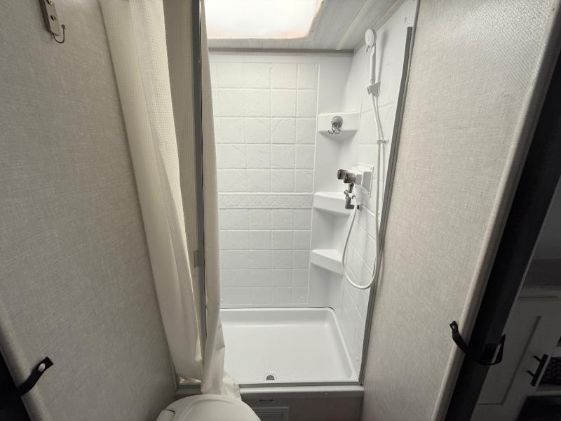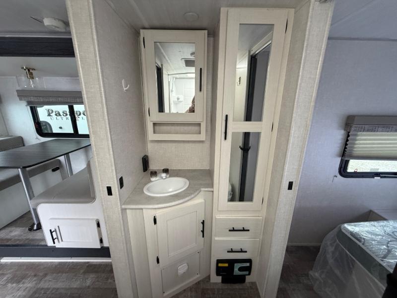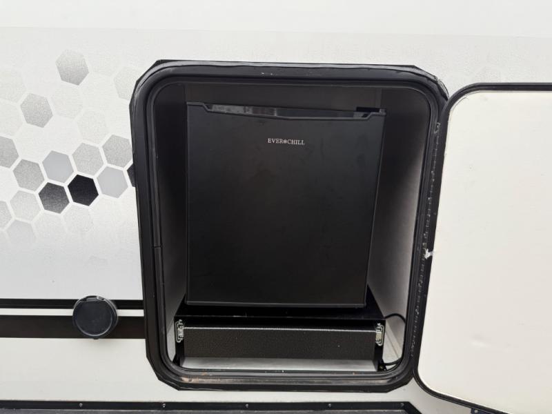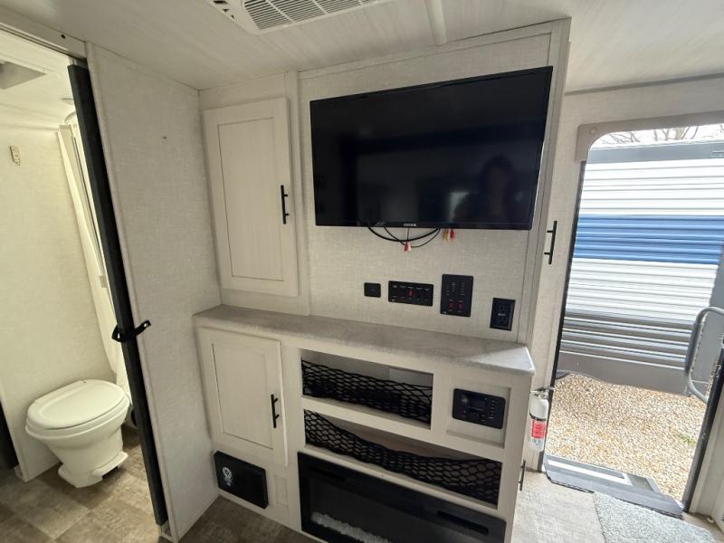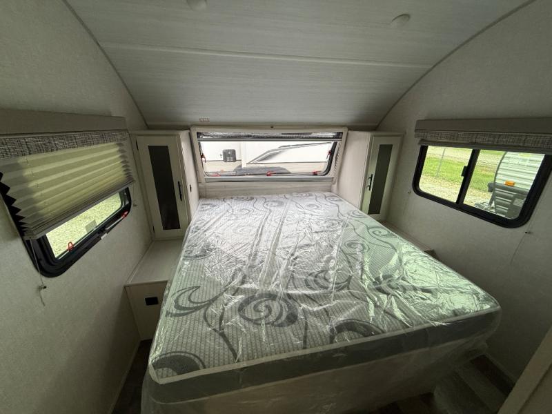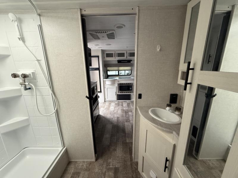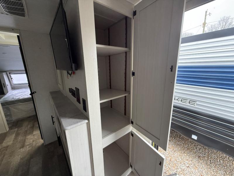 A private bedroom with a walk-around RV queen bed, a walk-through bathroom, and an outside kitchen are a few of the features that you are sure to want in your next RV! You can rest comfortably each night, plus all your clothing can be stored in the dual wardrobes to keep everything tidy. Everyone will stay clean with the full bathroom only steps away, and there is linen storage as well. The main living and kitchen area offers a slide out dinette that can also sleep one more camper. The rear kitchen provides everything you will need, plus the outside kitchen gives you more choices. Step inside to start planning your weekend trip!