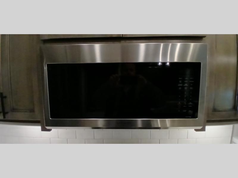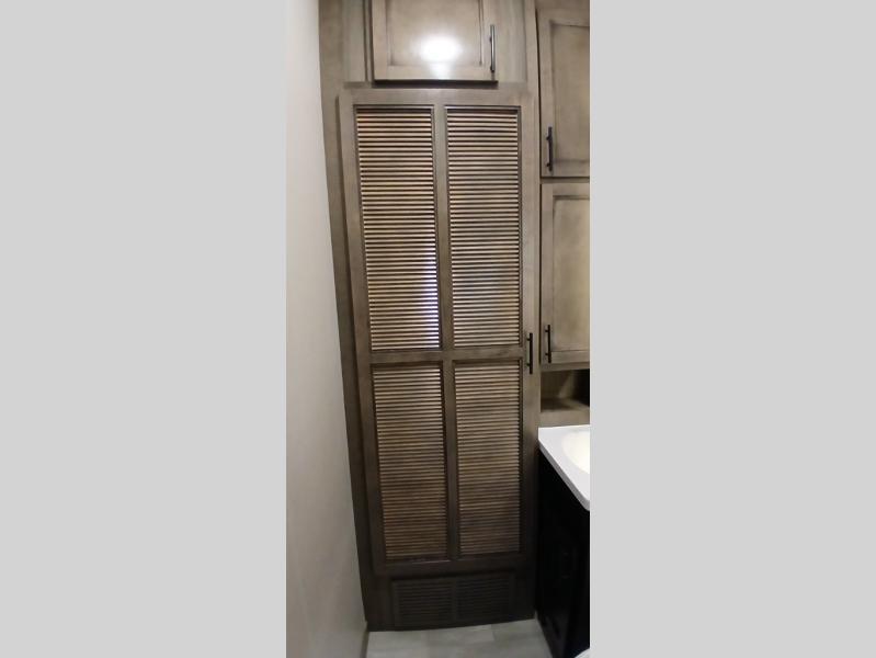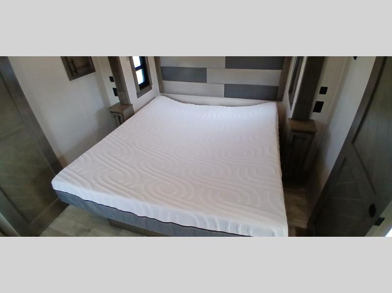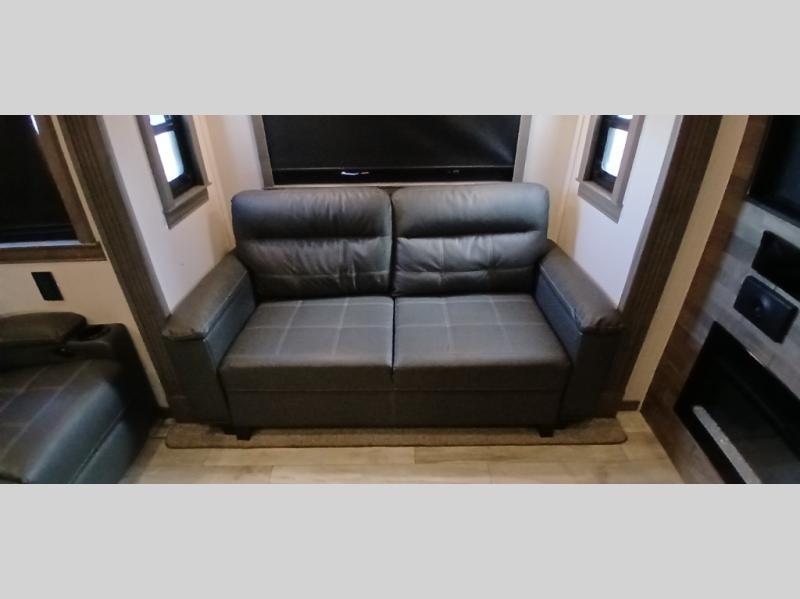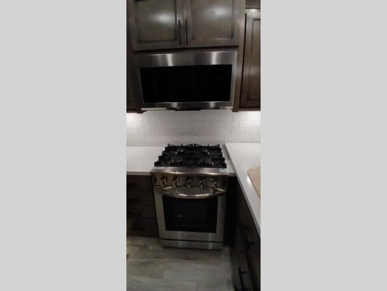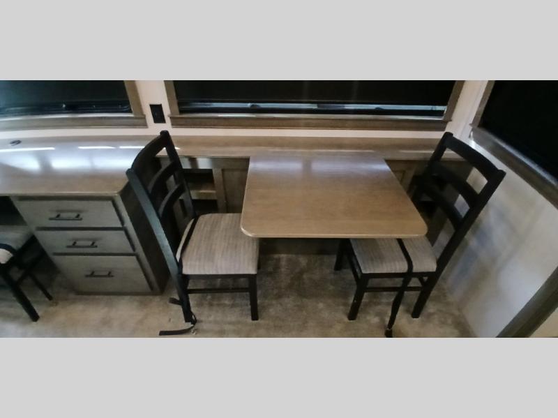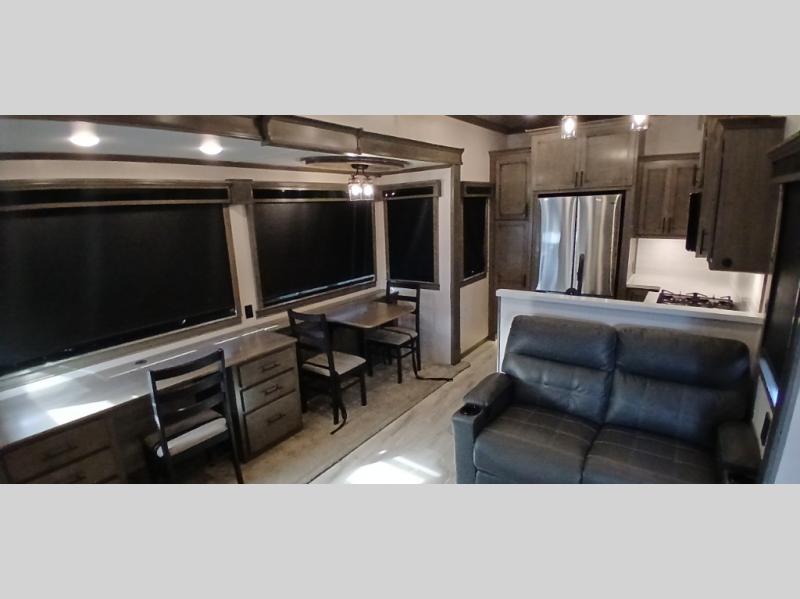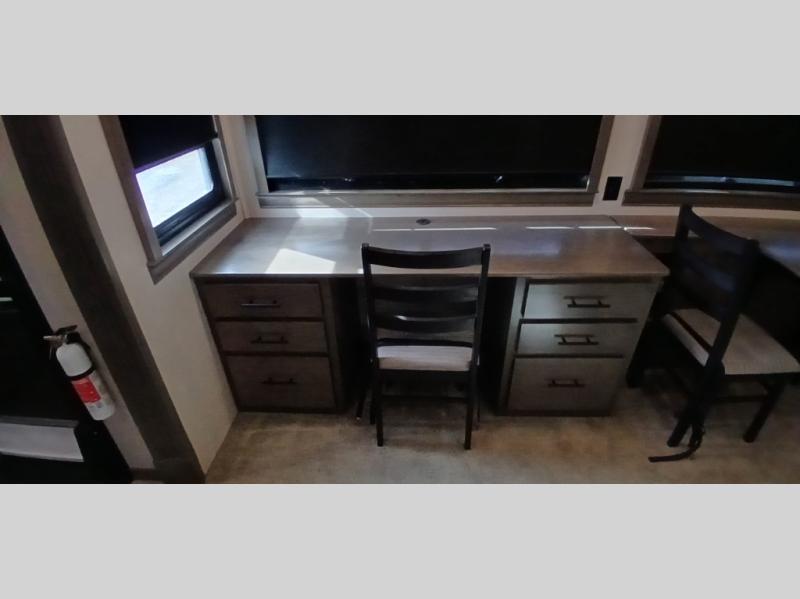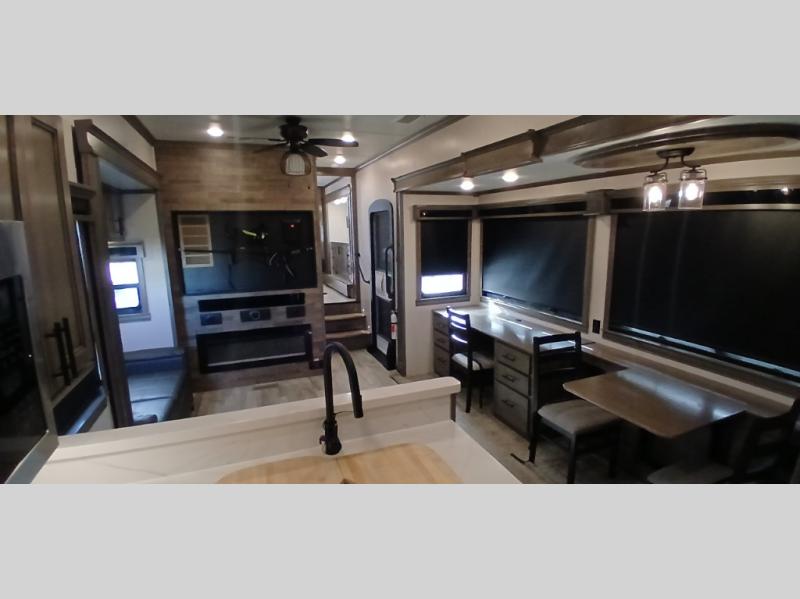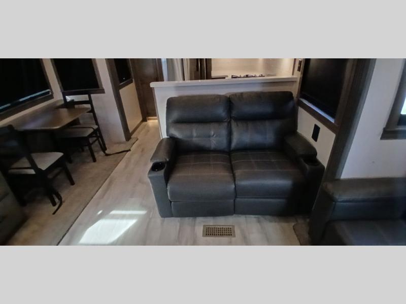 Show your family a good time with this RiverStone fifth wheel! You will get to stay in a super comfortable master suite at the front of this unit which has a dual-sink vanity in the full bathroom. The bedroom offers you a king-size bed that you can rest on while you watch the 40" LED TV across from you, and there is a half bathroom just outside the bedroom for your friends or family to use. If you've decided to bring work with you on the road, you'll be grateful to find a desk in the living area, and the pull-out dinette is a great place to sit down for meals. Work your magic in the kitchen and prepare something delicious on the four-burner range for everyone to eat.