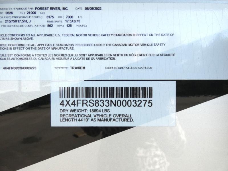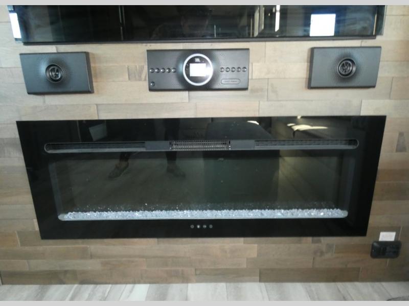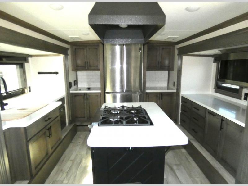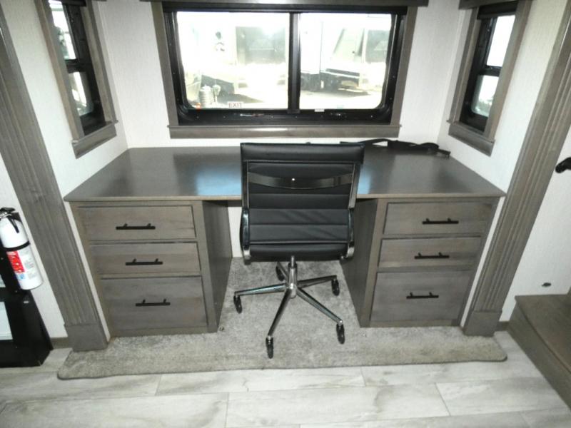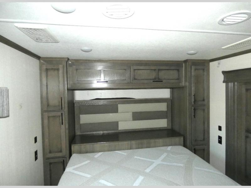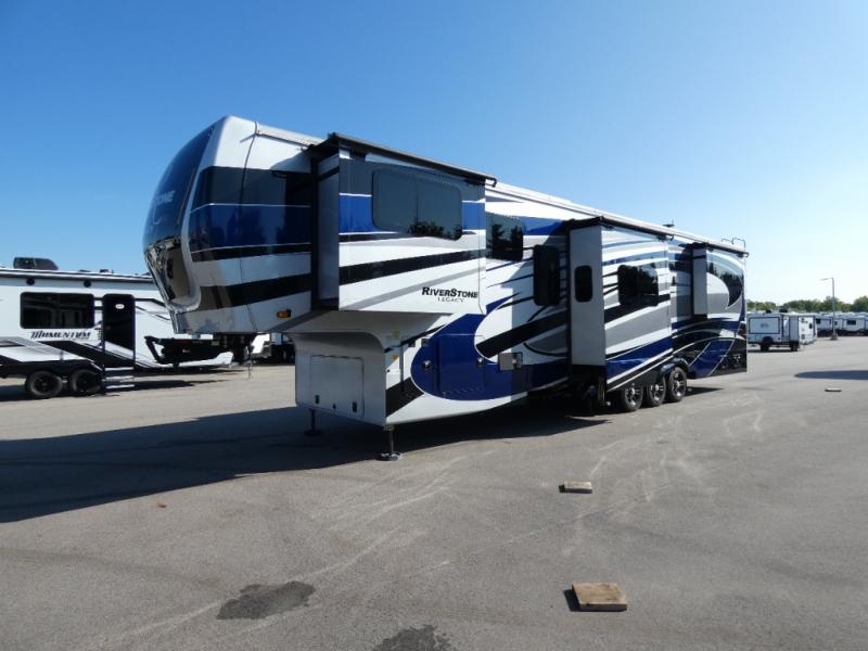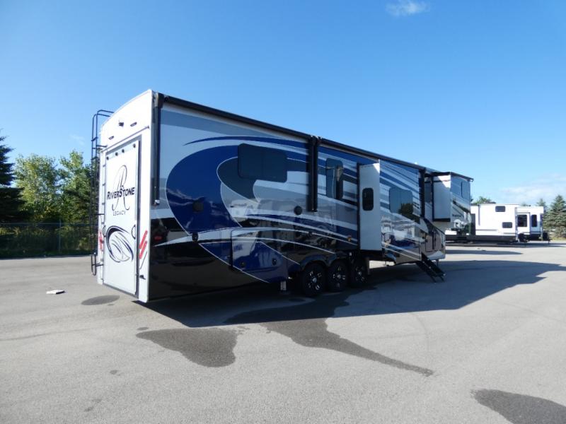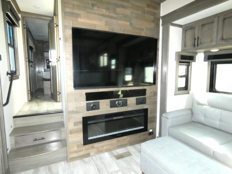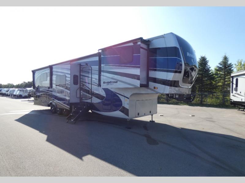 With any RiverStone fifth wheel by Forest River, you will appreciate the automatic six-point hydraulic level-up system, the on-demand water heater, and the full exterior docking station to make your camping experience easier than ever. The Dexter EZ flex suspension system will provide a smooth ride on the way to the campground, and the MORryde Step Above entry steps make your coming and going easier than ever. Inside, you'll enjoy beautiful stained hardwood cabinetry and stiles throughout for a more at-home feel, a 10"-thick memory foam mattress for your comfort, plus convenient under-bed storage for your luggage, board games, and extra blankets. These models also include two 15,000 BTU high-performance quiet-cool A/Cs, a 40,000 BTU furnace, and a 5,200 BTU fireplace that will provide you with complete comfort no matter what season you're in!