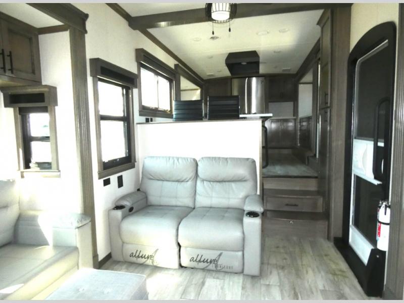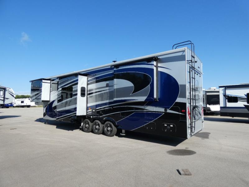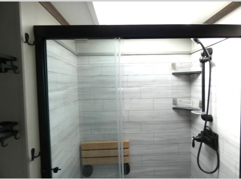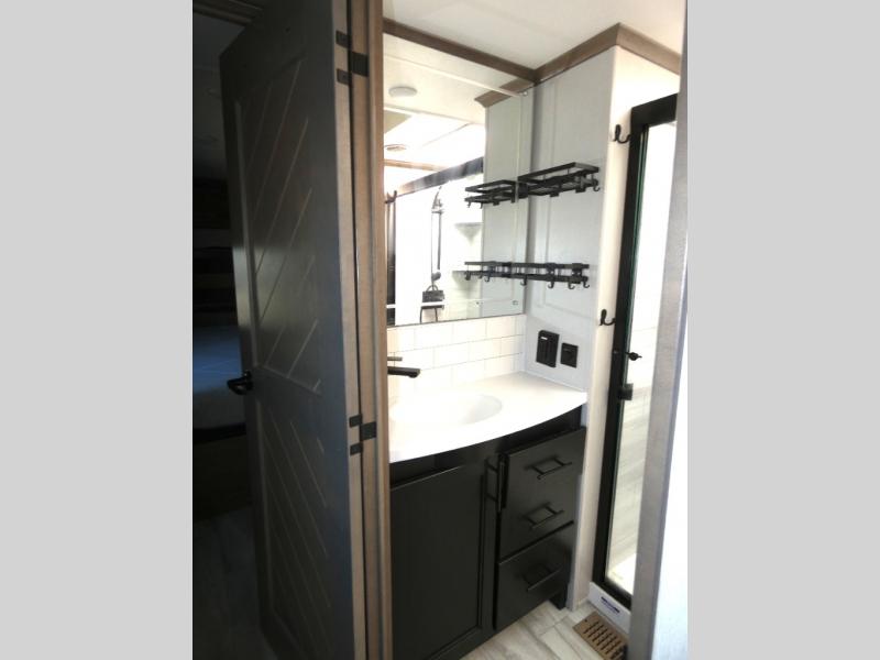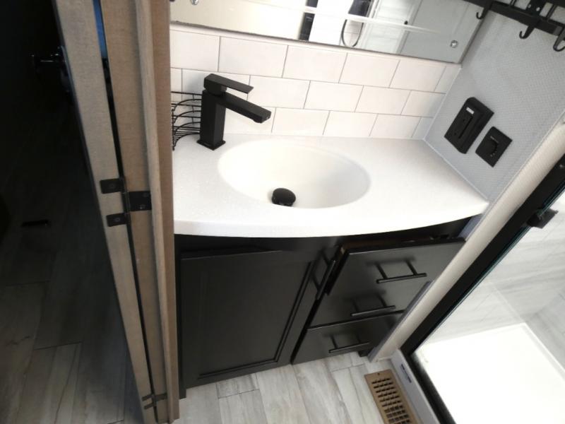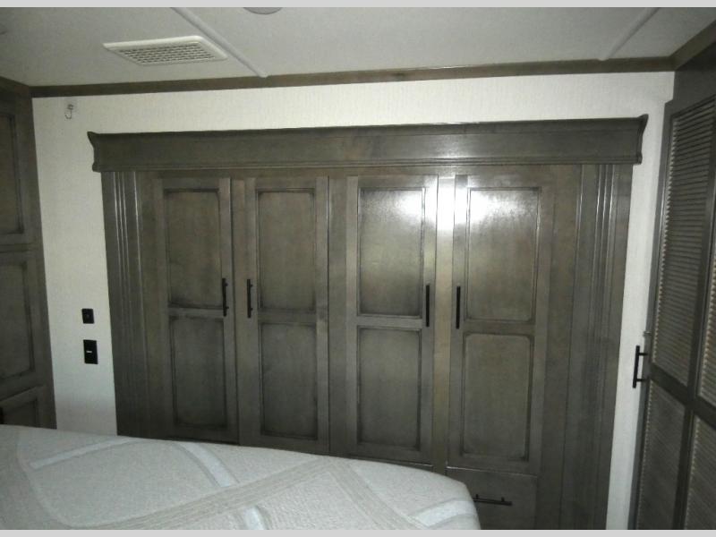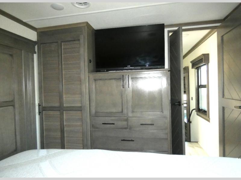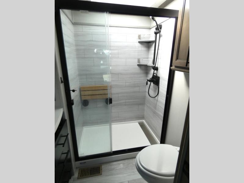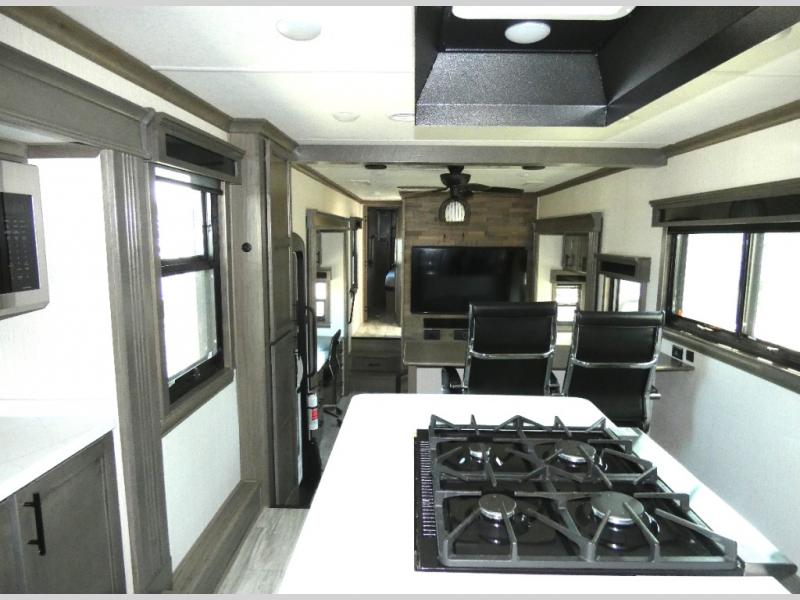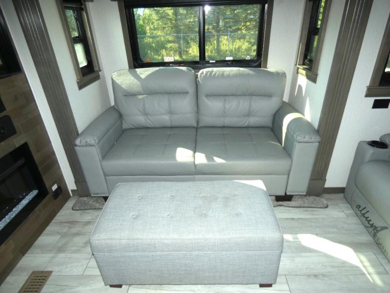 With any RiverStone fifth wheel by Forest River, you will appreciate the automatic six-point hydraulic level-up system, the on-demand water heater, and the full exterior docking station to make your camping experience easier than ever. The Dexter EZ flex suspension system will provide a smooth ride on the way to the campground, and the MORryde Step Above entry steps make your coming and going easier than ever. Inside, you'll enjoy beautiful stained hardwood cabinetry and stiles throughout for a more at-home feel, a 10"-thick memory foam mattress for your comfort, plus convenient under-bed storage for your luggage, board games, and extra blankets. These models also include two 15,000 BTU high-performance quiet-cool A/Cs, a 40,000 BTU furnace, and a 5,200 BTU fireplace that will provide you with complete comfort no matter what season you're in!