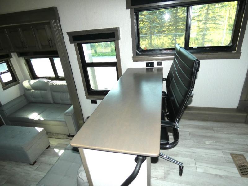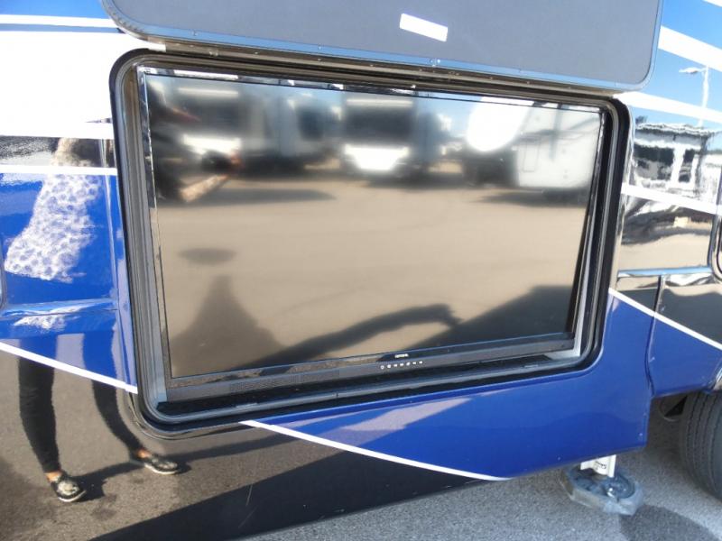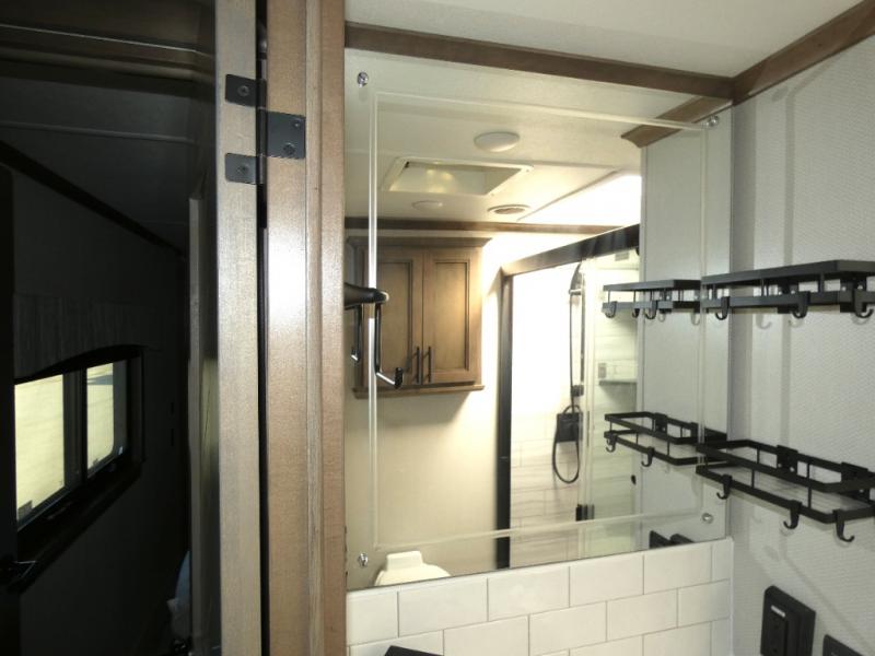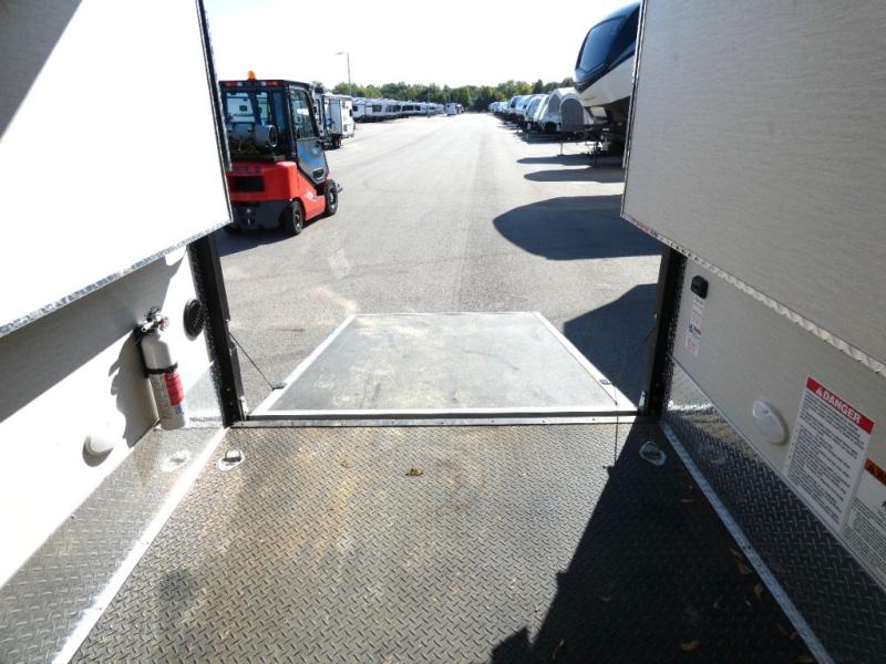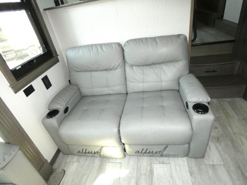 It has never been easier to bring along your favorite ride-on toys than in this RiverStone toy hauler fifth wheel! The below-floor garage allows you to easily store your four-wheeler without having the oil and gas odor throughout your living space, and the Zero Gravity ramp door makes unloading a breeze. Once you return from a trail ride, get cleaned up in the full bath that includes a shower with a seat for your comfort, and then head to the middle living area to relax on the theater seats. There is also a hide-a-bed sofa and a desk that will allow the kids to color if they want, and the 65" TV with a fireplace will make for a cozy evening indoors. The chef of the family will love cooking on the four-burner cooktop on the large kitchen island, plus there is tons of counter space, a dishwasher, and a pantry!