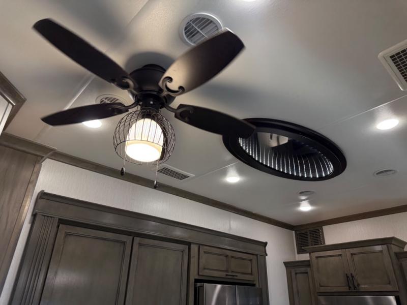 This RiverStone fifth wheel has an amazing man cave in the back! This area is not only an excellent lounging space with its theater sofa, hide-a-bed sofa, and 40" LED TV, but it is also a comfortable guest suite because it contains its own half bathroom and a drop-down been bed. Each section of this unit has opposing slides, so you'll have plenty of living space, and the kitchen area has a pull-out dinette so that you can sit down with hot meals each night. You have a large pantry for snacks and an 18-cubic foot French door refrigerator with ice maker for cold beverages. The ceiling fan allows you to cool off the interior without overworking the AC, and the central vacuum system will help you clean up messes.