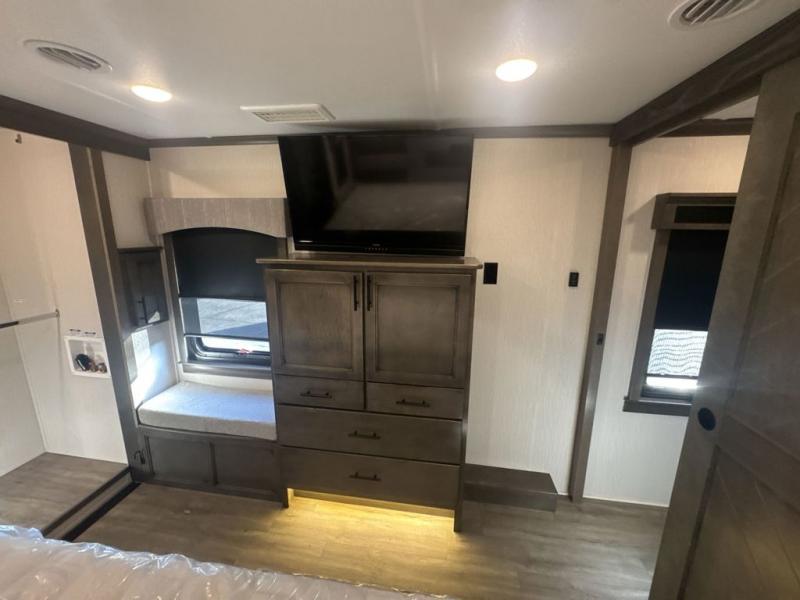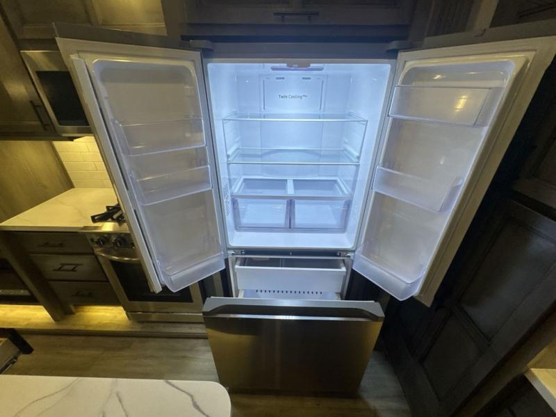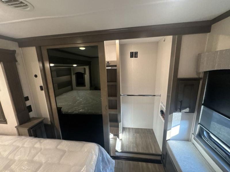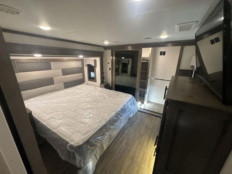 This RiverStone Reserve Series fifth wheel features a front private bedroom with all of the best amenities, like a king bed slide for extra space, an under-bed storage compartment for holding your extra sweaters, a large mirrored wardrobe with preparations for a washer/dryer, a 40" LED TV on top of a dresser, and a bench to sit down and tie your shoes. The full bathroom is centrally located for everyone to easily use, and it contains everything you need to get clean. The kitchen has space because of the opposing slides, and you can work around the kitchen island when preparing meals. The entertainment center offers you a 55" Samsung LED Smart TV above a fireplace, so you can have comfortable evenings while watching your favorite shows.