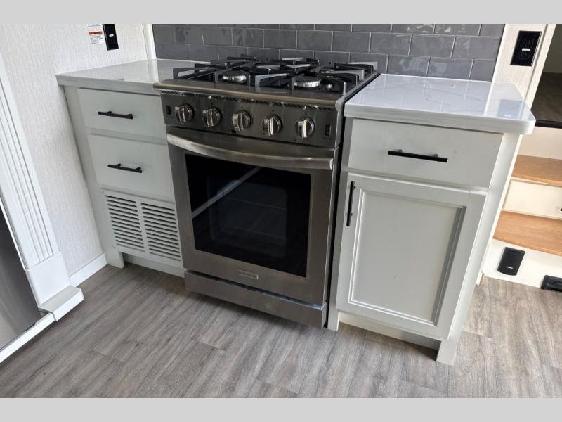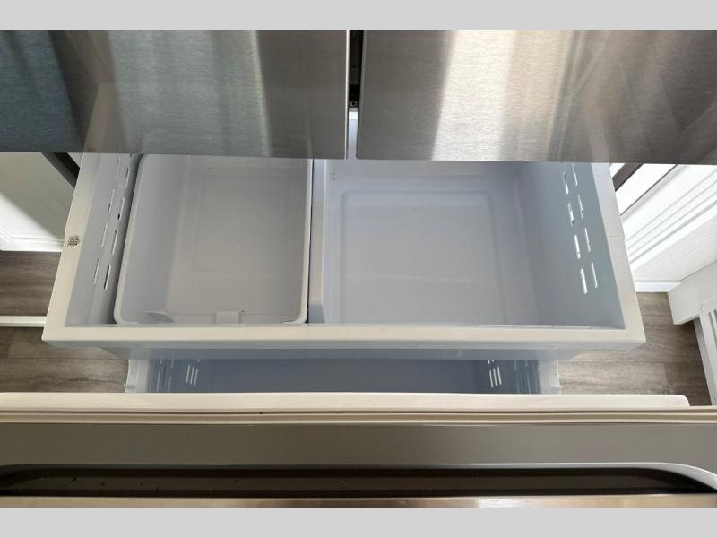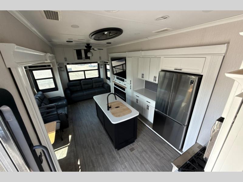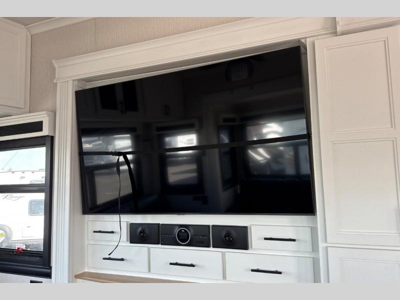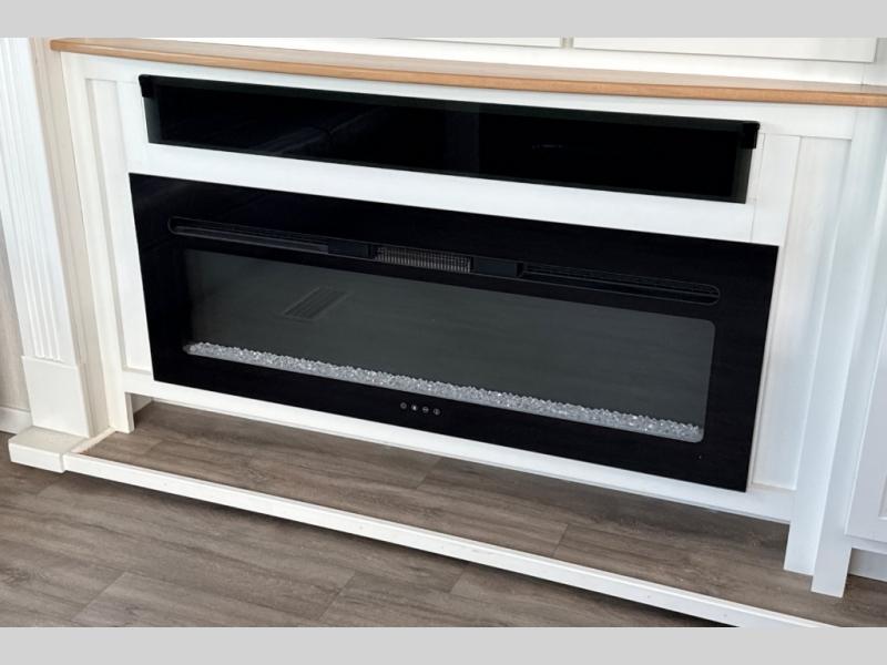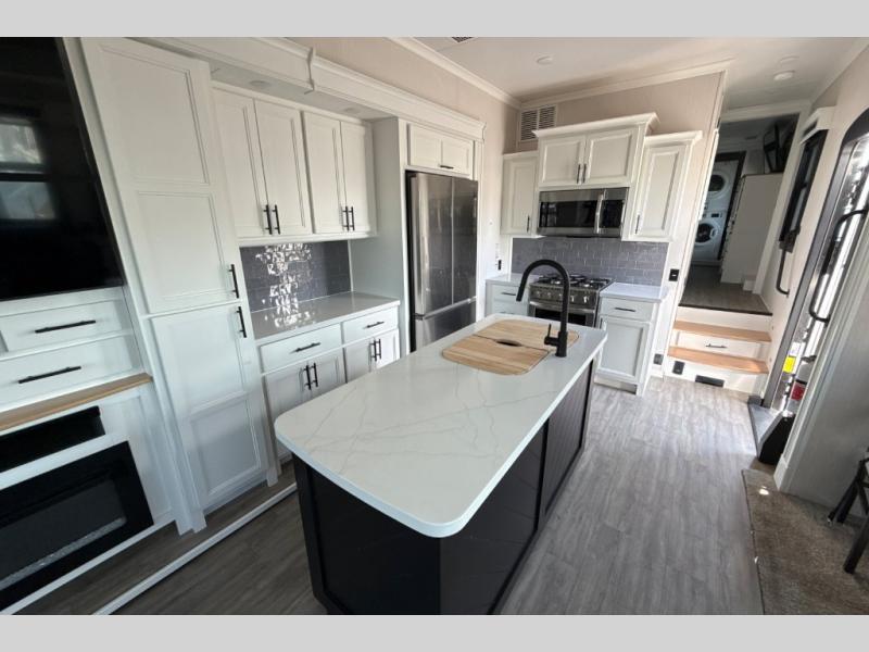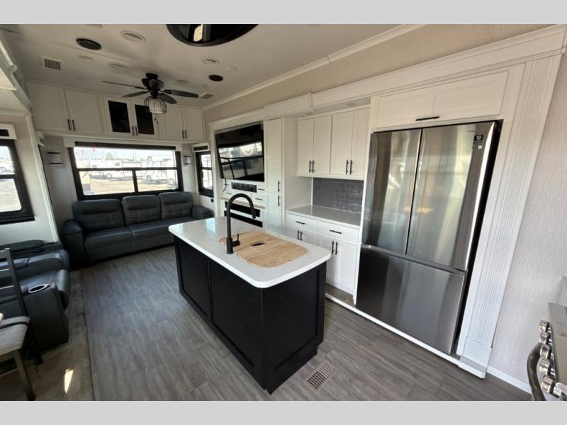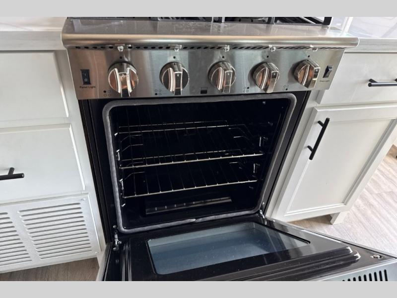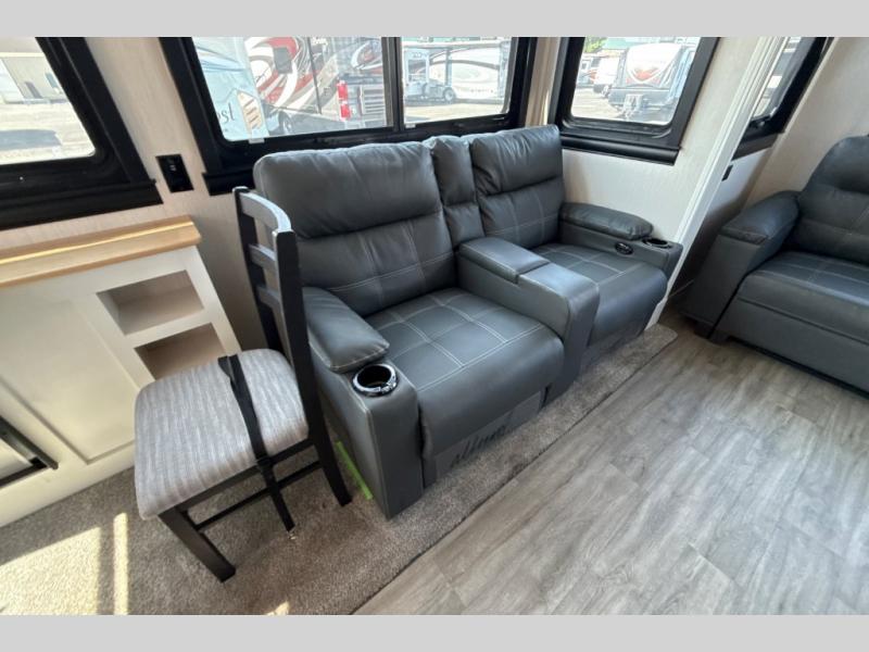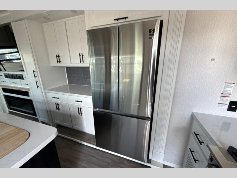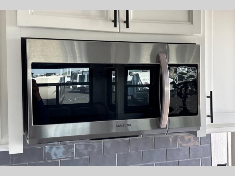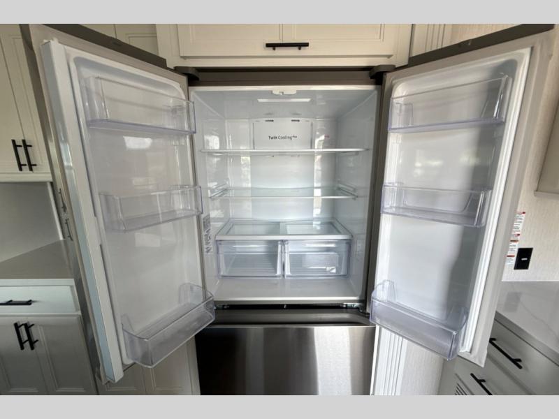 Get out of town in style with this RiverStone Reserve Series fifth wheel! You can relax comfortably on the 90" hide-a-bed sofa and the theater sofa while you watch the 55" Samsung LED Smart TV above the fireplace. You will be right next to the chef who is fervently working on dinner in the kitchen, and the four-burner range will help them get done quickly. The 18-cubic foot French door refrigerator with ice maker will be quite useful for storing plenty of goodies, and the bathroom has a linen closet so that you can store your towels.