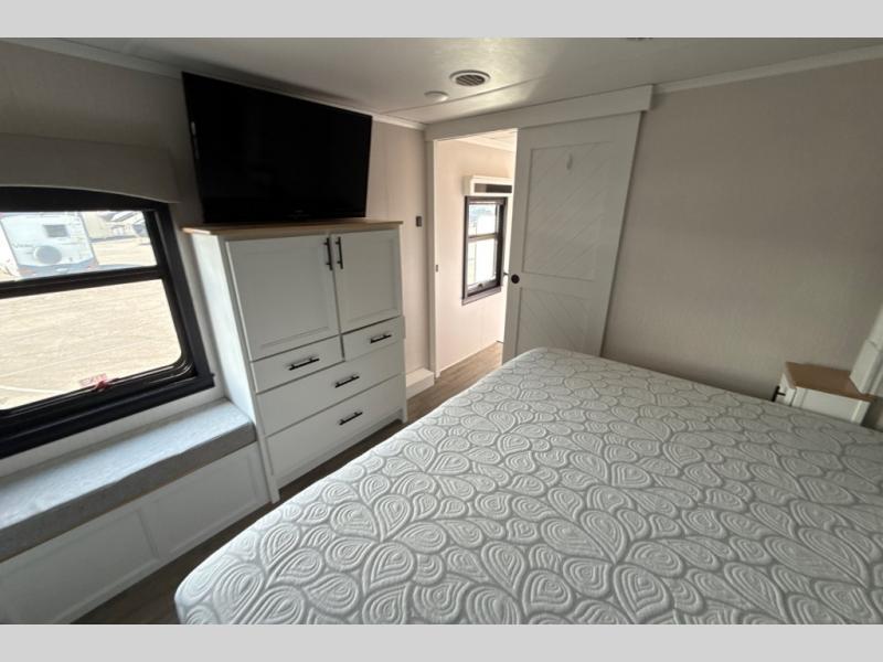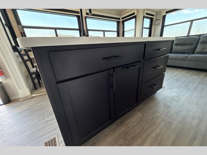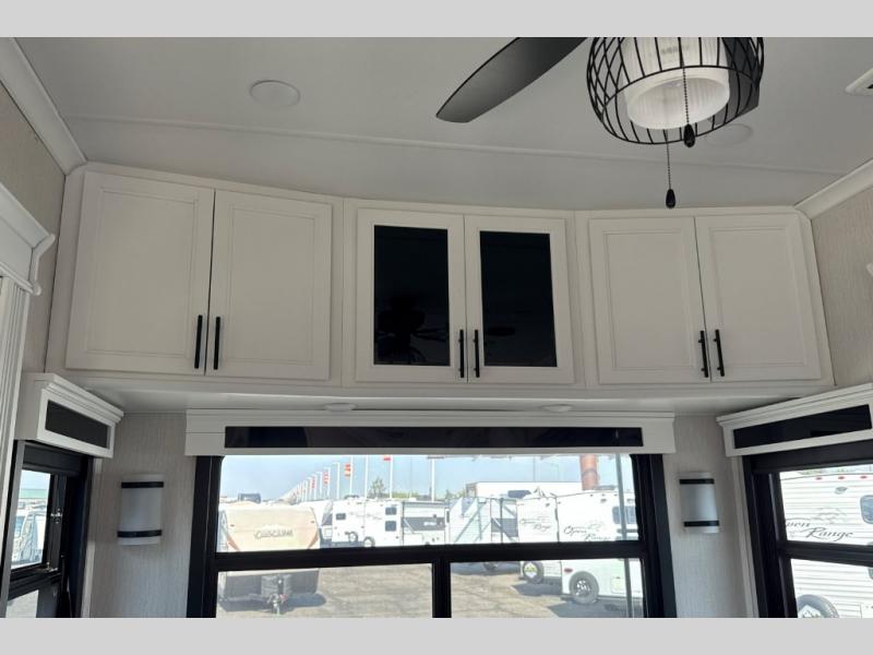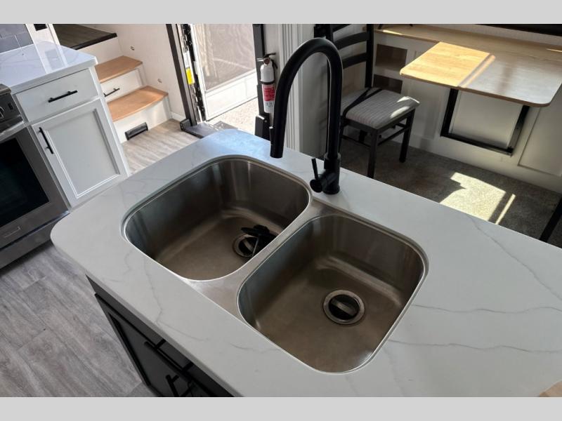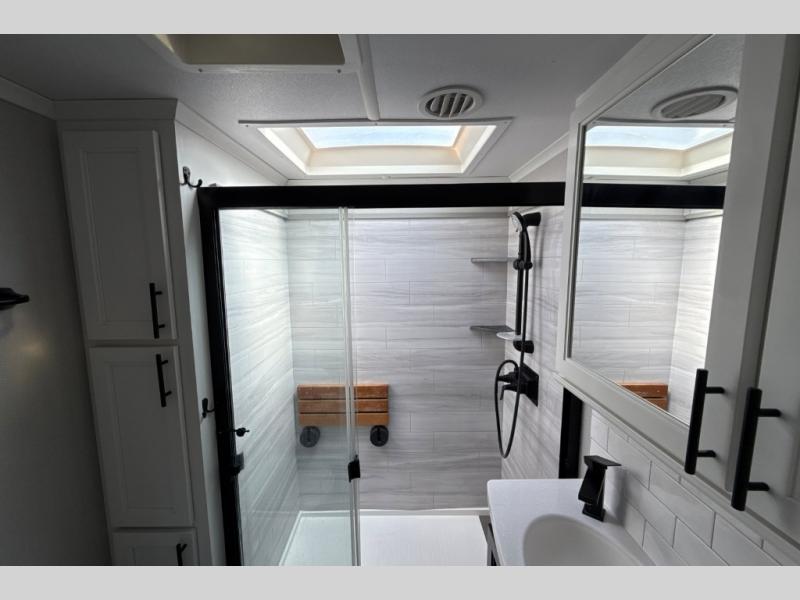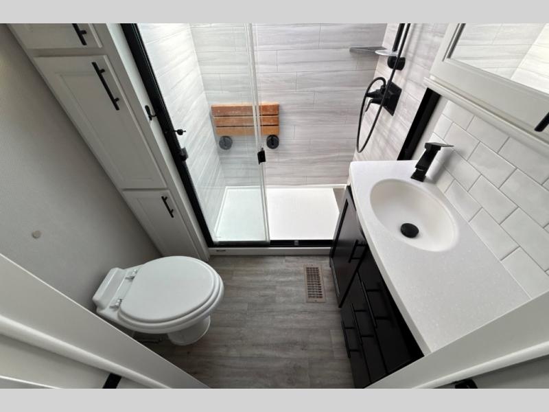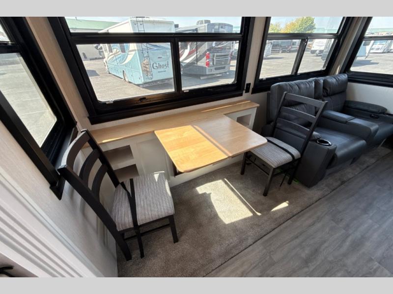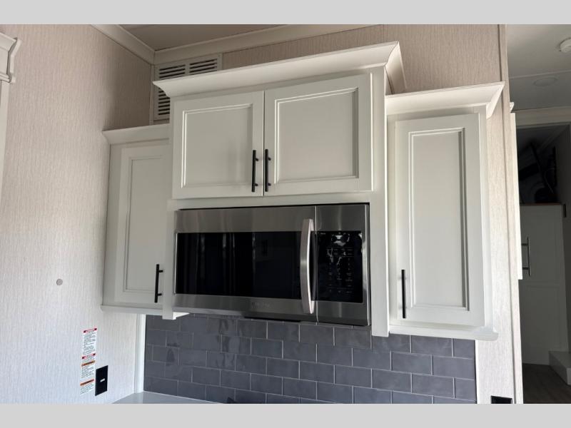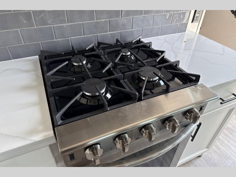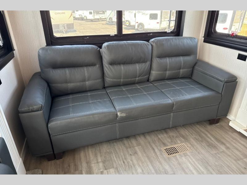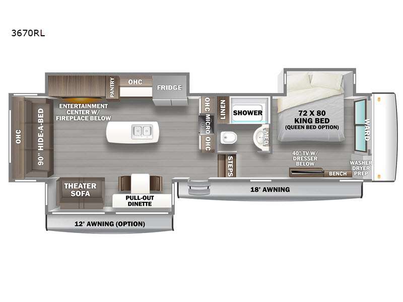 Get out of town in style with this RiverStone Reserve Series fifth wheel! You can relax comfortably on the 90" hide-a-bed sofa and the theater sofa while you watch the 55" Samsung LED Smart TV above the fireplace. You will be right next to the chef who is fervently working on dinner in the kitchen, and the four-burner range will help them get done quickly. The 18-cubic foot French door refrigerator with ice maker will be quite useful for storing plenty of goodies, and the bathroom has a linen closet so that you can store your towels.