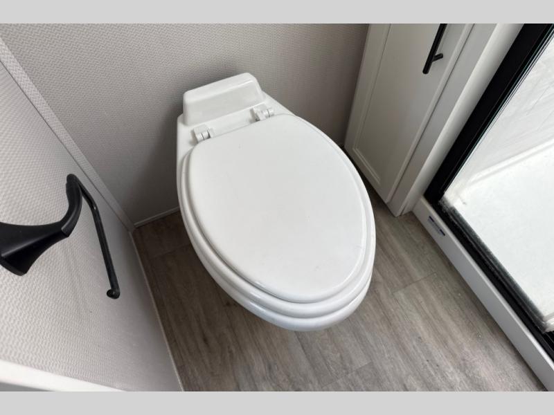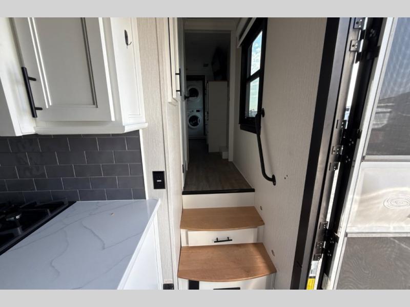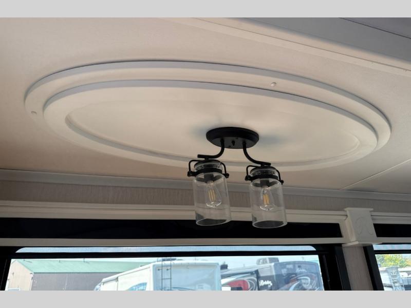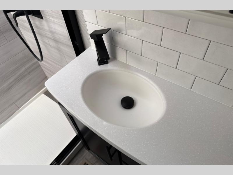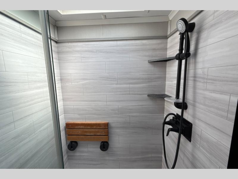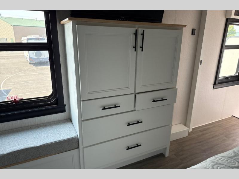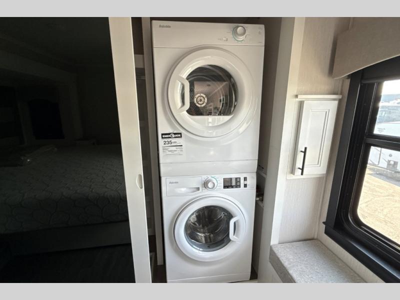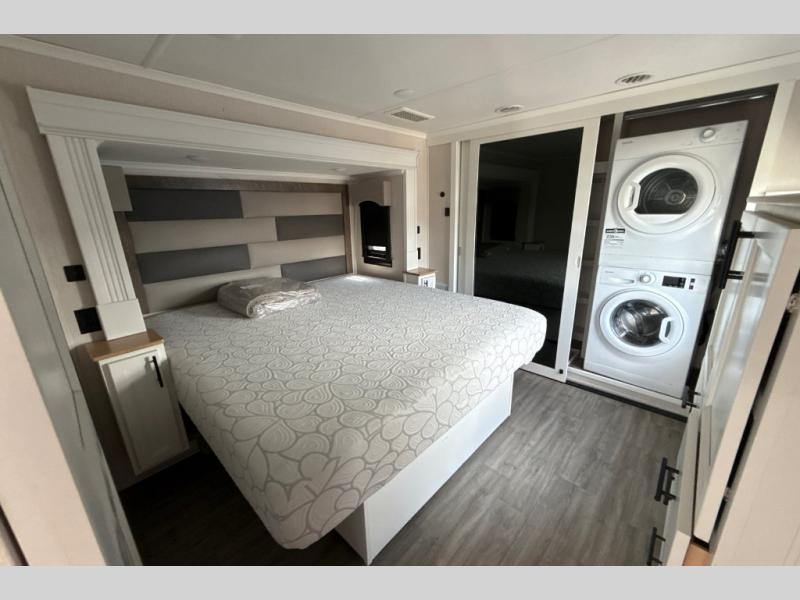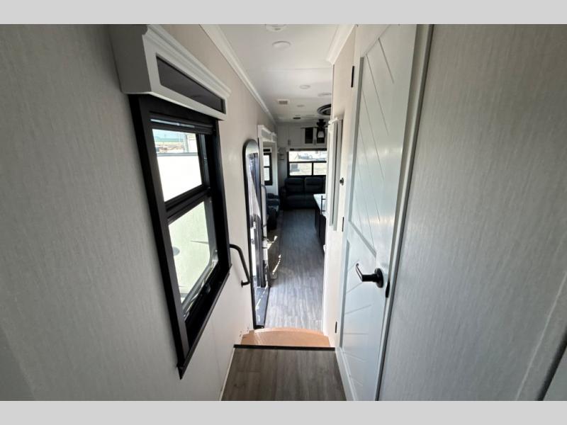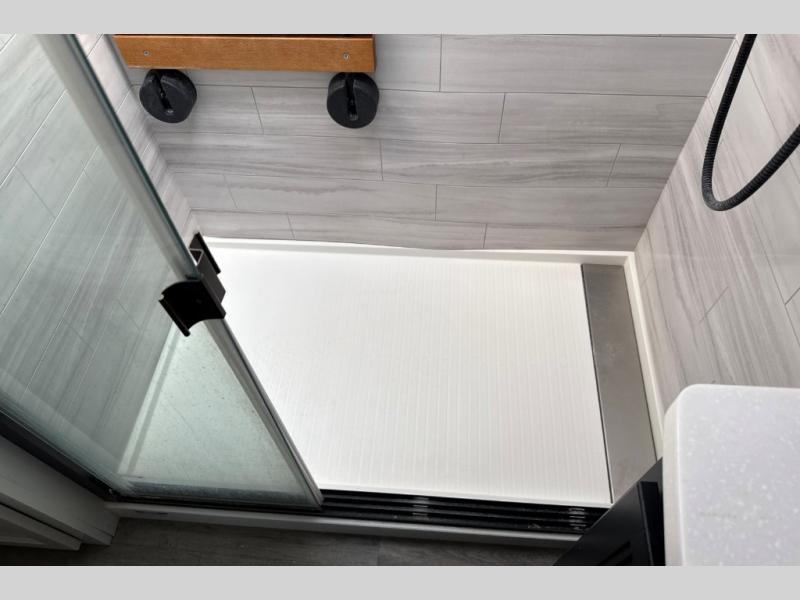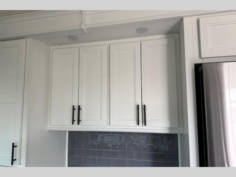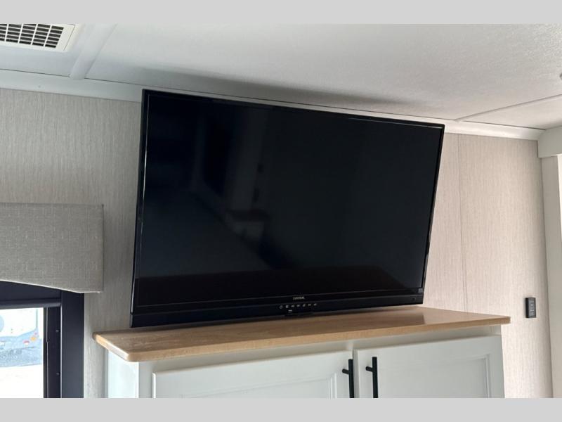 Get out of town in style with this RiverStone Reserve Series fifth wheel! You can relax comfortably on the 90" hide-a-bed sofa and the theater sofa while you watch the 55" Samsung LED Smart TV above the fireplace. You will be right next to the chef who is fervently working on dinner in the kitchen, and the four-burner range will help them get done quickly. The 18-cubic foot French door refrigerator with ice maker will be quite useful for storing plenty of goodies, and the bathroom has a linen closet so that you can store your towels.