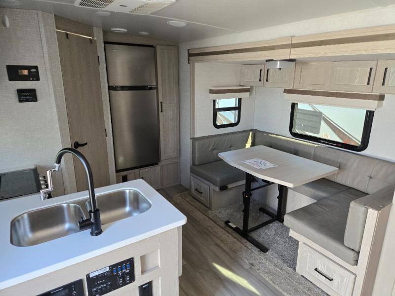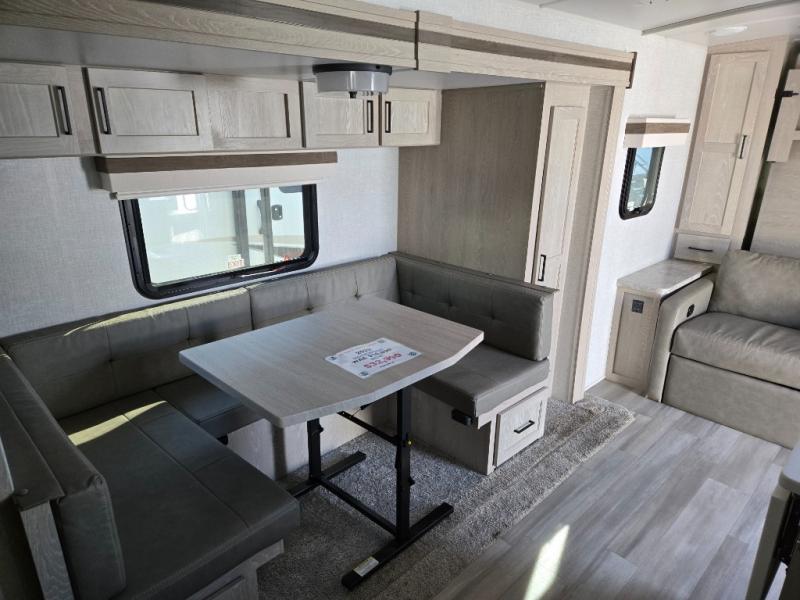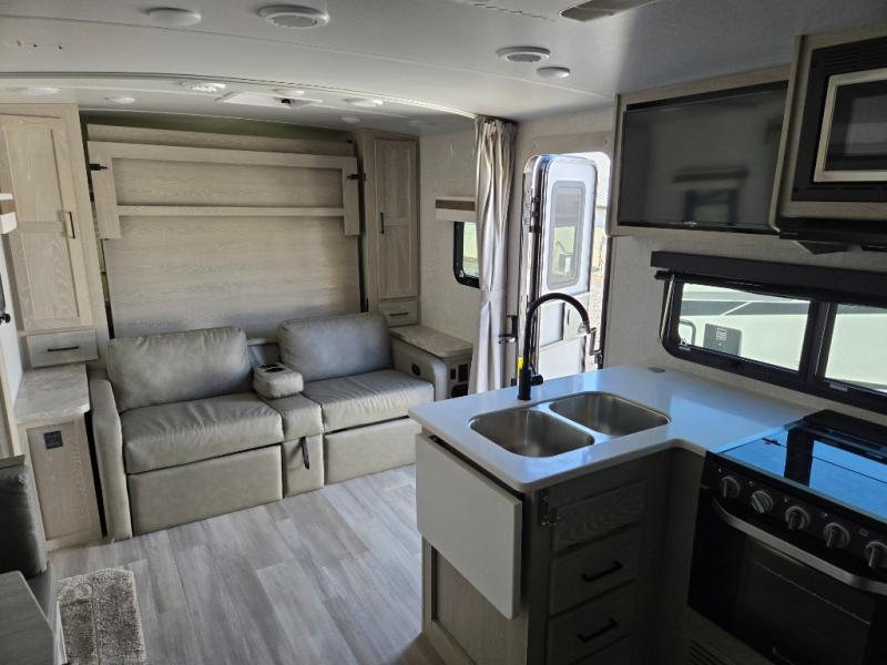 Versatile, cozy, and spacious are just a few ways to describe this travel trailer! Once you arrive at the campsite, unload your gear from the pass-through storage and additional exterior storage, then set up the 15' power awning with LED lights. You may want to visit in your camp chairs, or head inside to prepare lunch on the three burner cooktop. There is a U-shaped dinette within the slide out, plus a wardrobe here for jackets or your guests' clothes. You will also find the 72" sofa is a comfy spot to relax, and at night, you can fold down the RV queen-size Murphy bed!