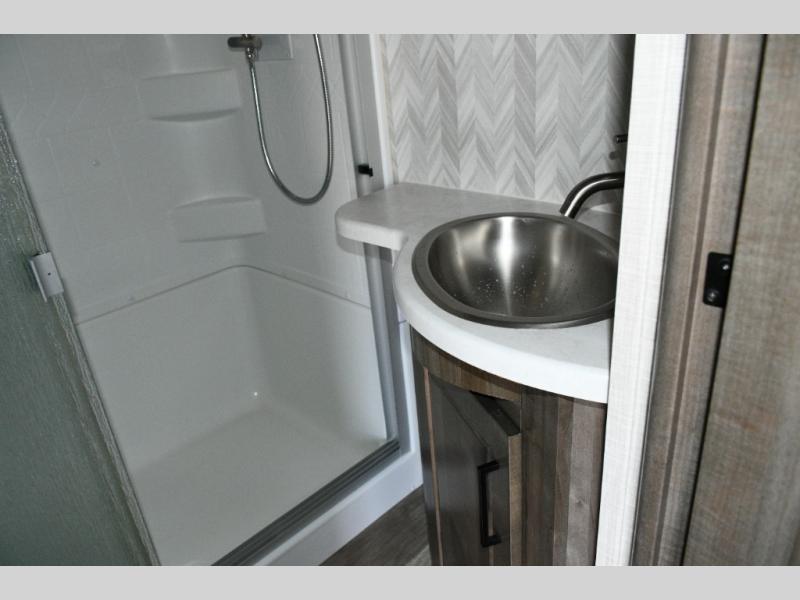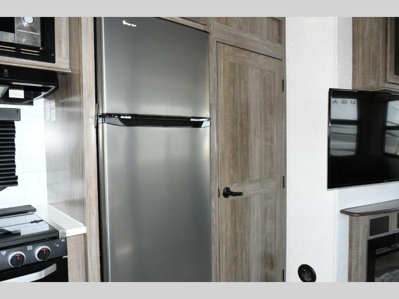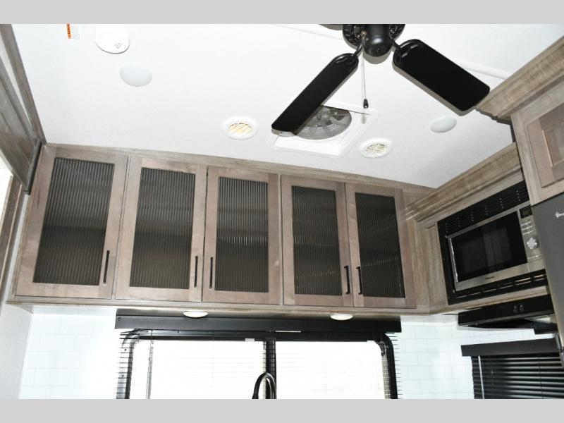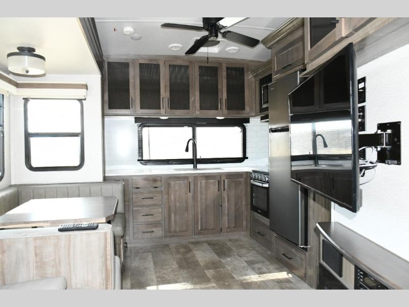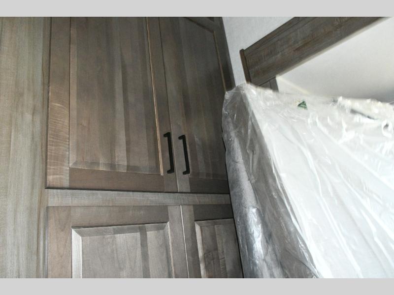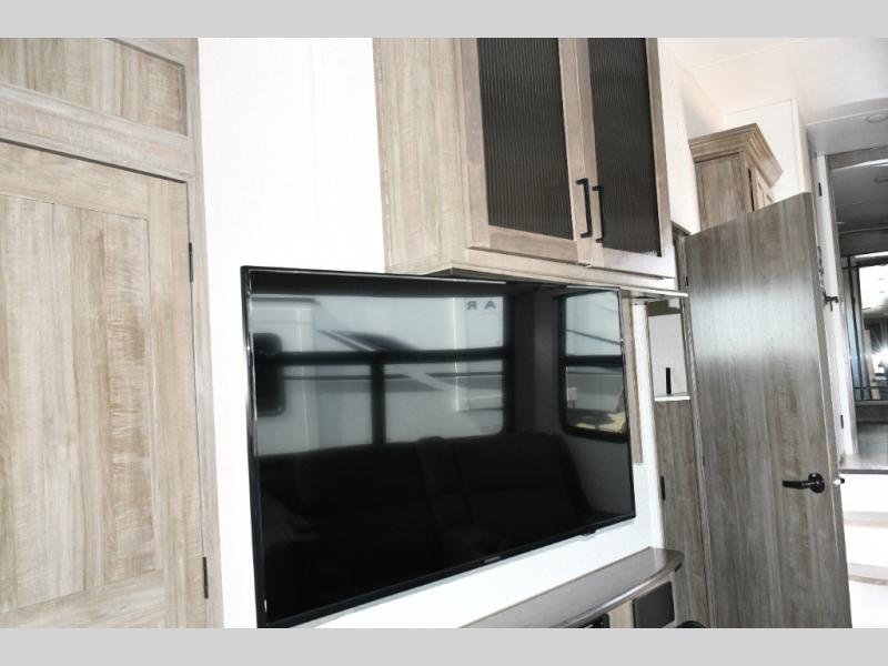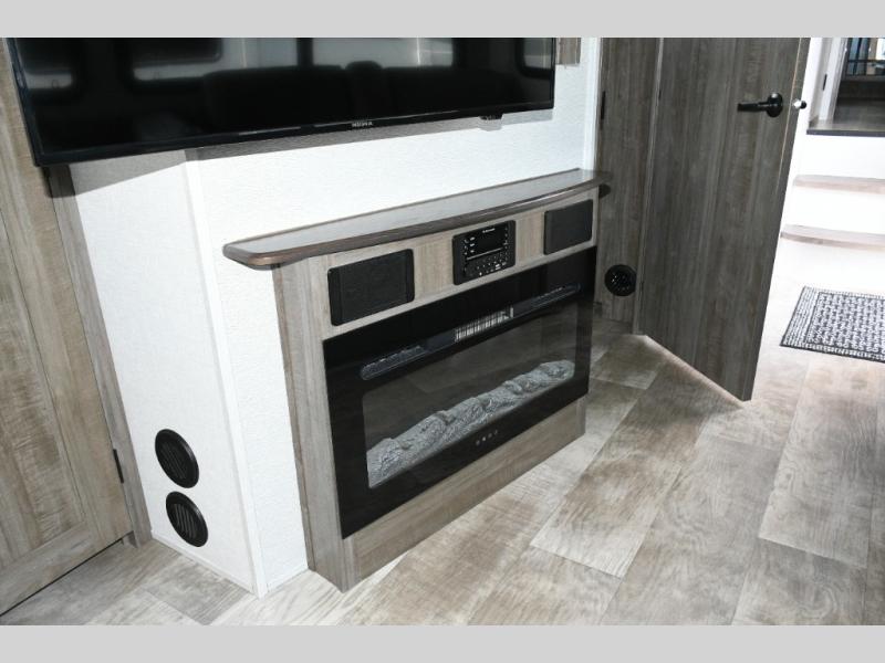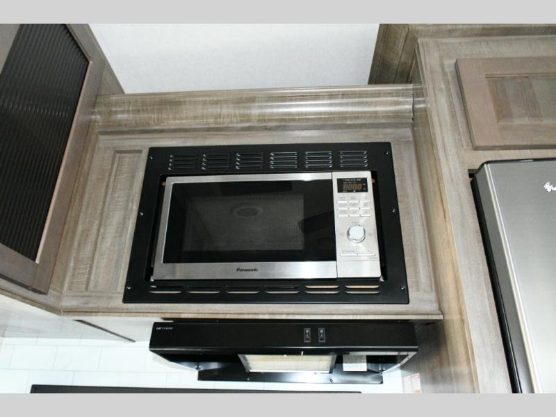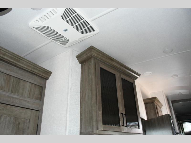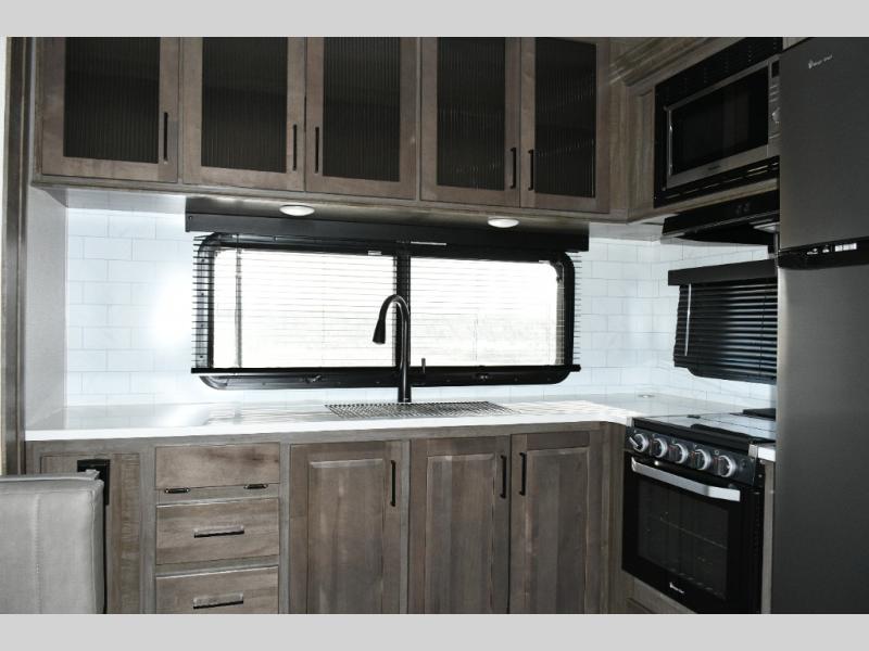 Inside, you’ll appreciate solid wood cabinet doors and drawers, hidden hinges, metal drawer glides, solid surface countertops, designer backsplash, and the OneControl panel with WeRV app capability for managing key systems with ease.