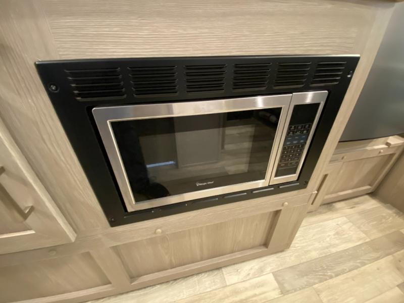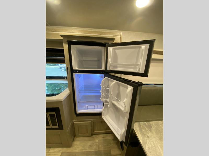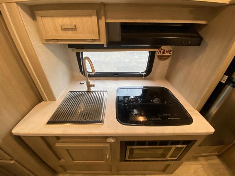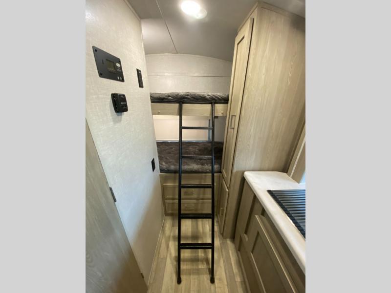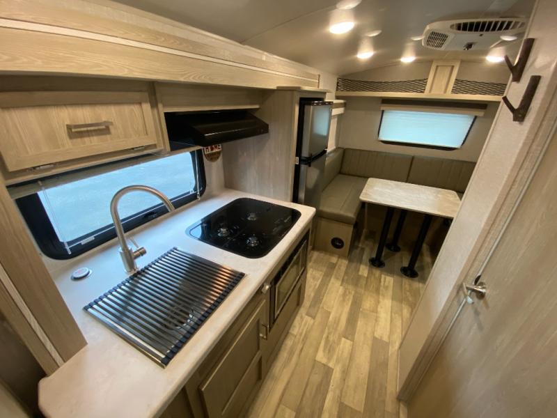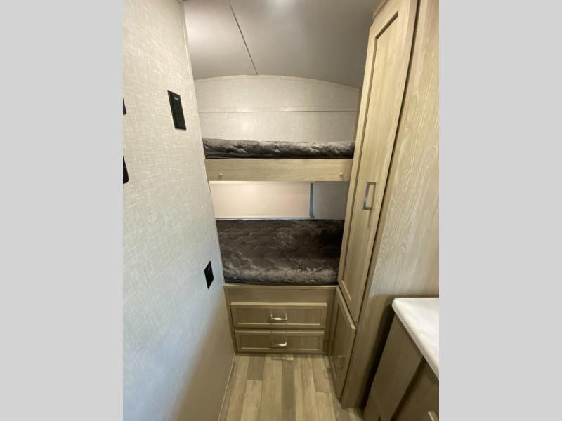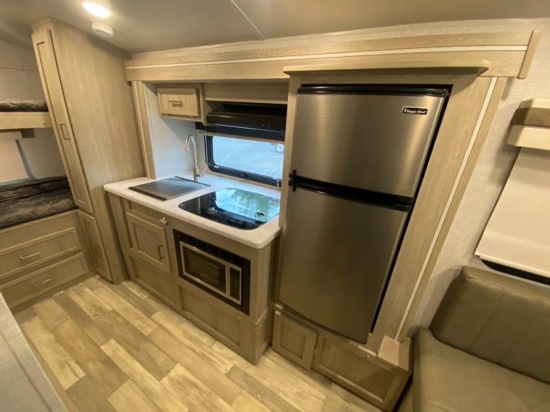 This travel trailer with bunk beds will be perfect for family camping or weekend trips to the lake with friends. There is a U-shaped dinette up front that can convert to a 54" x 82" bed and plenty of overhead compartments for your belongings. The chef of your group can prepare meals on the three burner cooktop within the slide out, and there is a wardrobe by the bunks for extra storage. This model also includes a full bath with a foot flush toilet, a Shower Miser Water Saver, and a Maxxair ventilation fan to keep everything fresh.