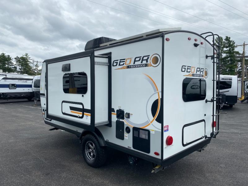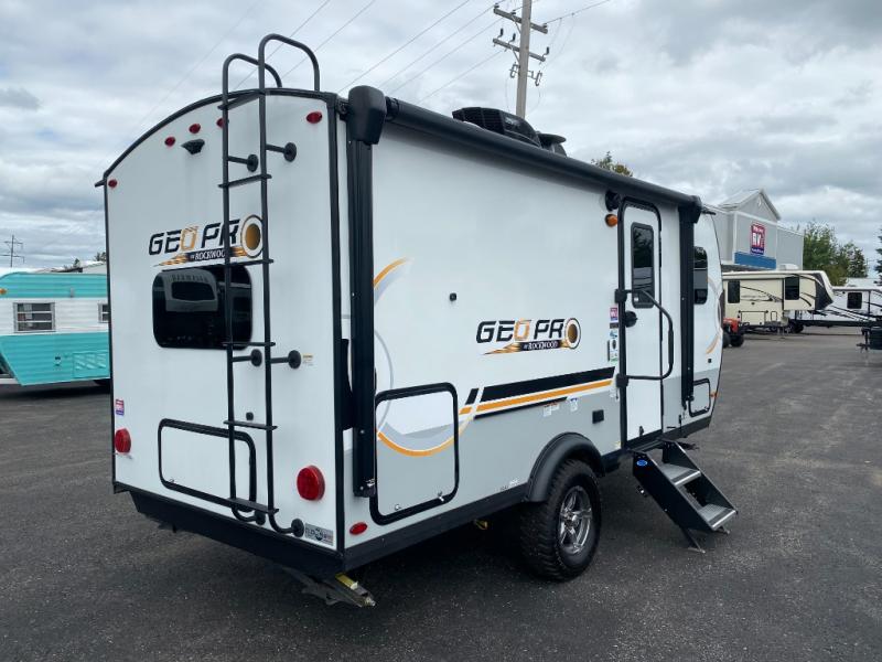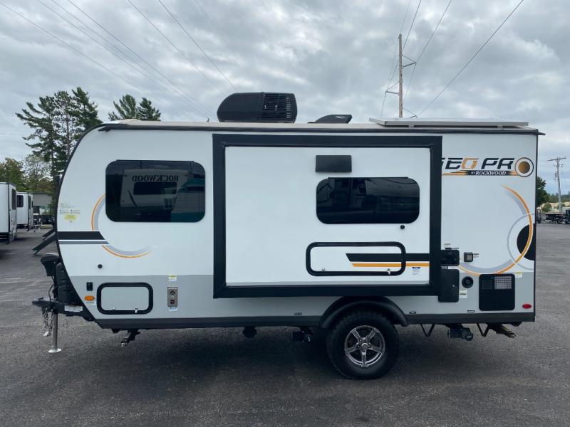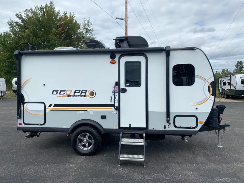 The Rockwood GEO Pro travel trailers and toy hauler by Forest River are ready for all your adventures. The interior and exterior Azdel construction, along with the vacuum laminated roof and walls provide a durable trailer, and the Dexter torsion axles with aluminum wheels make towing easier than ever. There are many convenient amenities, like the 13,500 BTU A/C, the Bluetooth system control panel, and the all-in-one Teton HD TV/WiFi/FM antenna with LTE prep. Each model includes frameless windows, fabric valances and roller shades, and a modern interior that will make you feel right at home. Everything you're looking for in your next RV is in a Rockwood GEO pro by Forest River!