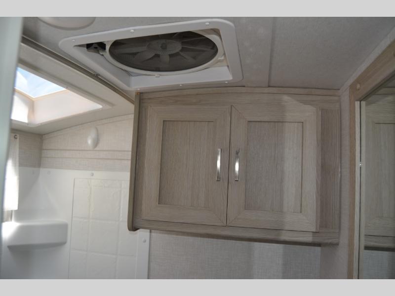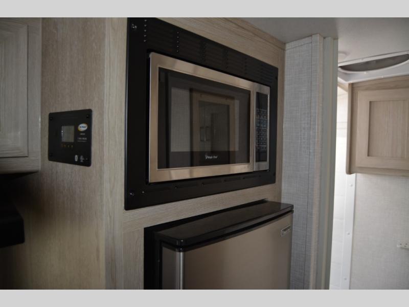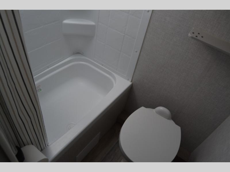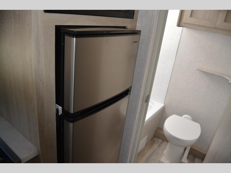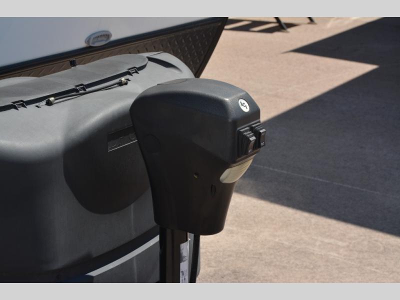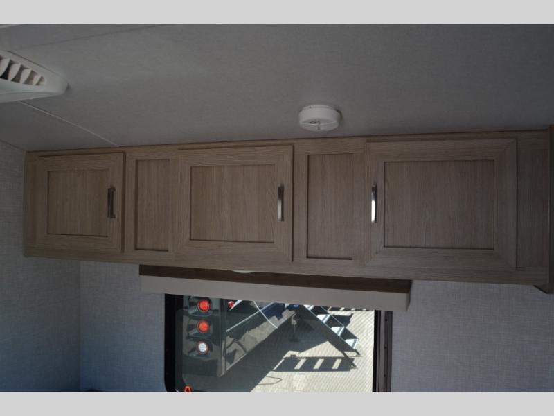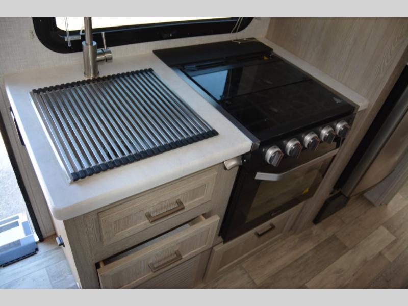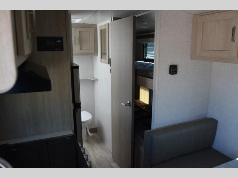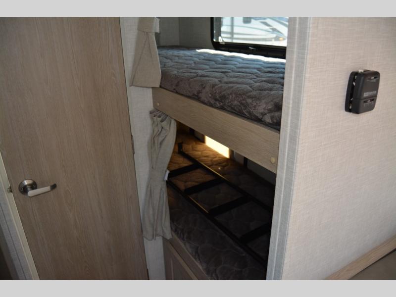 This no slide travel trailer is the perfect lightweight RV for those that love to move around to different campsites. It will be so easy packing up the lawn chairs in the exterior bike door, and there is a rear ladder if you need to clean off the top of your unit. Once you arrive at your destination, put out the 13' power awning, then make lunch on the outside griddle. You will also find a three burner cooktop indoors and a booth dinette where you dine together. This area can be a sleeping space for a small child or adult, plus there is a full-size bed up front and bunk beds in the back.