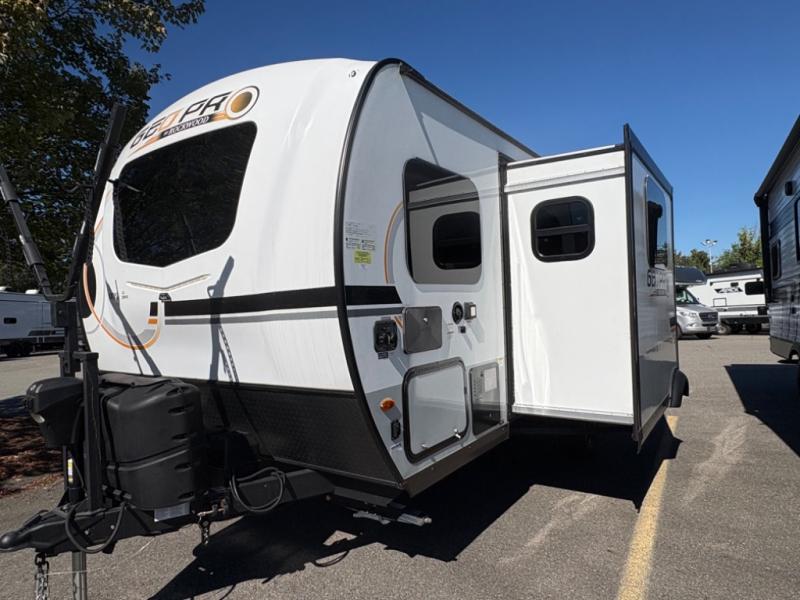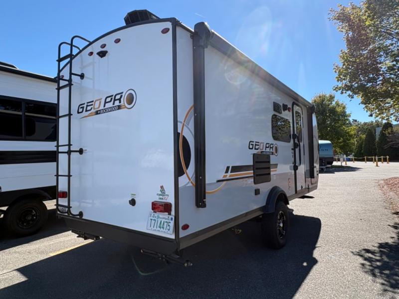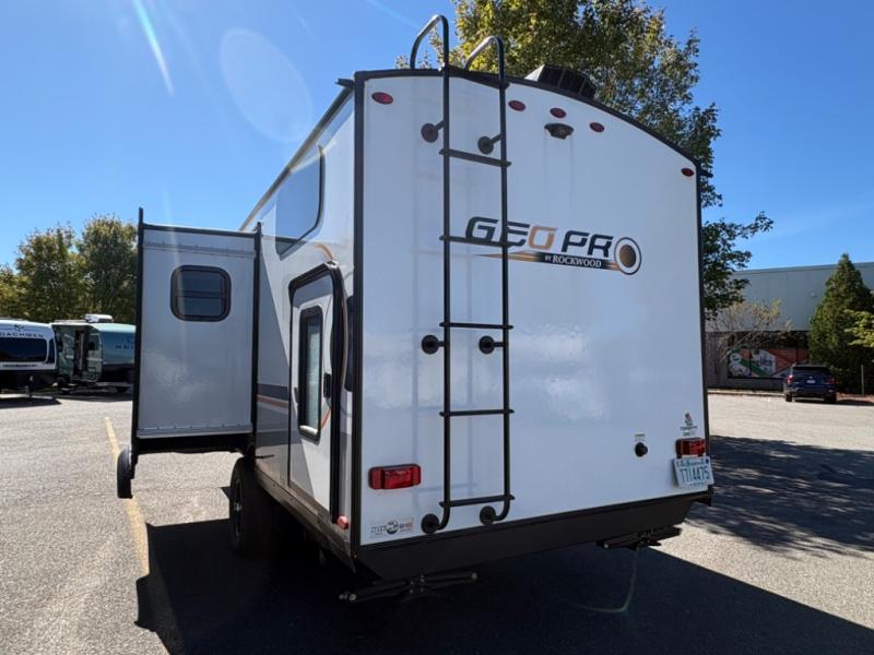 The Rockwood GEO Pro travel trailers and toy hauler by Forest River are ready for all your adventures. The interior and exterior Azdel construction, along with the vacuum laminated roof and walls provide a durable trailer, and the Dexter torsion axles with aluminum wheels make towing easier than ever. There are many convenient amenities, like the 13,500 BTU A/C, the Bluetooth system control panel, and the all-in-one Teton HD TV/WiFi/FM antenna with LTE prep. Each model includes frameless windows, fabric valances and roller shades, and a modern interior that will make you feel right at home. Everything you're looking for in your next RV is in a Rockwood GEO pro by Forest River!