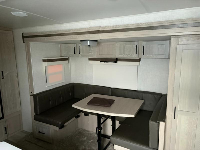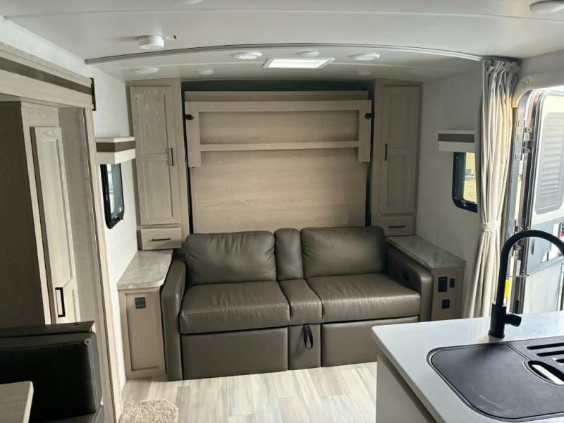 Versatile, cozy, and spacious are just a few ways to describe this travel trailer! Once you arrive at the campsite, unload your gear from the pass-through storage and additional exterior storage, then set up the 15' power awning with LED lights. You may want to visit in your camp chairs, or head inside to prepare lunch on the three burner cooktop. There is a U-shaped dinette within the slide out, plus a wardrobe here for jackets or your guests' clothes. You will also find the 72" sofa is a comfy spot to relax, and at night, you can fold down the RV queen-size Murphy bed!