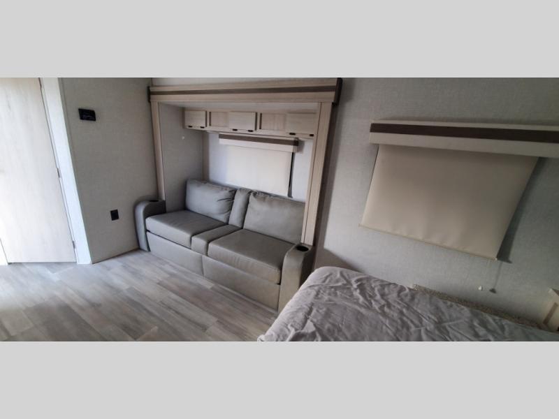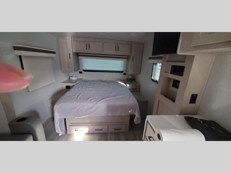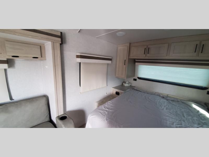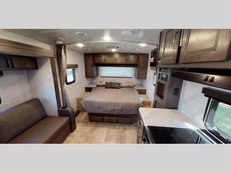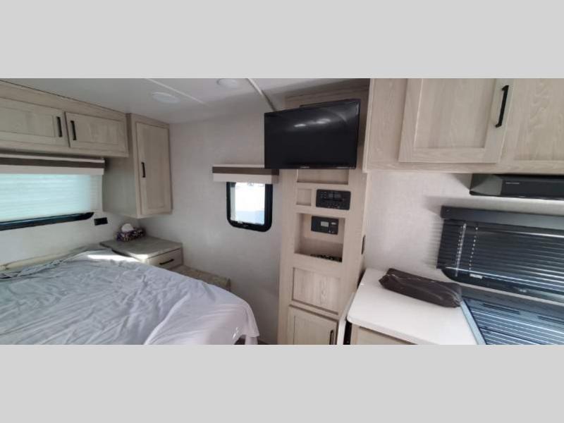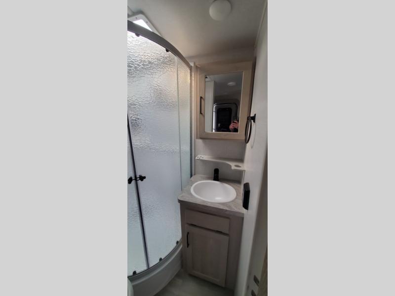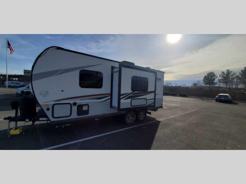 Wherever you decide to camp, you will love every minute in this cute couple's trailer. The sofa slide with a table will provide a place to relax, eat, and even sleep an extra guest if you have one, and the front RV queen bed includes a privacy curtain to enjoy your own space. There are dual bedroom wardrobes to keep your clothes tidy, and you'll find two pass-through storage compartments for your larger gear. An outside griddle with an LP hookup will allow you to make breakfast outdoors, and there is a three burner cooktop indoors if the weather isn't cooperating. Since there is a full bath on board you won't have to use the camp's facilities, and you can make it a movie night with the LED TV in the main living area!