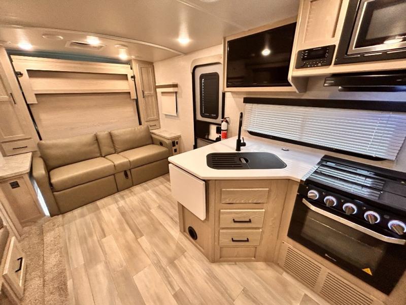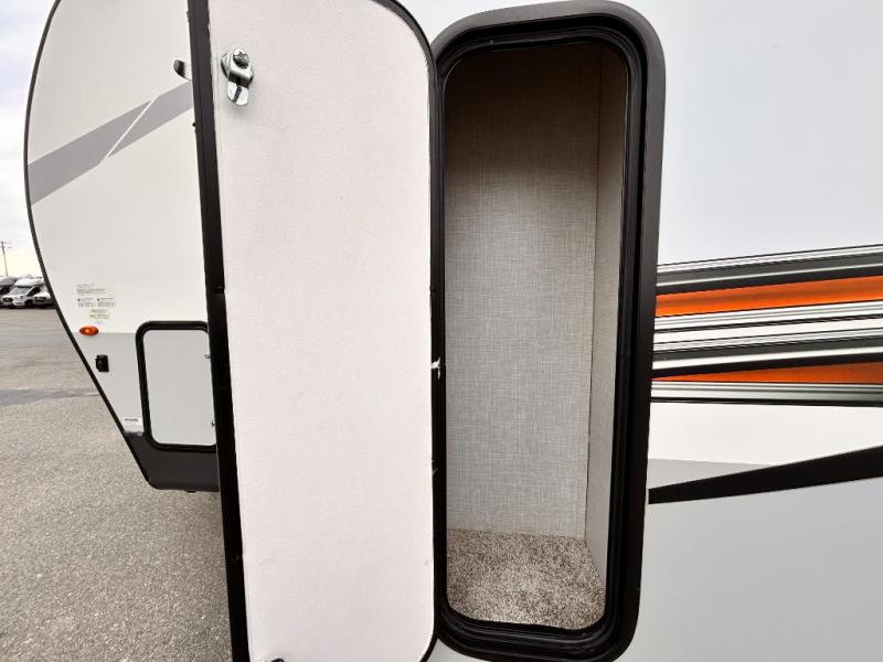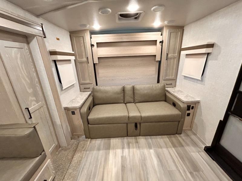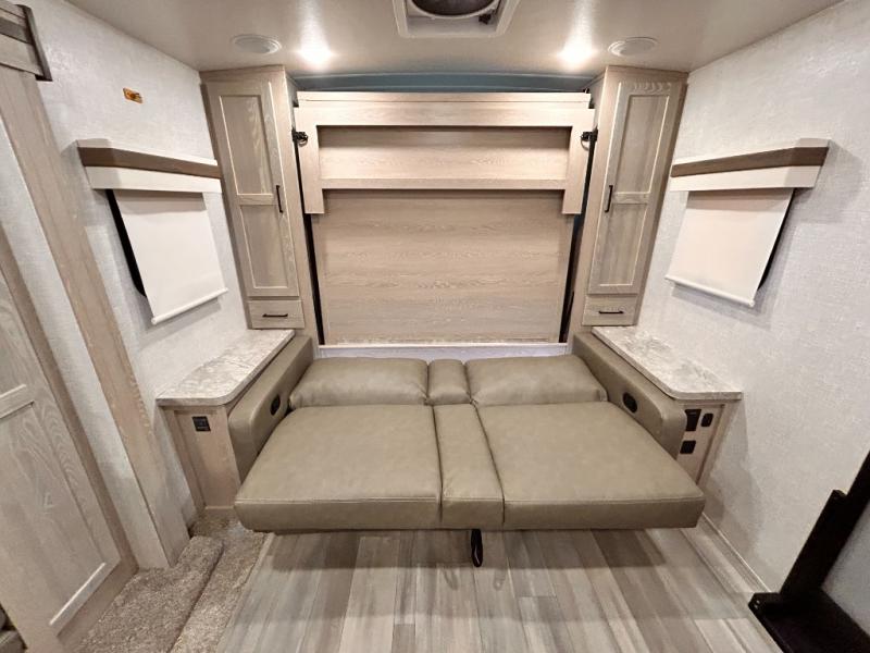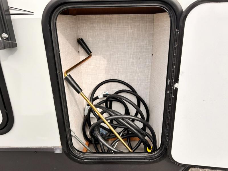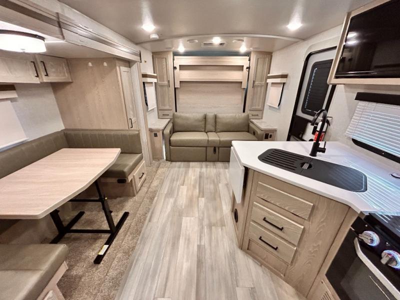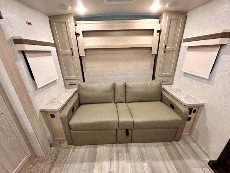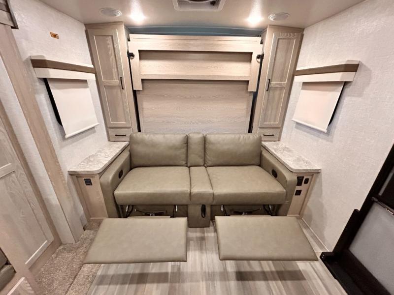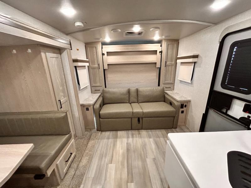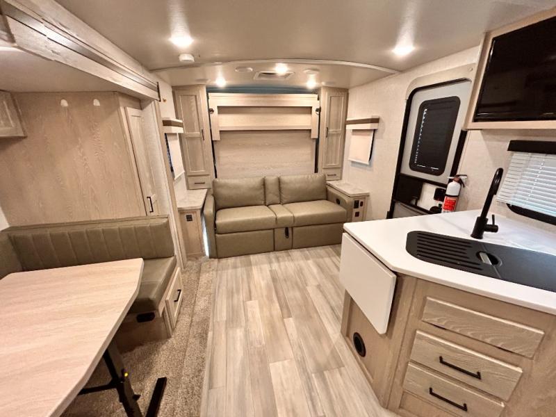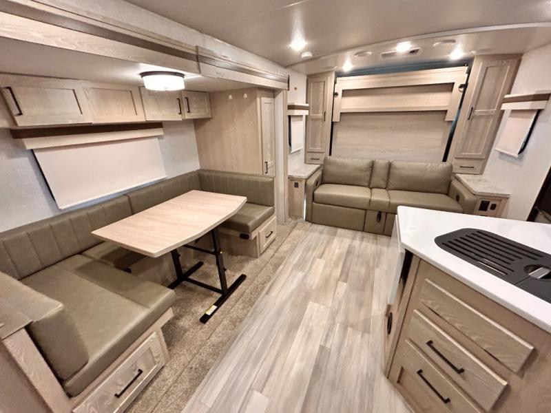 You can't beat this travel trailer with an outside kitchen, tons of exterior storage, and a versatile Murphy bed up front! When your crew isn't outside under the 19' power awning, they can head indoors to play a game around the U-shaped dinette, or watch a movie on the LED TV. There is also a 72" sofa here when the bed is folded away, and everyone will appreciate the spacious full rear bath for privacy. This model includes plenty of exterior space, but you'll be impressed by the interior storage space as well; dual bedroom wardrobes, a wardrobe within the slide out, plus a lean-in pantry in the kitchen for snacks!