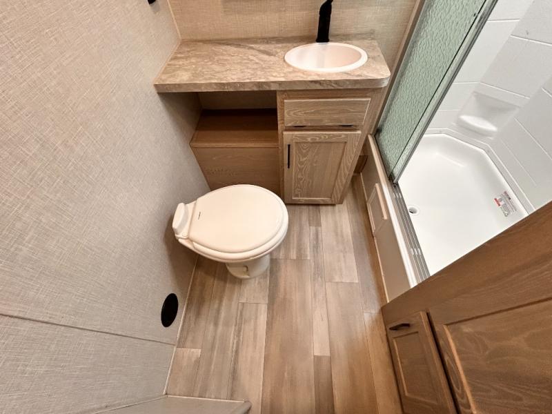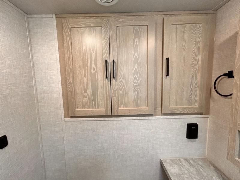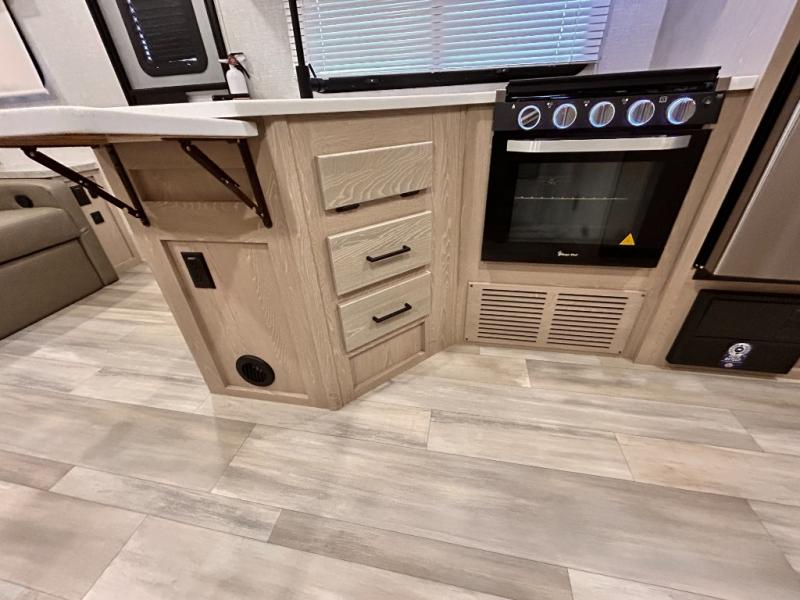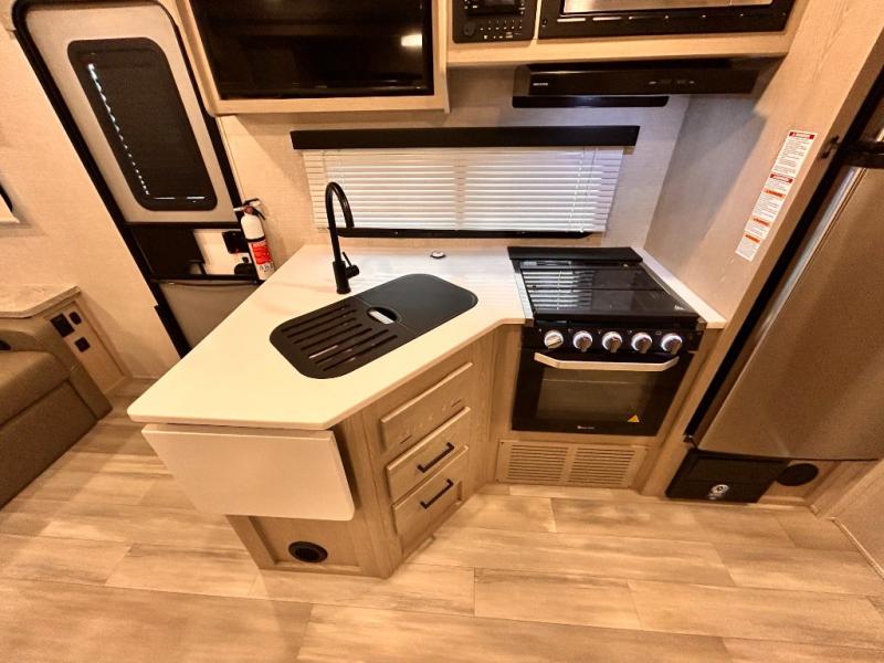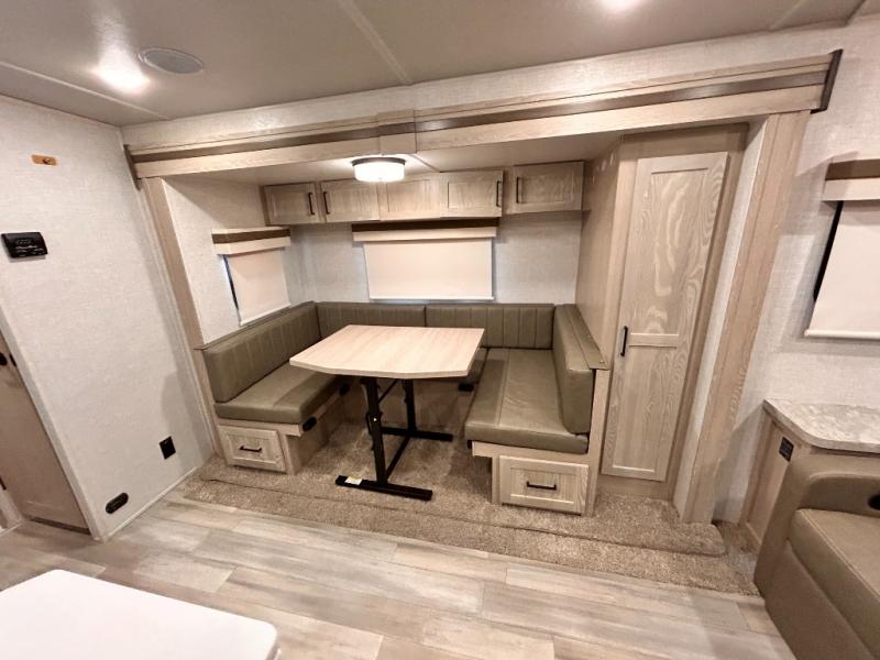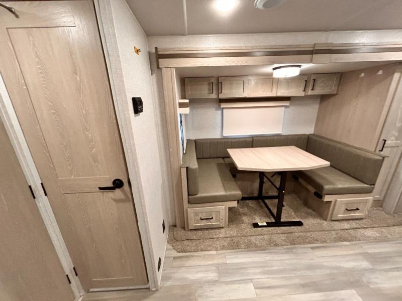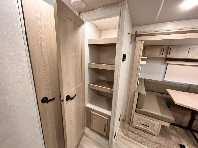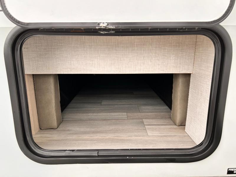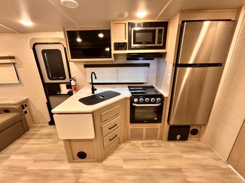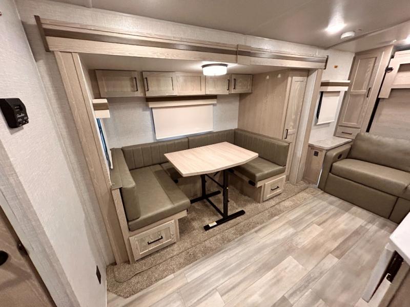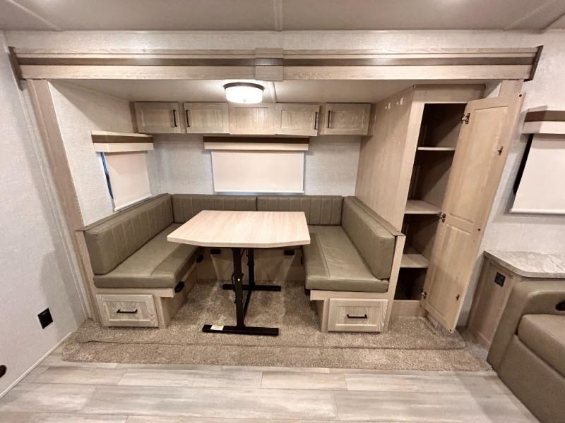 You can't beat this travel trailer with an outside kitchen, tons of exterior storage, and a versatile Murphy bed up front! When your crew isn't outside under the 19' power awning, they can head indoors to play a game around the U-shaped dinette, or watch a movie on the LED TV. There is also a 72" sofa here when the bed is folded away, and everyone will appreciate the spacious full rear bath for privacy. This model includes plenty of exterior space, but you'll be impressed by the interior storage space as well; dual bedroom wardrobes, a wardrobe within the slide out, plus a lean-in pantry in the kitchen for snacks!