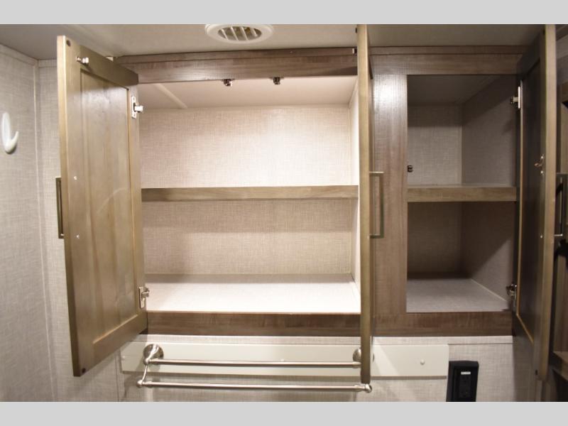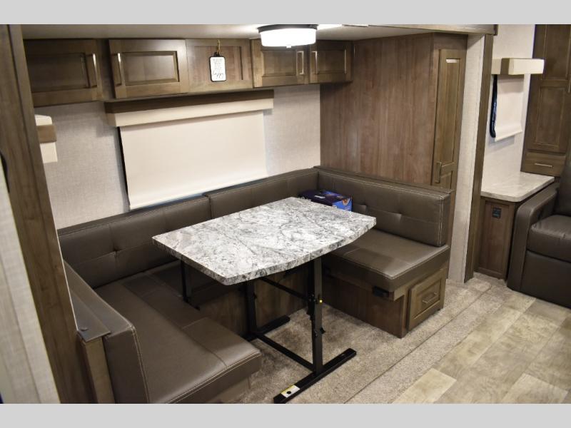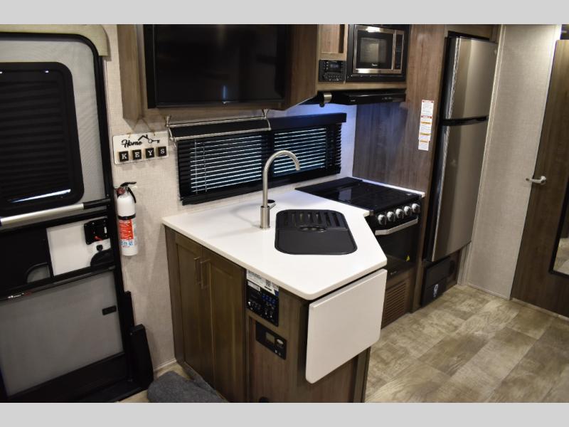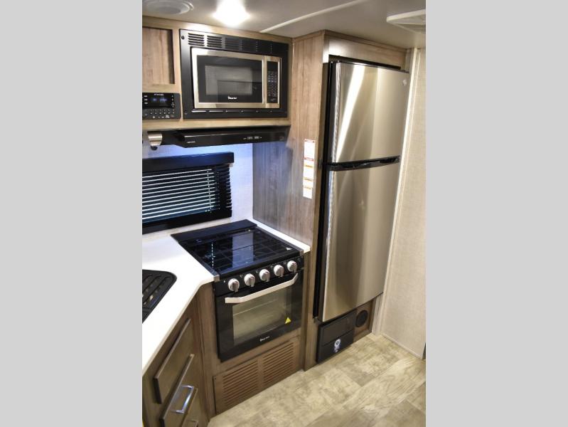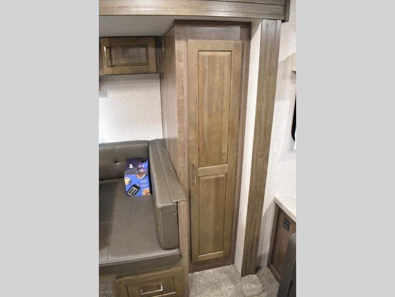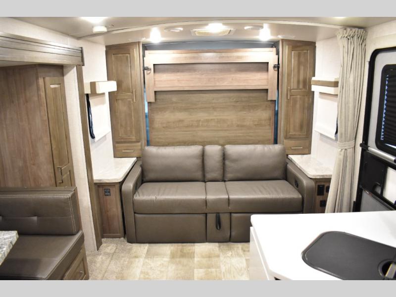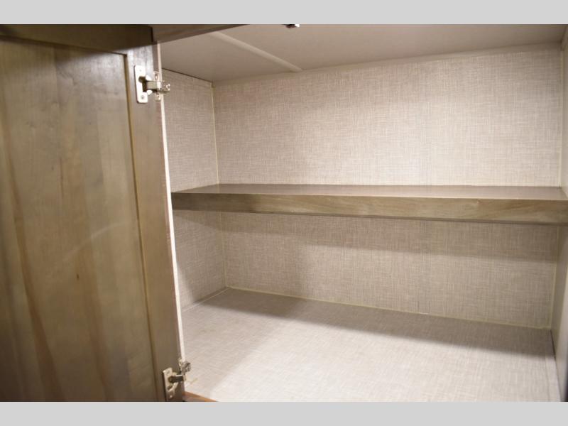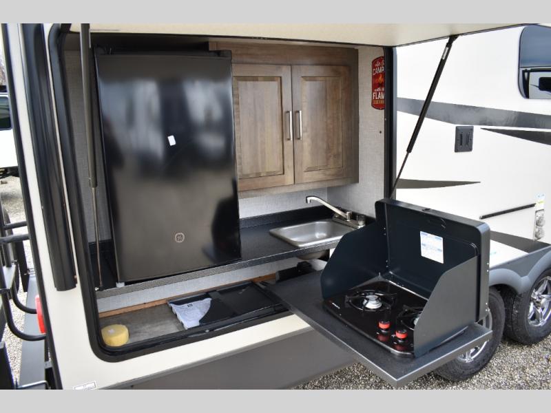 You can't beat this travel trailer with an outside kitchen, tons of exterior storage, and a versatile Murphy bed up front! When your crew isn't outside under the 19' power awning, they can head indoors to play a game around the U-shaped dinette, or watch a movie on the LED TV. There is also a 72" sofa here when the bed is folded away, and everyone will appreciate the spacious full rear bath for privacy. This model includes plenty of exterior space, but you'll be impressed by the interior storage space as well; dual bedroom wardrobes, a wardrobe within the slide out, plus a lean-in pantry in the kitchen for snacks!