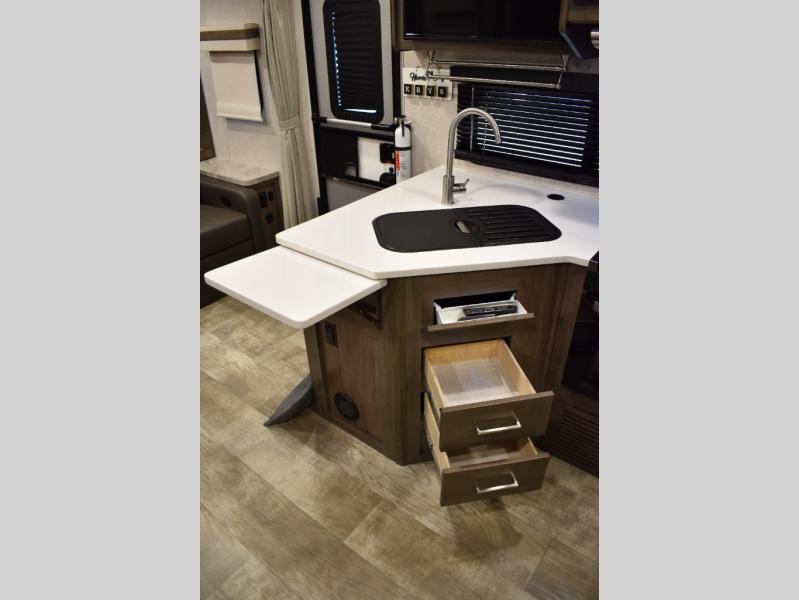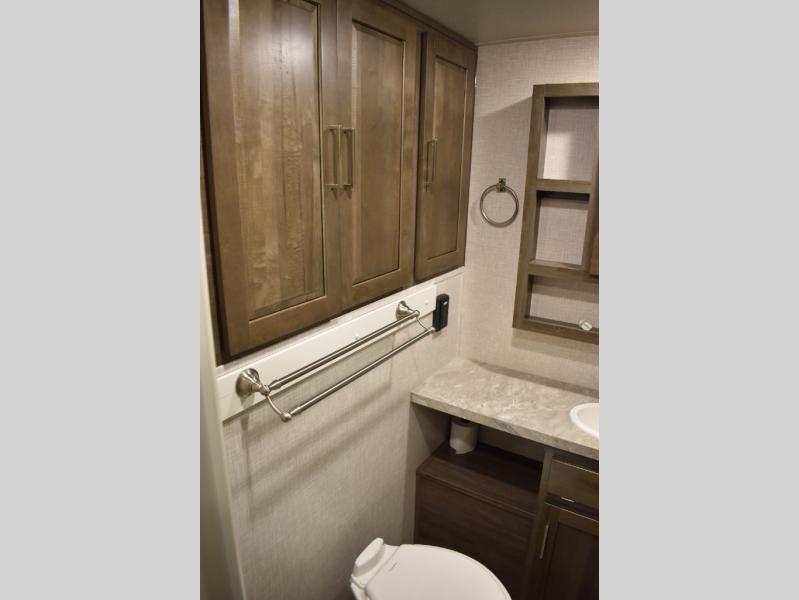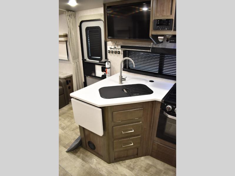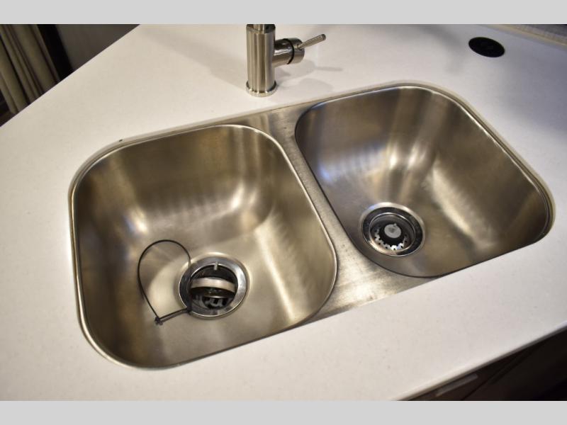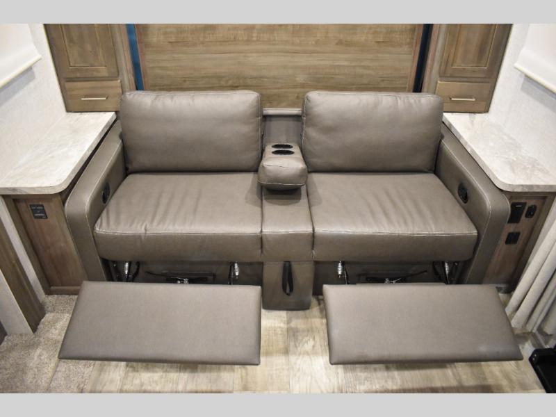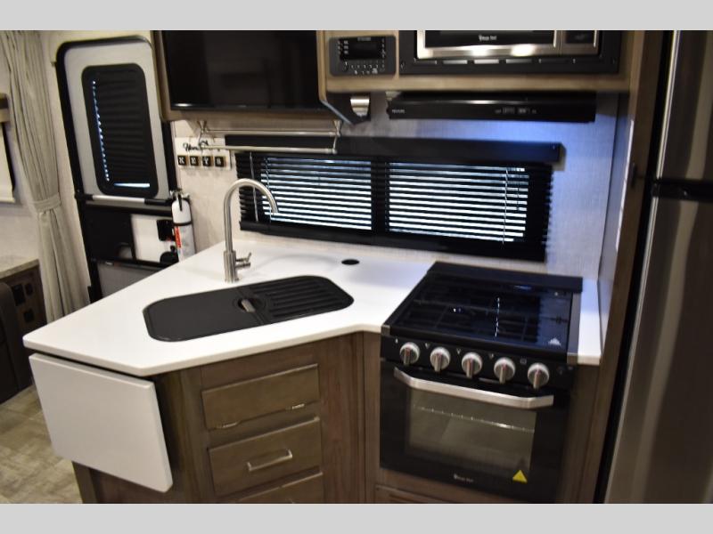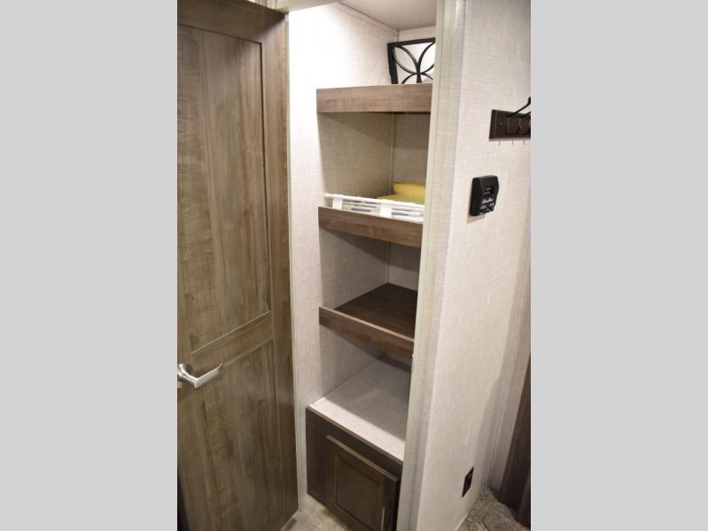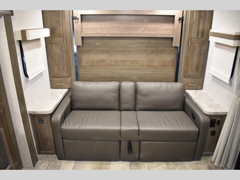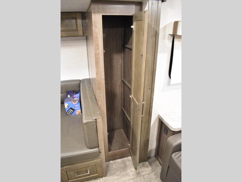 You can't beat this travel trailer with an outside kitchen, tons of exterior storage, and a versatile Murphy bed up front! When your crew isn't outside under the 19' power awning, they can head indoors to play a game around the U-shaped dinette, or watch a movie on the LED TV. There is also a 72" sofa here when the bed is folded away, and everyone will appreciate the spacious full rear bath for privacy. This model includes plenty of exterior space, but you'll be impressed by the interior storage space as well; dual bedroom wardrobes, a wardrobe within the slide out, plus a lean-in pantry in the kitchen for snacks!