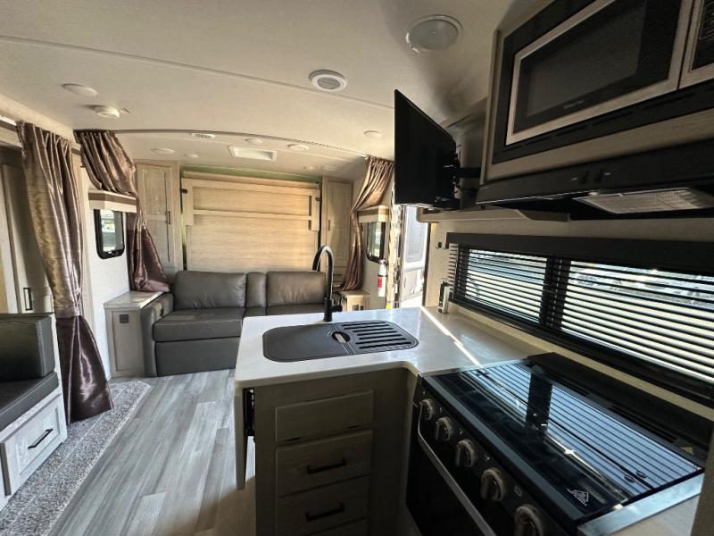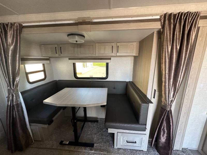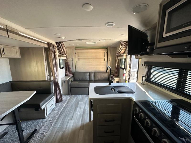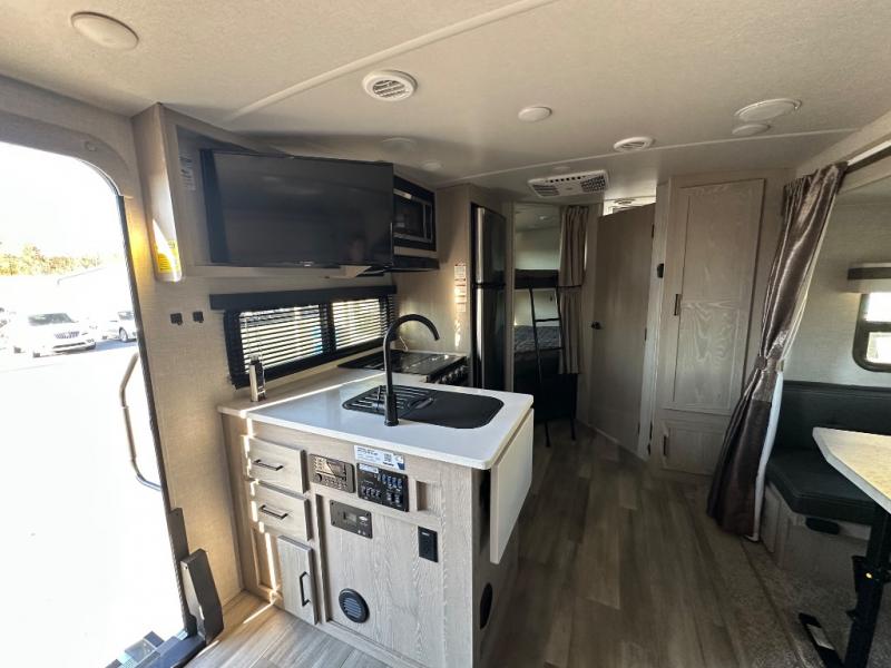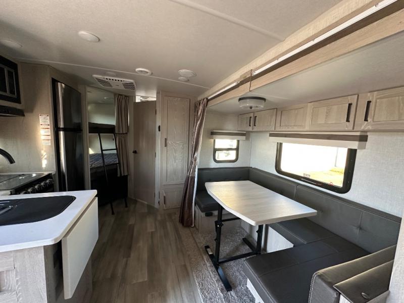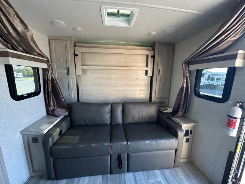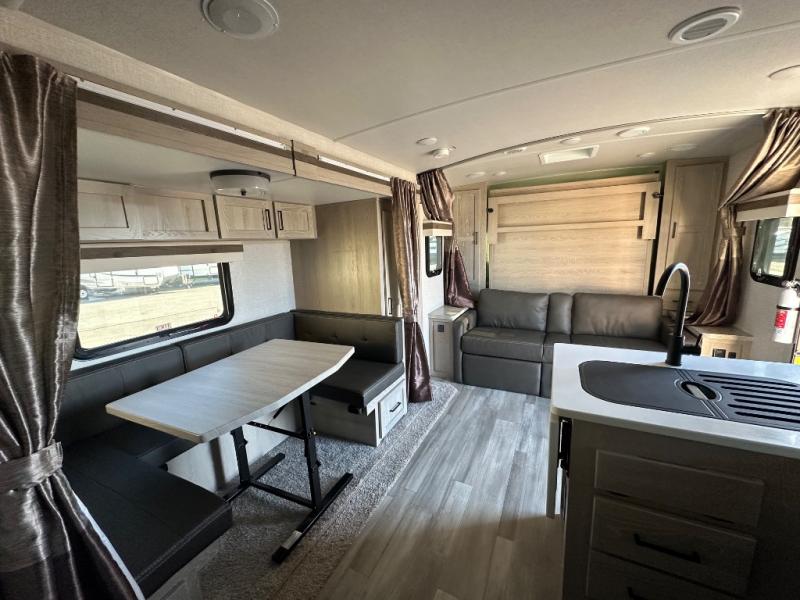 Finally, a lightweight travel trailer with double-size bunks for the kids or your guests! You'll find the versatile Murphy bed up front will be super convenient when you need more space to move around, and the 72" sofa will provide comfy seating space when the bed is put up. This model also includes a U-shaped dinette slide perfect to dine around, play games, and sleep additional guests. An LED TV in the main living area will allow you to watch your favorite shows in the evenings, or you may just find yourselves outdoors under the 18' power awning with LED lights. And check out the pass-through storage, plus additional exterior storage for your hiking gear!