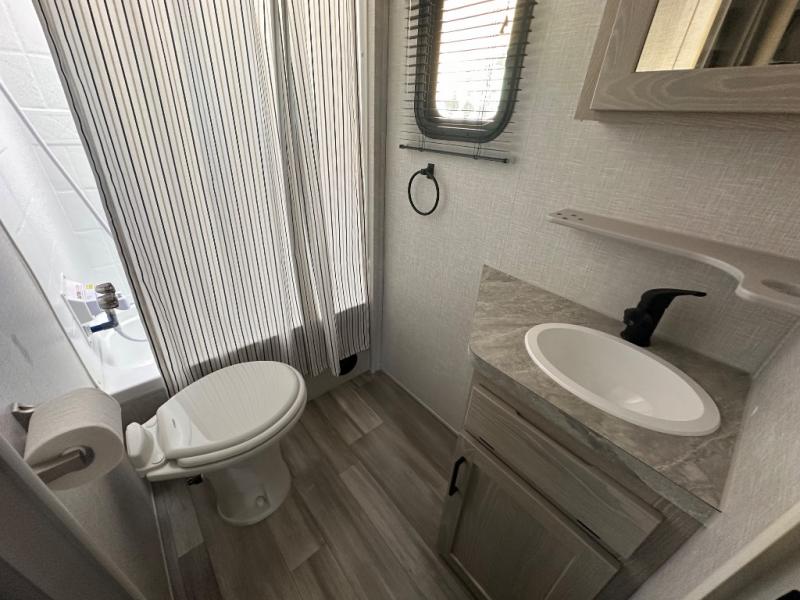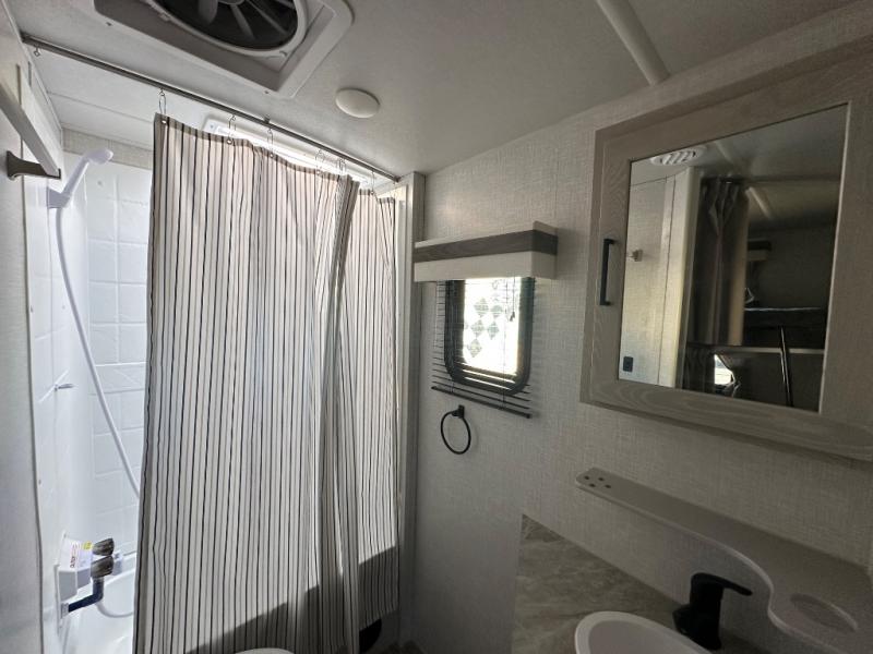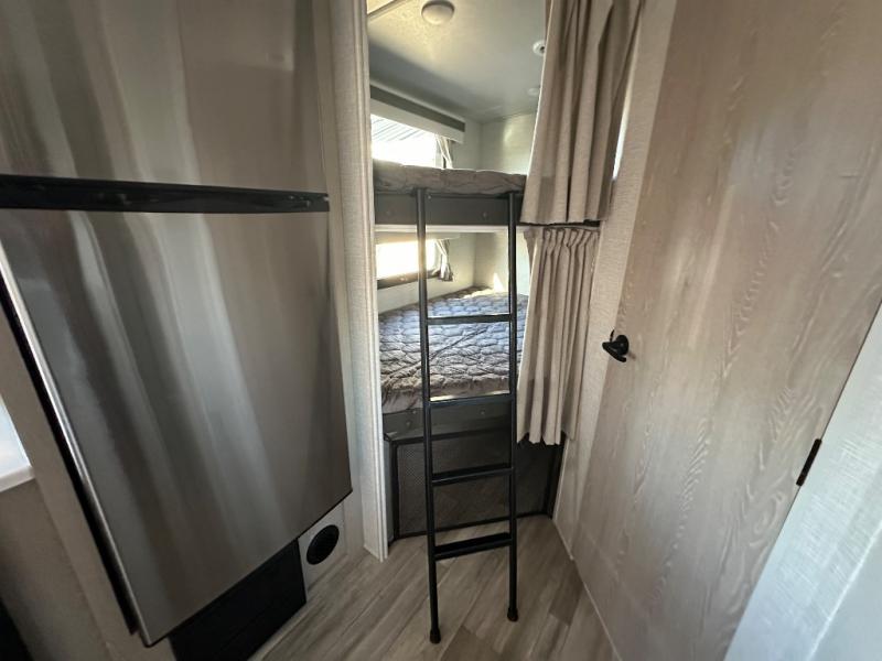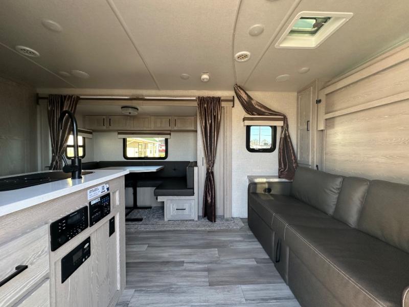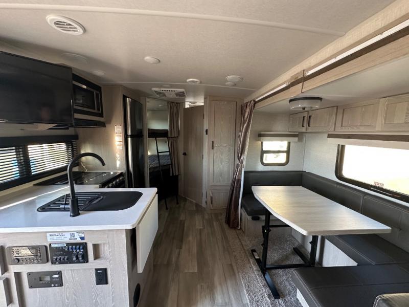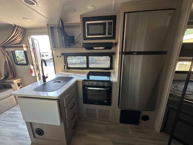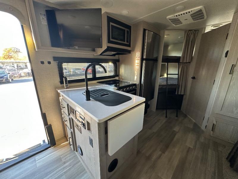 Finally, a lightweight travel trailer with double-size bunks for the kids or your guests! You'll find the versatile Murphy bed up front will be super convenient when you need more space to move around, and the 72" sofa will provide comfy seating space when the bed is put up. This model also includes a U-shaped dinette slide perfect to dine around, play games, and sleep additional guests. An LED TV in the main living area will allow you to watch your favorite shows in the evenings, or you may just find yourselves outdoors under the 18' power awning with LED lights. And check out the pass-through storage, plus additional exterior storage for your hiking gear!