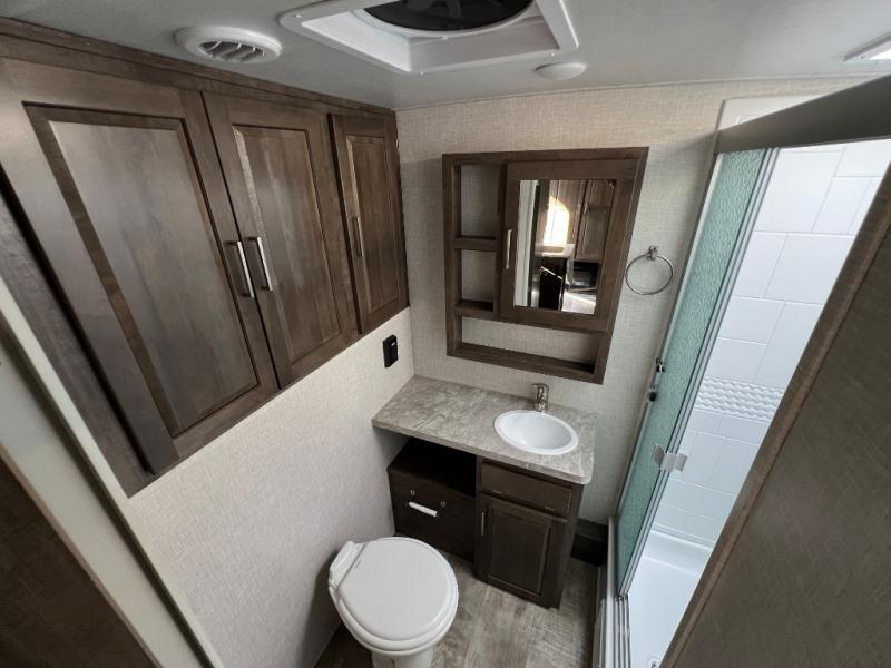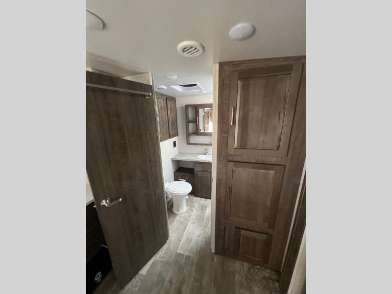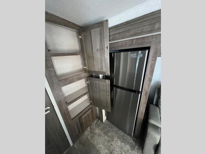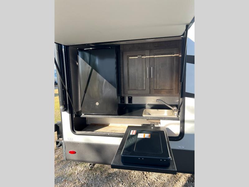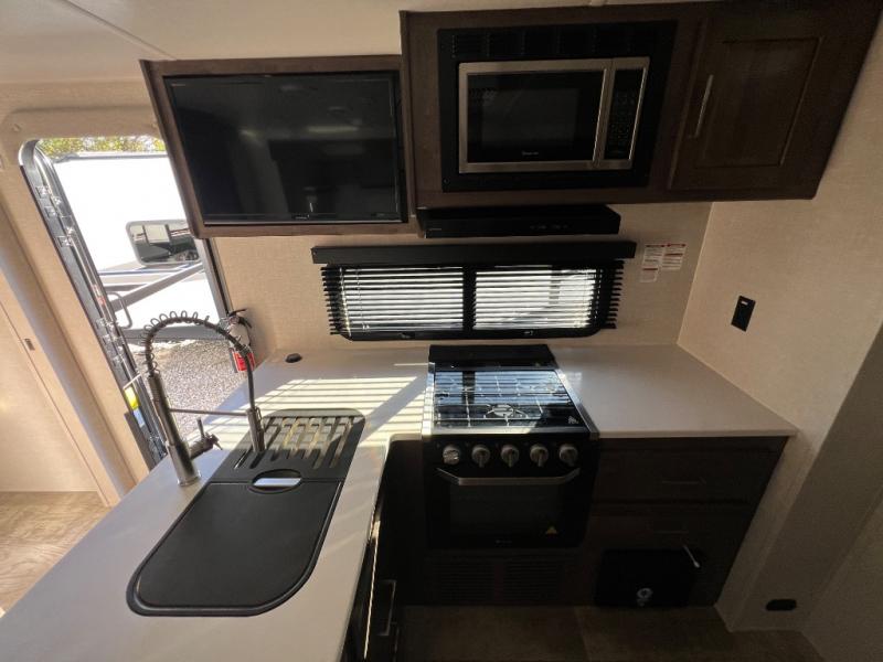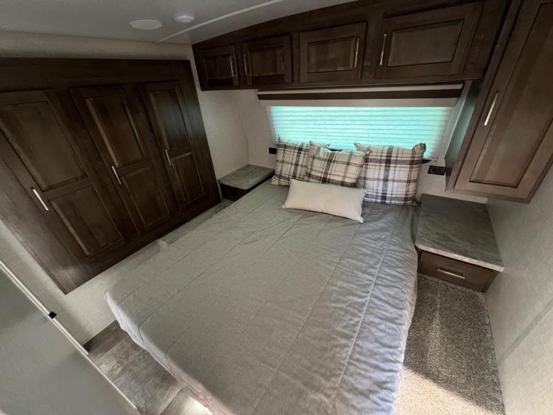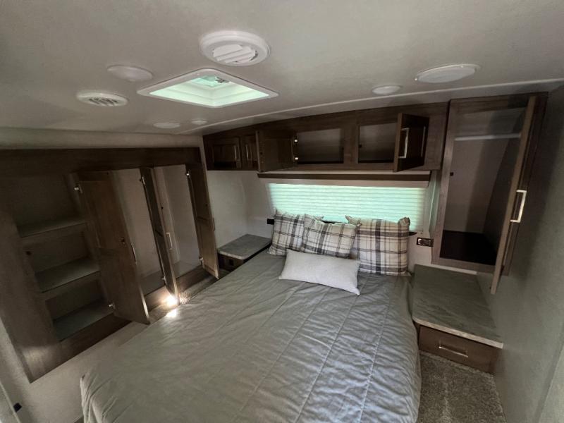 This is the perfect travel trailer for two people looking for comfortable camping trips! You will have your own RV queen bed to sleep on in the front private bedroom, and an optional TV can be added if you enjoy the morning news in bed. Breakfast can be made on the three burner cooktop, or head outdoors to cook on the outside kitchen. The theater seating with a table will provide a place to relax and dine together, and the spacious full rear bath will allow you to clean up before you head out for the day. This model includes plenty of storage space, including two pantries, a wardrobe slide out in the bedroom, plus a drop-frame pass-through storage for larger camp gear!