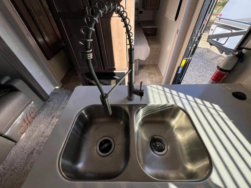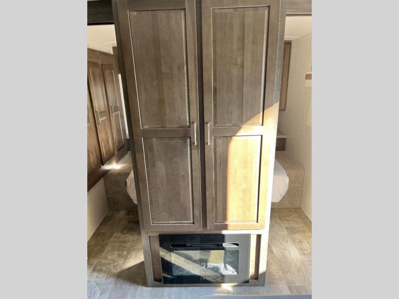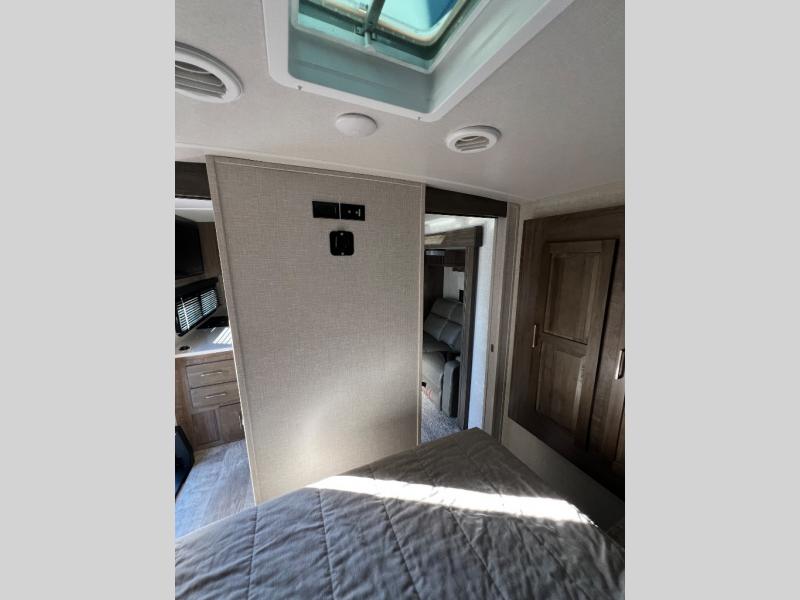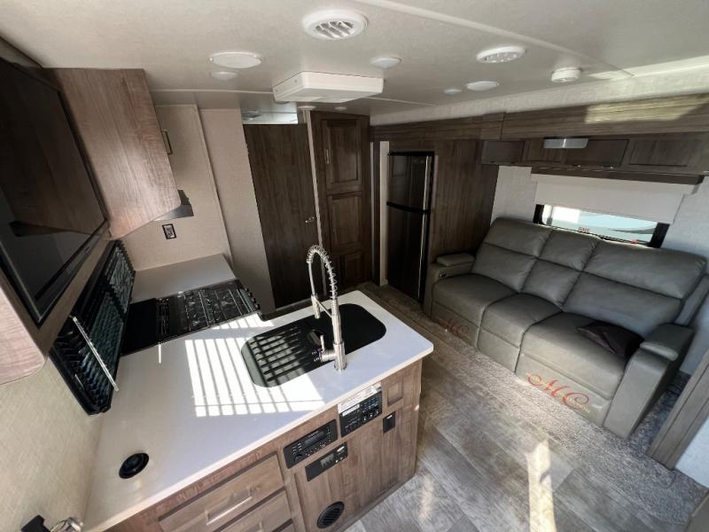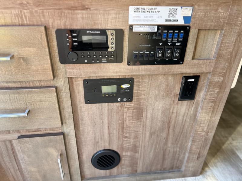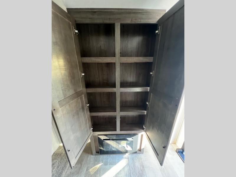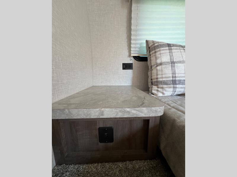 This is the perfect travel trailer for two people looking for comfortable camping trips! You will have your own RV queen bed to sleep on in the front private bedroom, and an optional TV can be added if you enjoy the morning news in bed. Breakfast can be made on the three burner cooktop, or head outdoors to cook on the outside kitchen. The theater seating with a table will provide a place to relax and dine together, and the spacious full rear bath will allow you to clean up before you head out for the day. This model includes plenty of storage space, including two pantries, a wardrobe slide out in the bedroom, plus a drop-frame pass-through storage for larger camp gear!