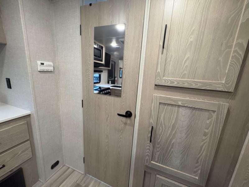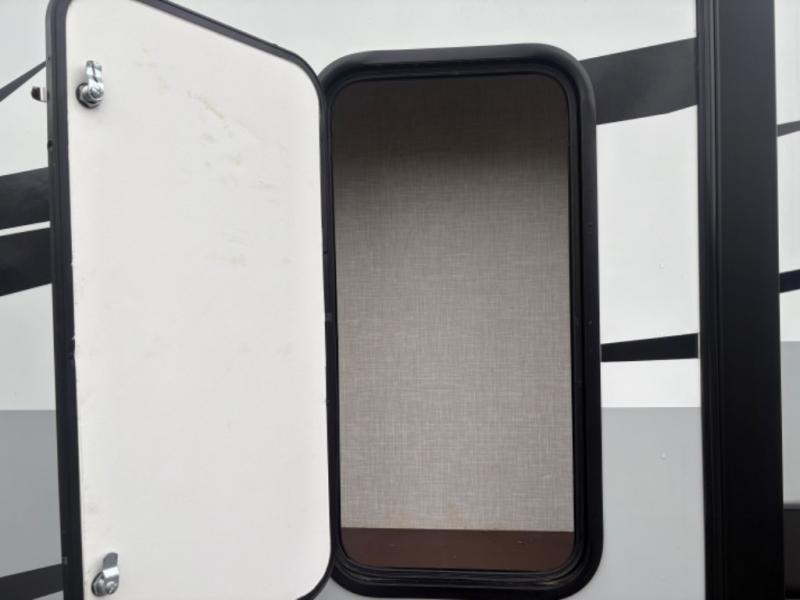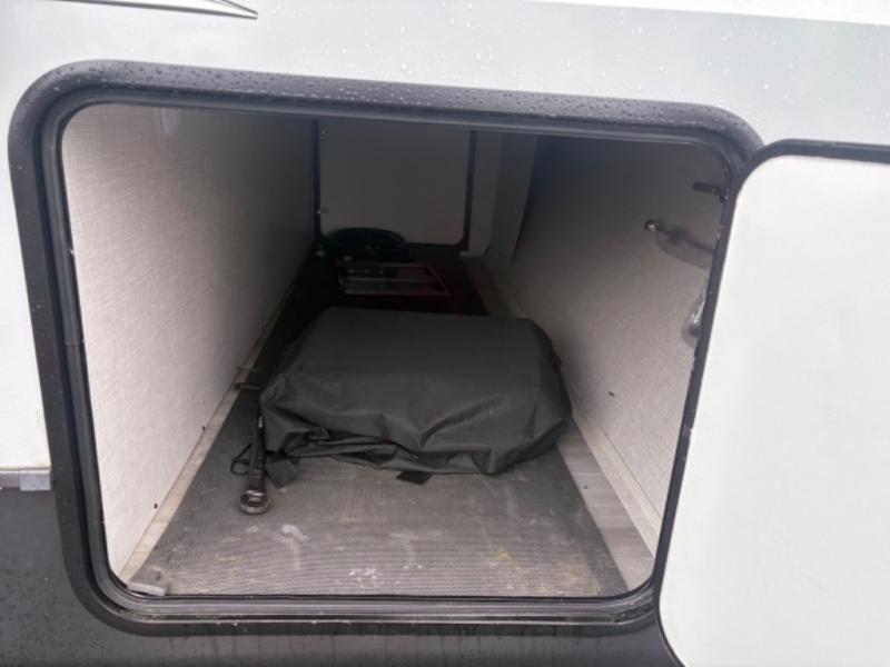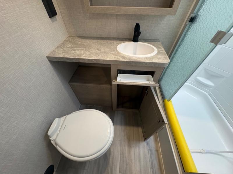 This is the perfect travel trailer for two people looking for comfortable camping trips! You will have your own RV queen bed to sleep on in the front private bedroom, and an optional TV can be added if you enjoy the morning news in bed. Breakfast can be made on the three burner cooktop, or head outdoors to cook on the outside kitchen. The theater seating with a table will provide a place to relax and dine together, and the spacious full rear bath will allow you to clean up before you head out for the day. This model includes plenty of storage space, including two pantries, a wardrobe slide out in the bedroom, plus a drop-frame pass-through storage for larger camp gear!