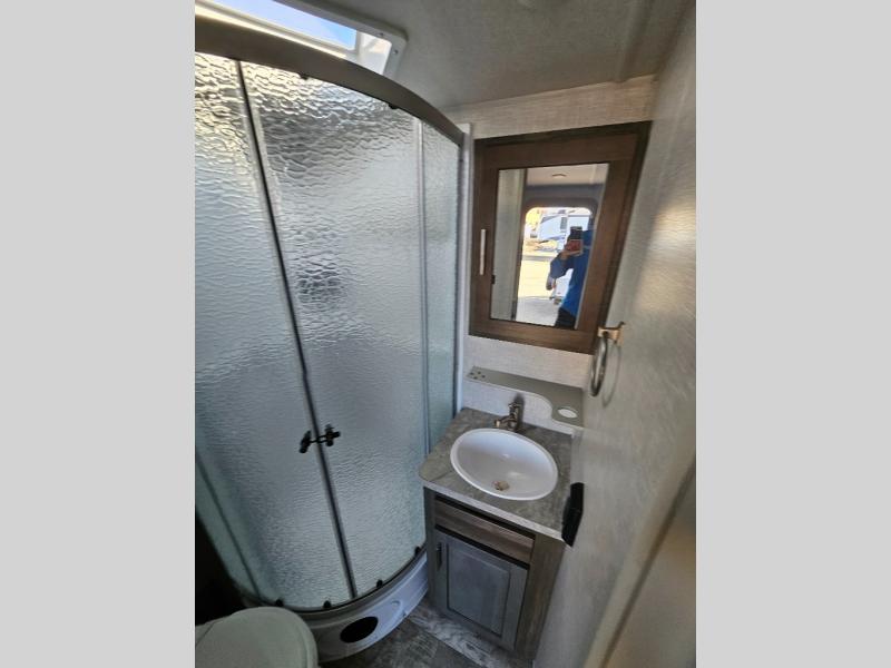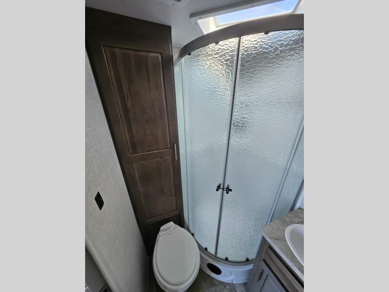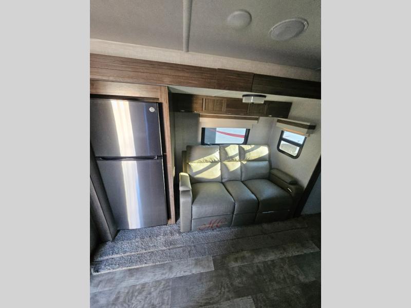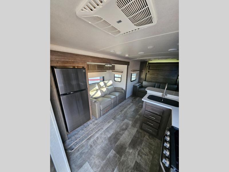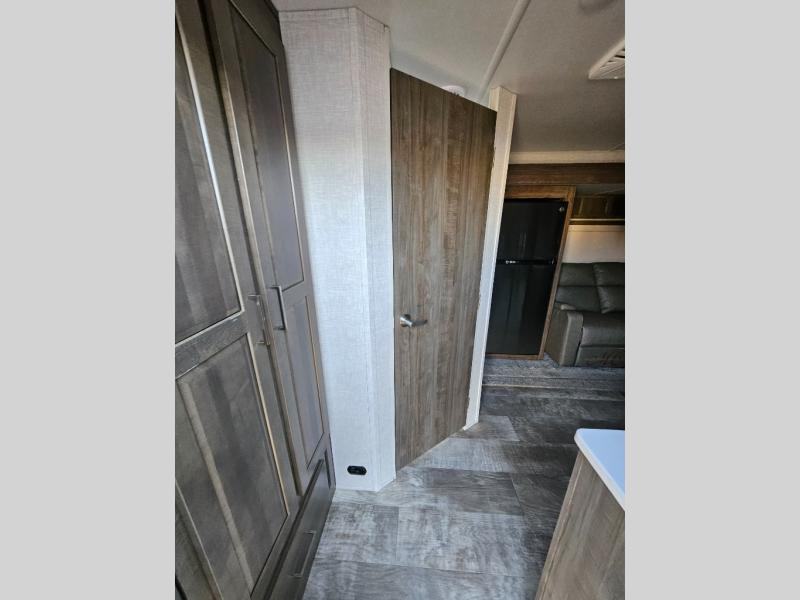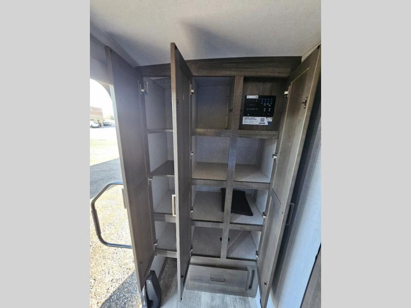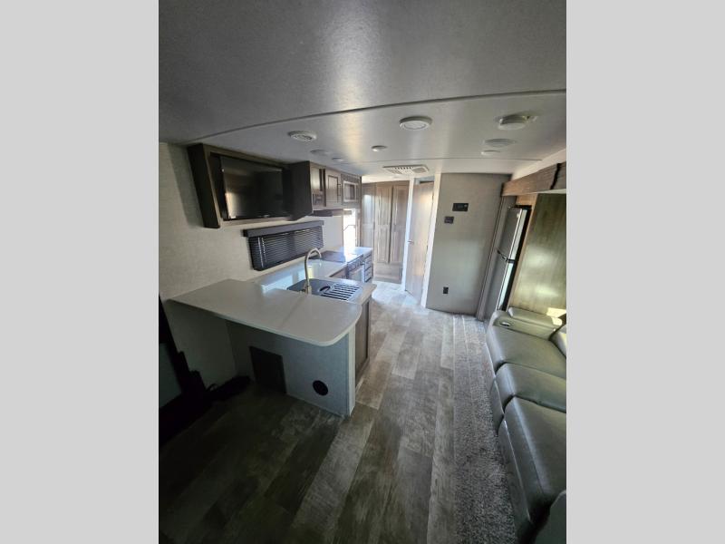 Comfort and versatility come standard in this travel trailer for two! You will love the front Murphy bed with dual wardrobes on either side of the bed for your things, and in the morning you can fold the bed away to relax on the sofa. There is a bar with stools that can serve as your breakfast bar, or you may just want to enjoy your coffee on the theater seating with a table. There is a place for all your belongings since this model includes tons of interior storage, plus a pass-through storage and a drop-frame storage outside for fishing poles, lawn chairs, or firewood. And did we mention this model includes dual entry doors?! How convenient!