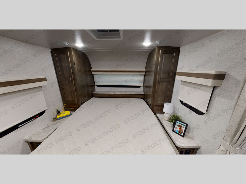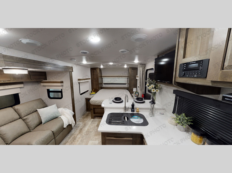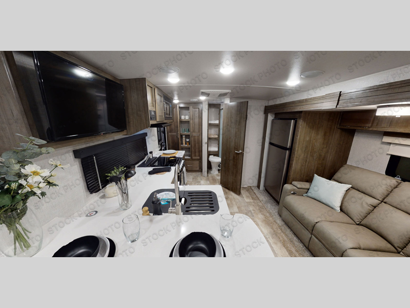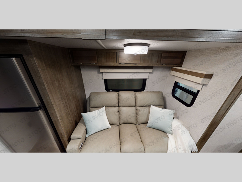 Comfort and versatility come standard in this travel trailer for two! You will love the front Murphy bed with dual wardrobes on either side of the bed for your things, and in the morning you can fold the bed away to relax on the sofa. There is a bar with stools that can serve as your breakfast bar, or you may just want to enjoy your coffee on the theater seating with a table. There is a place for all your belongings since this model includes tons of interior storage, plus a pass-through storage and a drop-frame storage outside for fishing poles, lawn chairs, or firewood. And did we mention this model includes dual entry doors?! How convenient!