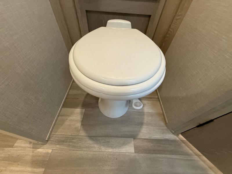 Escape the city life for weekend trips in this cozy couple's trailer. The dual entry doors will allow you to enter in through the rear private bedroom, or the front kitchen/main living area for convenience. You will enjoy relaxing on the theater seating across from the LED TV and fireplace in the evenings, or you can visit outdoors under the 19' power awning. You'll also find an exterior griddle here for quick meals and exterior storage for the fishing poles or hiking gear. This model also includes a walk-through bath with a shower skylight, a linen closet, plus a Showermiser Water Saving System. And don't worry about storage space inside since this model includes an entryway pantry/closet, a second pantry in the front kitchen, plus a large bedroom wardrobe to keep your clothes wrinkle-free!