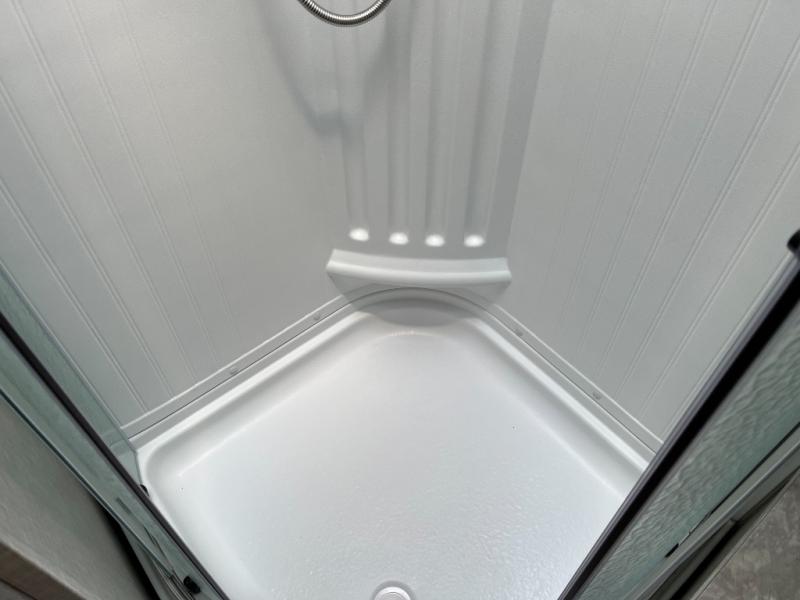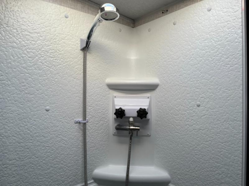 Shower, toilet, and vanity add everyday comfort without relying on campground facilities.