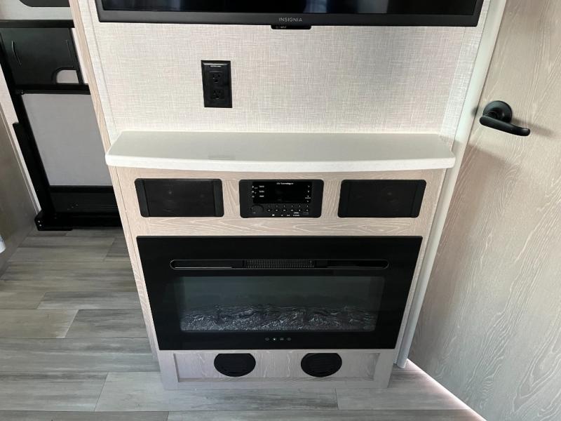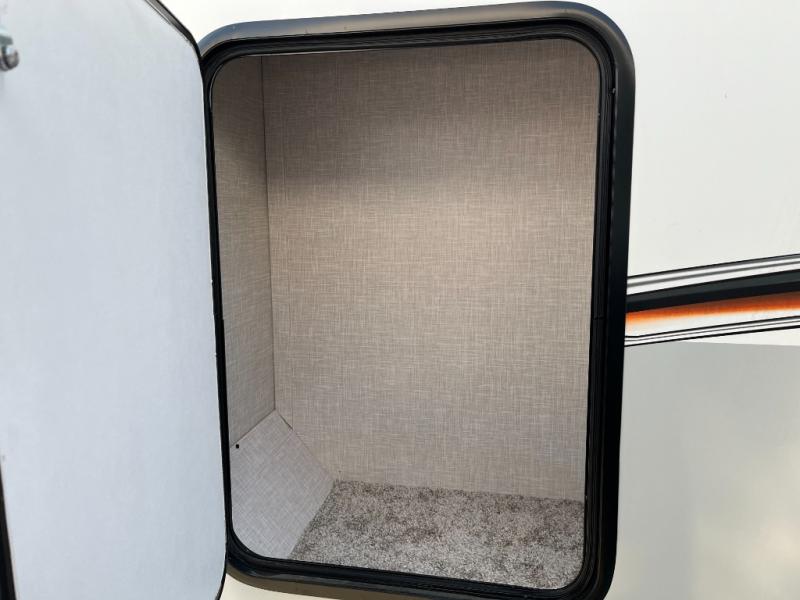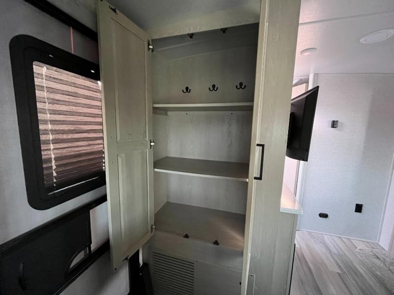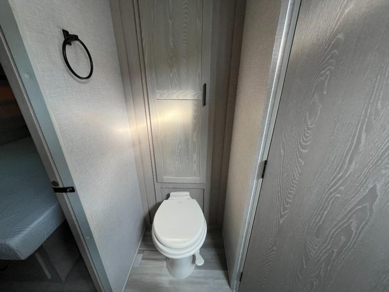 The sleeping area provides a peaceful retreat at the end of a day full of adventure. The bed offers comfortable rest, while nearby storage helps keep clothes and personal items neatly organized. Whether you’re camping with a partner or using the convertible dinette as an additional sleep space, everyone can enjoy a good night’s sleep before the next day’s activities.