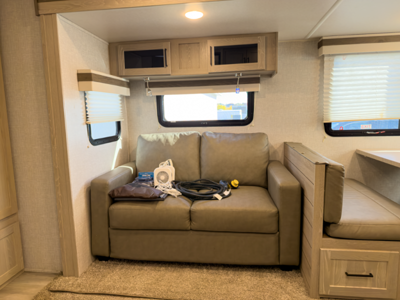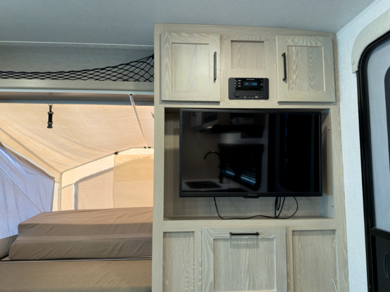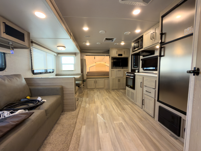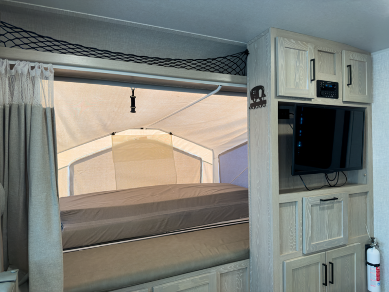 Every camping trip can be spent in comfort with this spacious expandable! Within the large slide you'll find the 44" booth dinette and 60" sofa for comfortable seating and sleeping space, and check out the LED TV! Use the three burner gas cooktop or the exterior griddle to prepare lunch on before you all head out for the day. The full bath includes the Showermiser water saving system you are sure to appreciate, plus a linen closet for clean towels. This model also includes two queen tent end beds for your comfort!