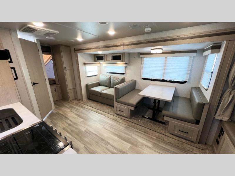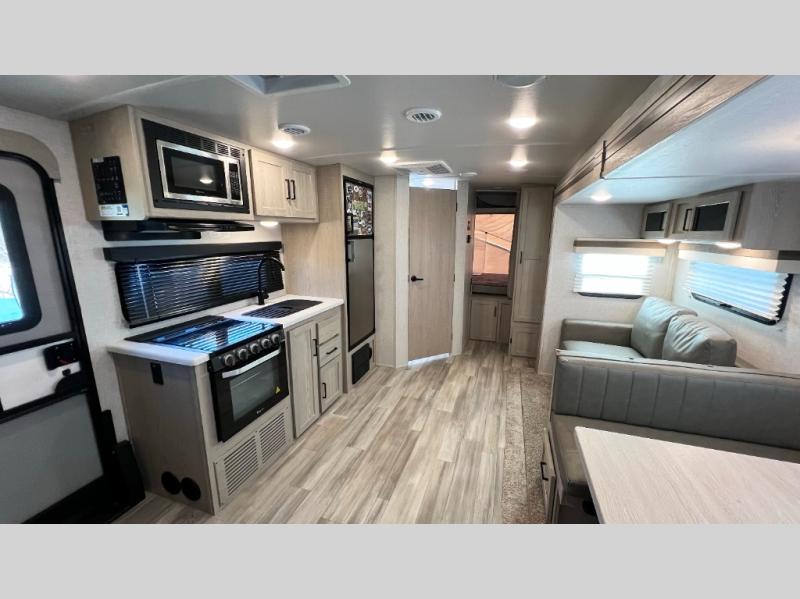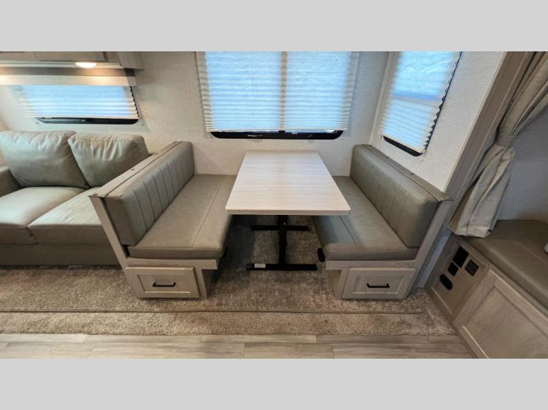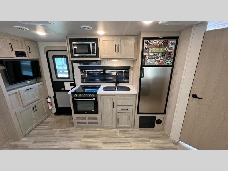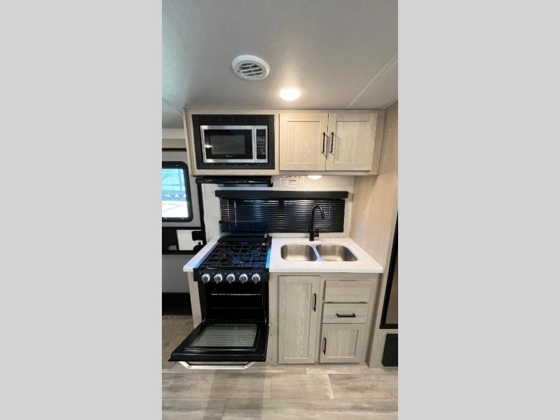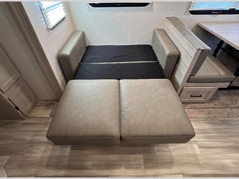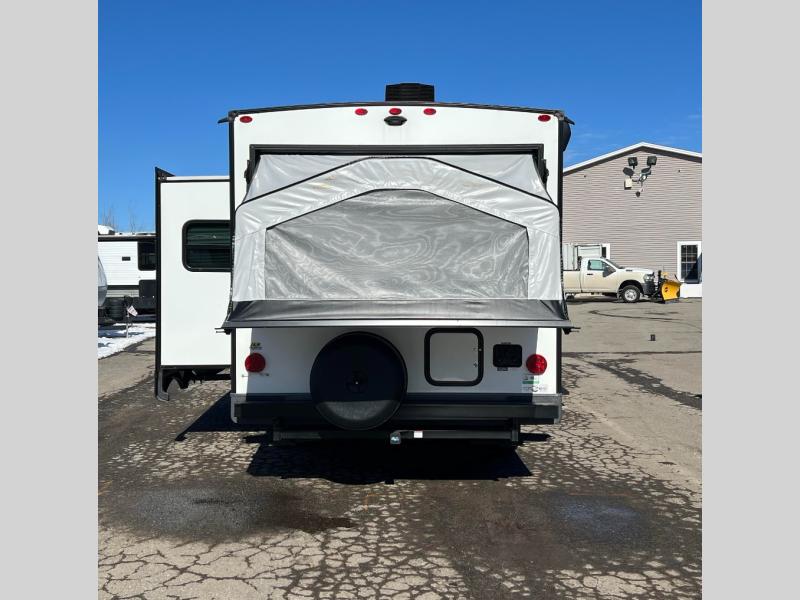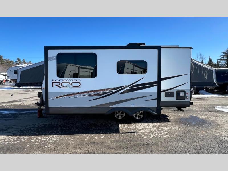 With any Rockwood Roo expandable travel trailer by Forest River you will enjoy smooth towing thanks to the torsion axle, Rubber-Ryde suspension, the easy lube axles and Nev-R-Adjust brakes, and the Goodyear Endurance tires. The key-Alike locks provide easy access in and out of your trailer, and each model includes a Teton all-in-one WiFi booster with LTE prep and an antenna for all your connection needs. Each model is constructed with a vacuum laminated one-piece roof and walls, an enclosed underbelly, and frameless windows for a more sleek look. You will enjoy many interior comforts, including hardwood cabinet doors and drawer fronts, pleated night shades, a bunk/fan light combo with each bed, and much more!