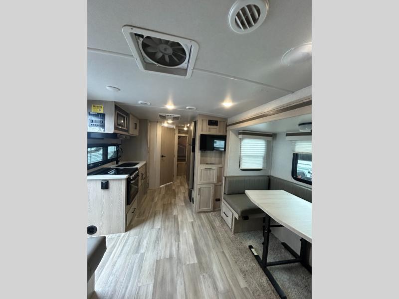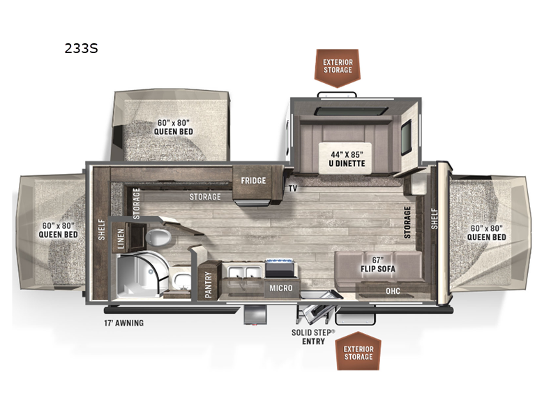 Your family will love this spacious travel trailer that can sleep up to ten people each night. There are triple queen tent end beds, a U-shaped dinette, plus a flip sofa for comfortable sleeping space. The chef of the group will have a 12V refrigerator and a pantry to store all the food, plus there is an exterior griddle for breakfast outside. This model also includes convenient exterior storage for fishing poles, tackle boxes, and your luggage!