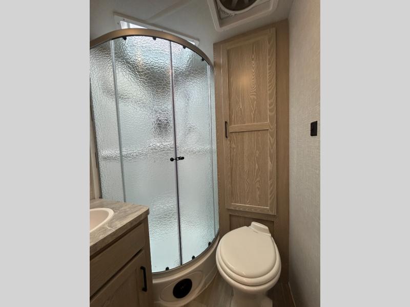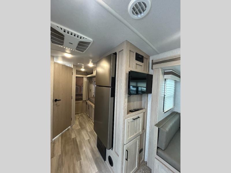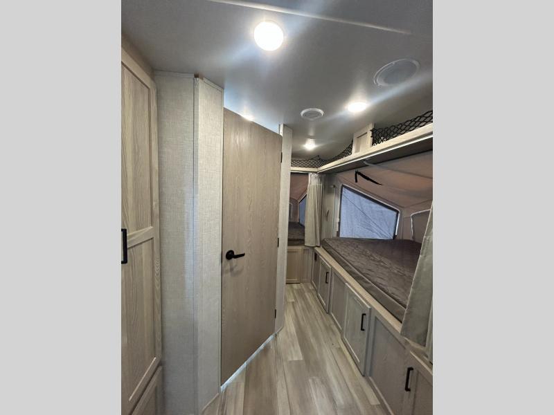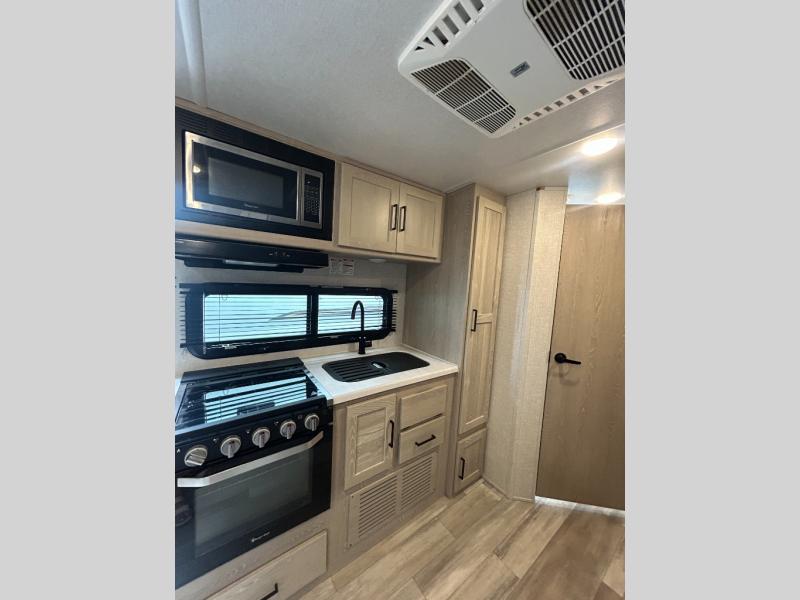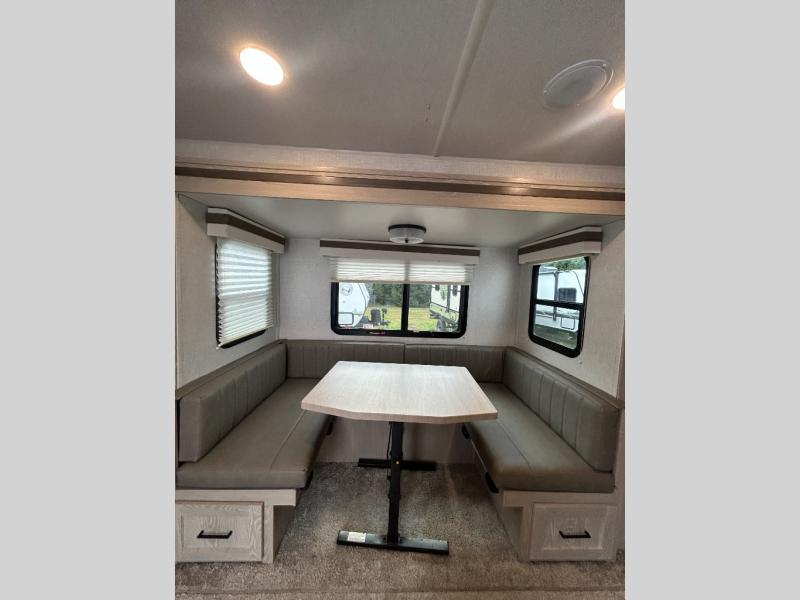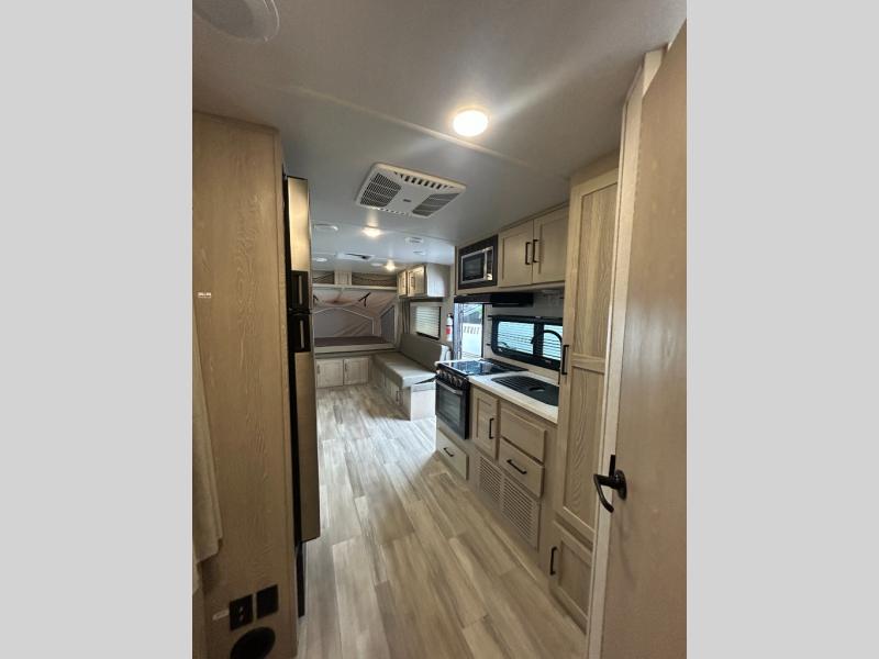 With any Rockwood Roo expandable travel trailer by Forest River you will enjoy smooth towing thanks to the torsion axle, Rubber-Ryde suspension, the easy lube axles and Nev-R-Adjust brakes, and the Goodyear Endurance tires. The key-Alike locks provide easy access in and out of your trailer, and each model includes a Teton all-in-one WiFi booster with LTE prep and an antenna for all your connection needs. Each model is constructed with a vacuum laminated one-piece roof and walls, an enclosed underbelly, and frameless windows for a more sleek look. You will enjoy many interior comforts, including hardwood cabinet doors and drawer fronts, pleated night shades, a bunk/fan light combo with each bed, and much more!