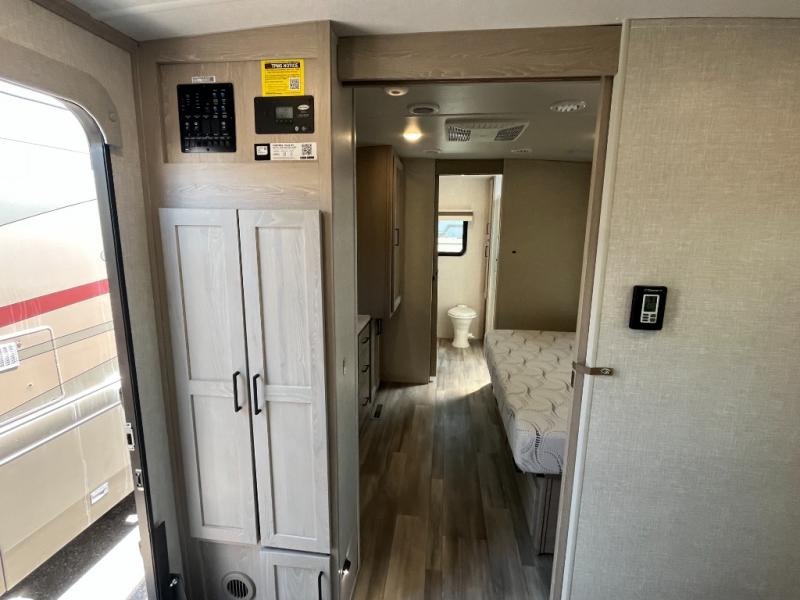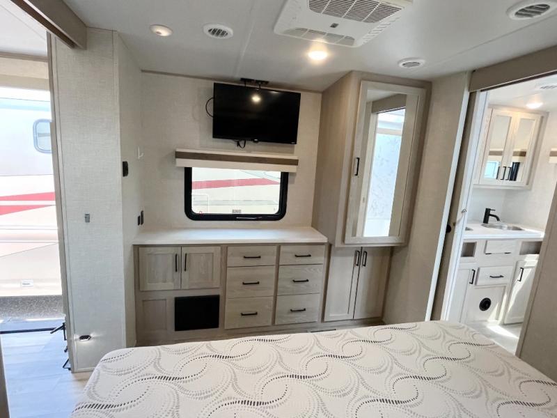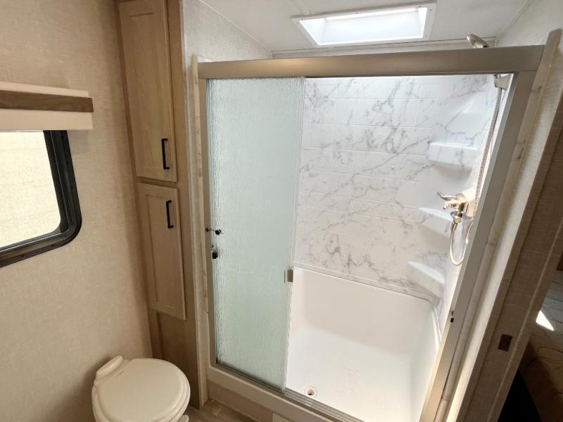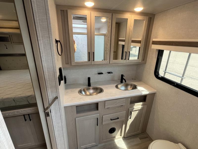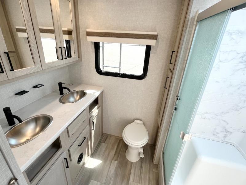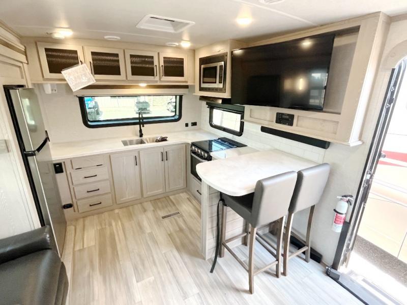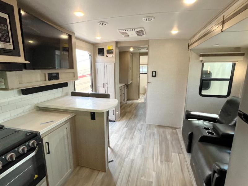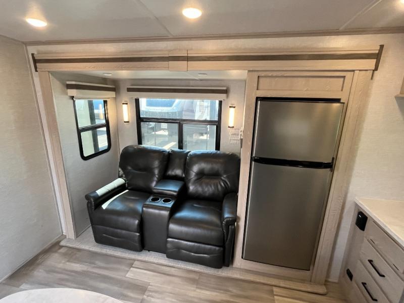 This front kitchen, couple's trailer is ready for adventure when you are! Once you arrive at your destination, prepare a quick lunch on the outside griddle, and enjoy the shade provided by the 19' power awning. You can eat outside, or inside at the counter with stools. The theatre seat will make this travel trailer feel more like home, and the double slides provide more space to stretch out. Within the master bedroom you'll find a king bed, a large wardrobe and a dresser, plus an optional TV. And check out the full rear bath with dual bath sinks and a shower with a seat! Now, that's what I call comfort!
