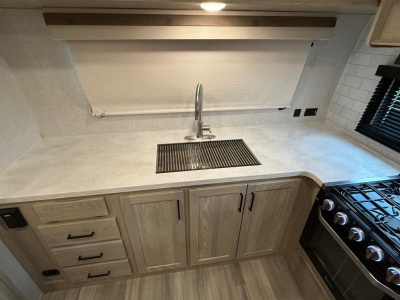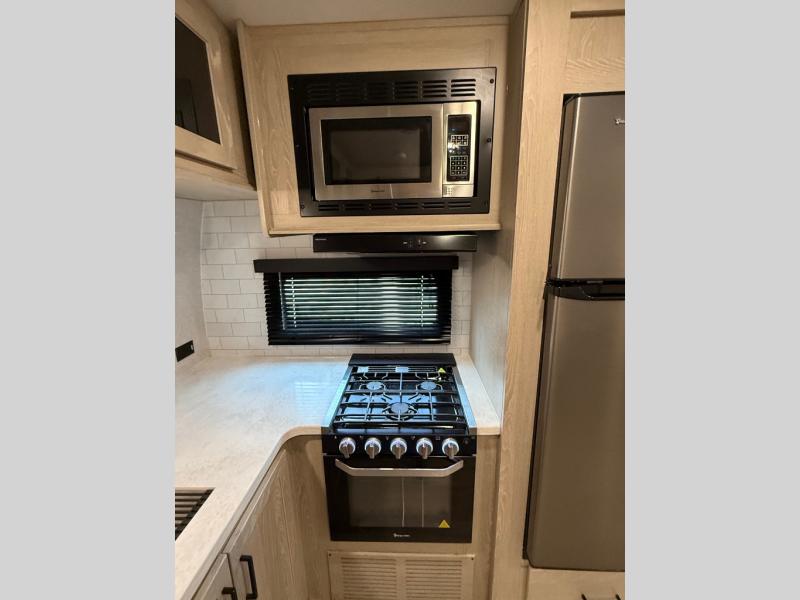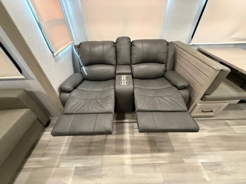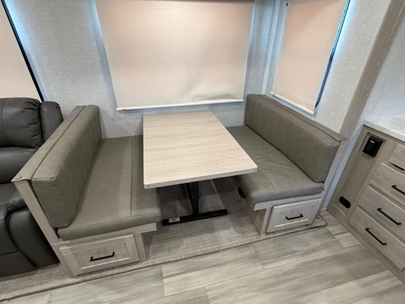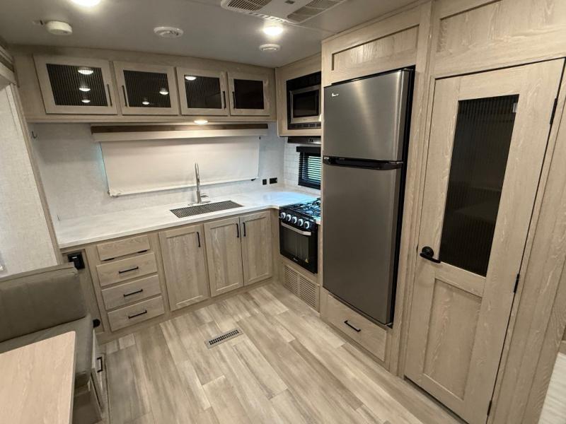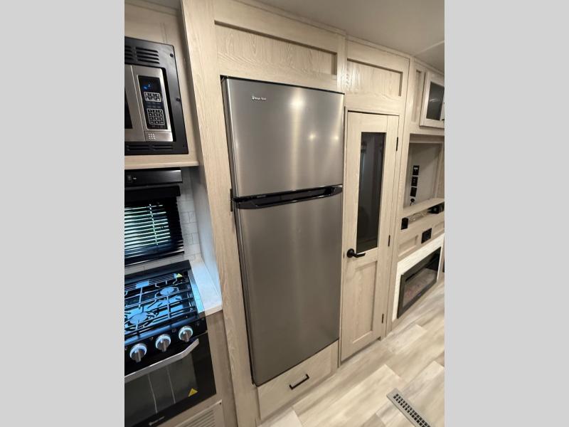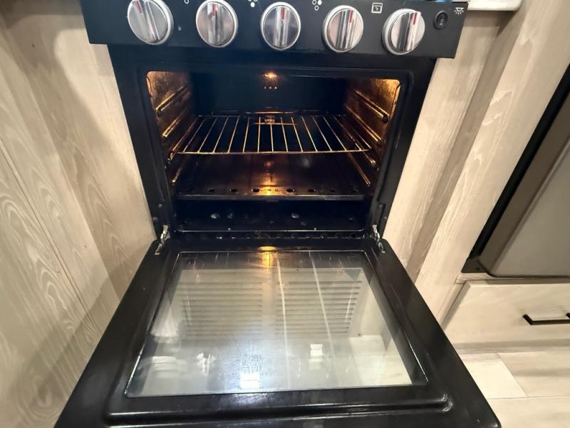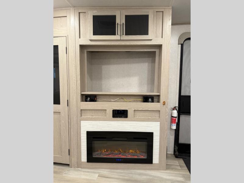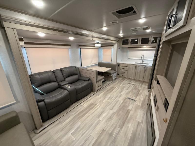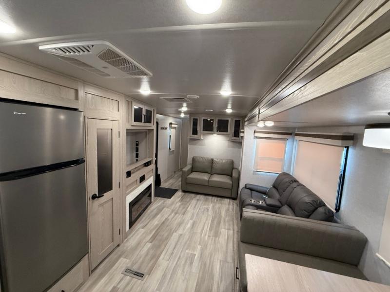 Trips to the lake or full-time living, you can do it all in this travel trailer that can sleep five each night. Once you arrive at your destination, grab your camp chairs from the exterior storage, then make lunch on the outside griddle. If the weather isn't cooperating, you can prepare your food indoors on the three burner range. You'll find a booth dinette here, as well as a 60" theater seat and a 60" hide-a-bed sofa. The fireplace will make this area feel more like home, and there is an LED TV for movie night. This travel trailer also features dual entry doors, allowing you to enter in through the main living area or the rear master bedroom!
