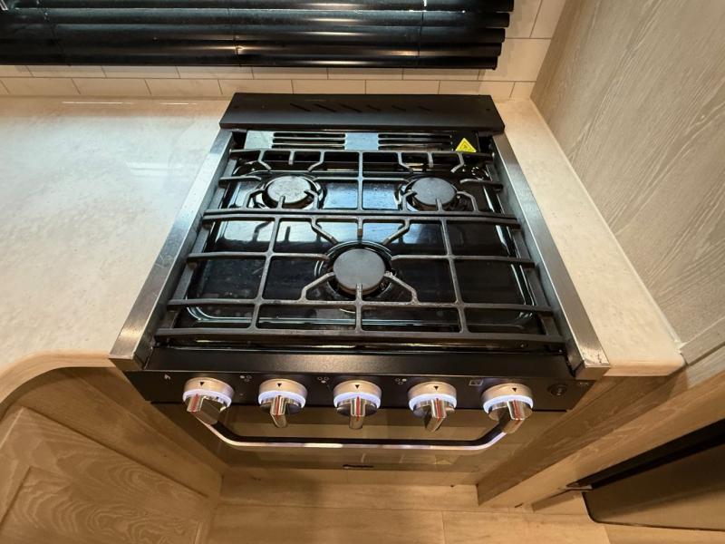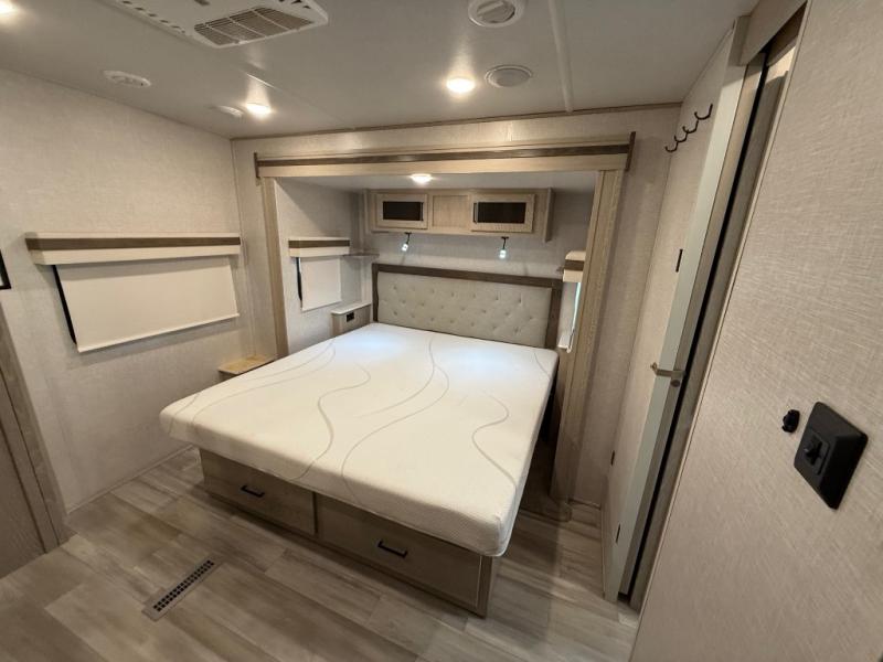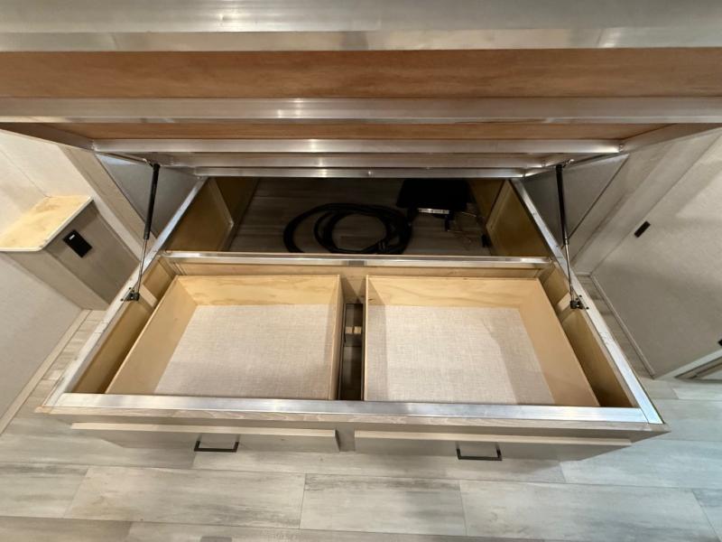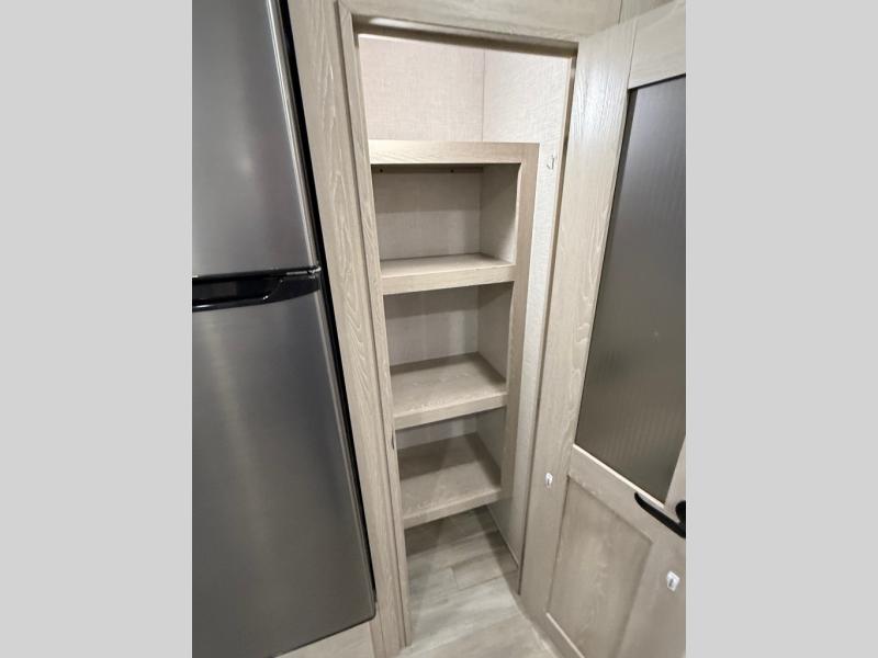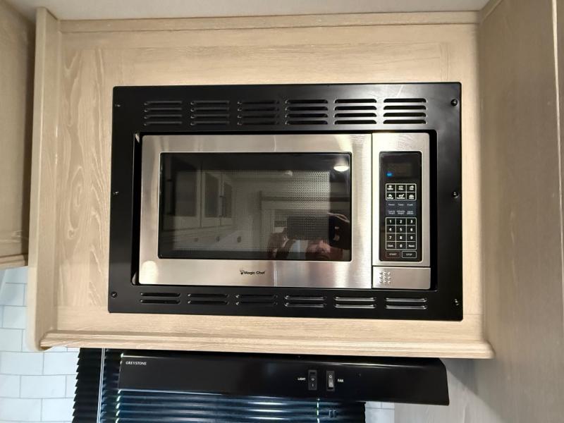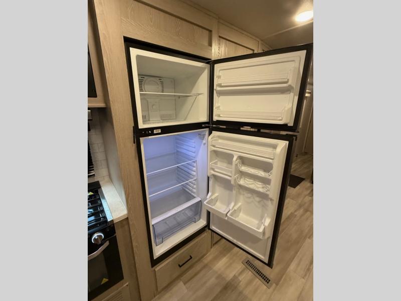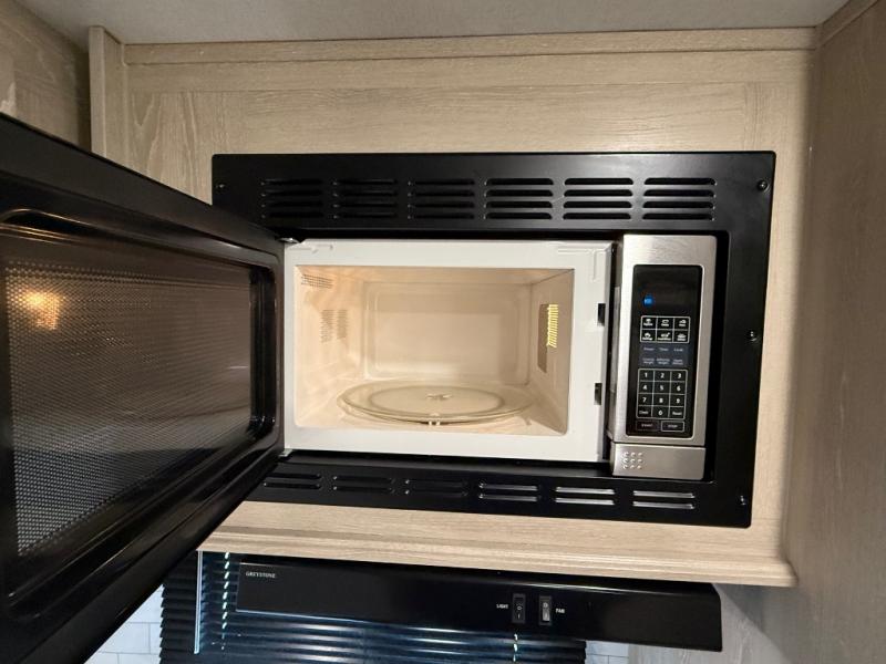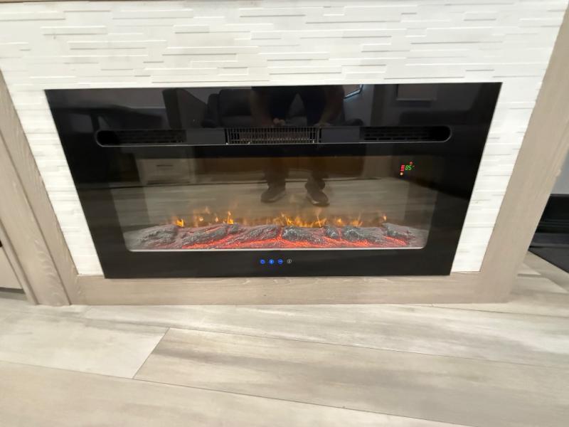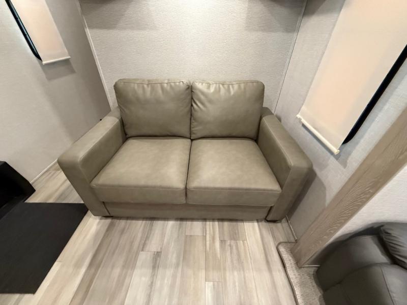 Trips to the lake or full-time living, you can do it all in this travel trailer that can sleep five each night. Once you arrive at your destination, grab your camp chairs from the exterior storage, then make lunch on the outside griddle. If the weather isn't cooperating, you can prepare your food indoors on the three burner range. You'll find a booth dinette here, as well as a 60" theater seat and a 60" hide-a-bed sofa. The fireplace will make this area feel more like home, and there is an LED TV for movie night. This travel trailer also features dual entry doors, allowing you to enter in through the main living area or the rear master bedroom!