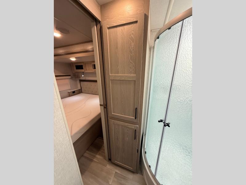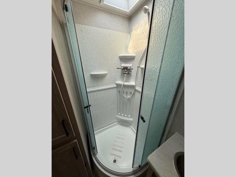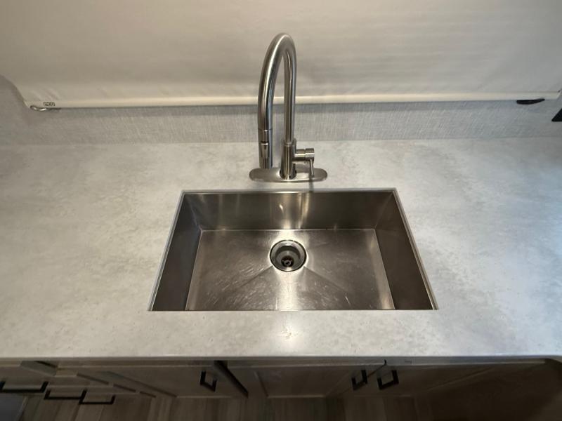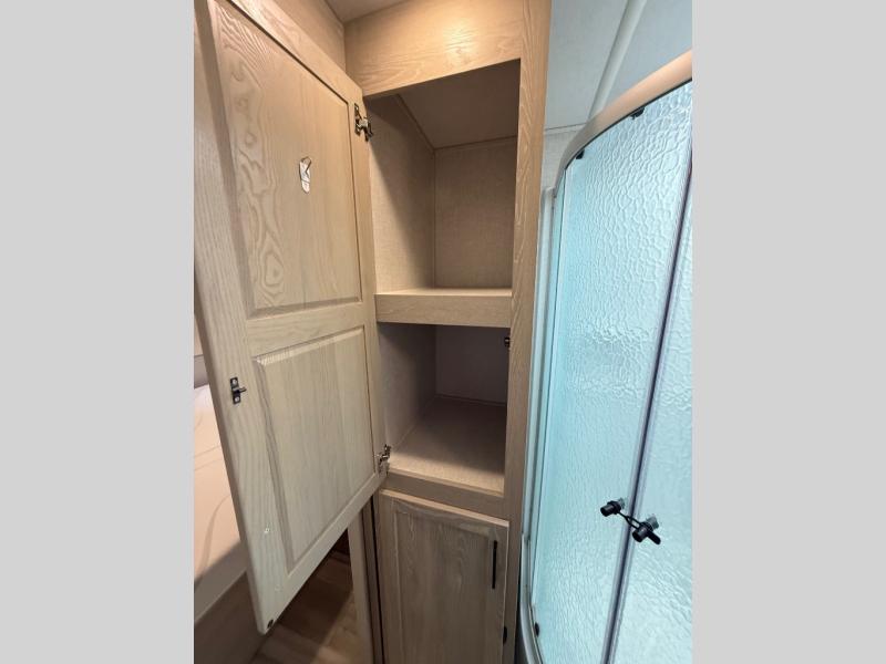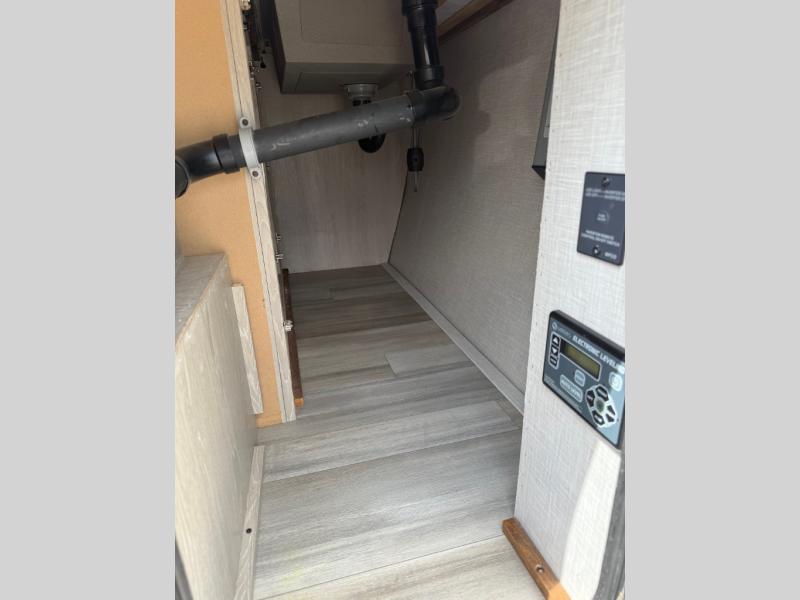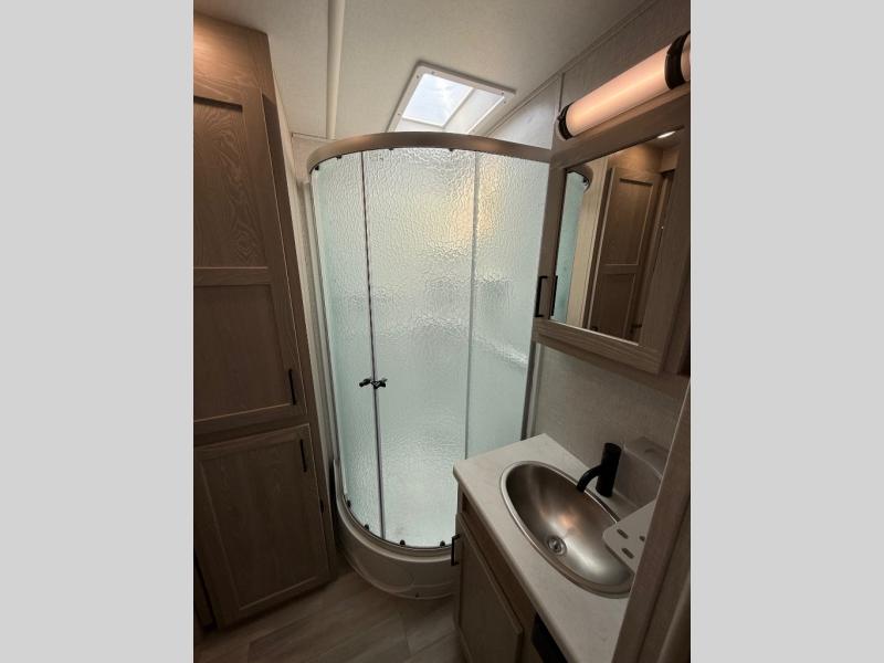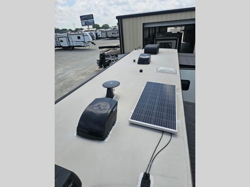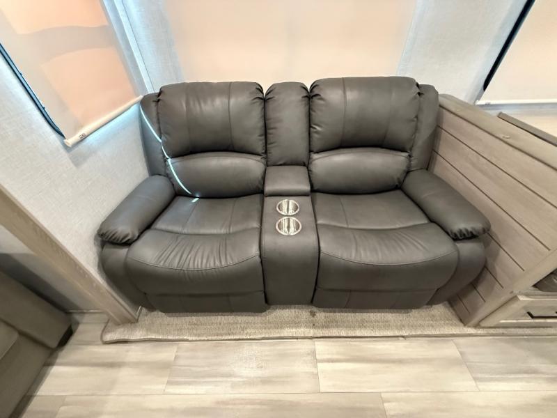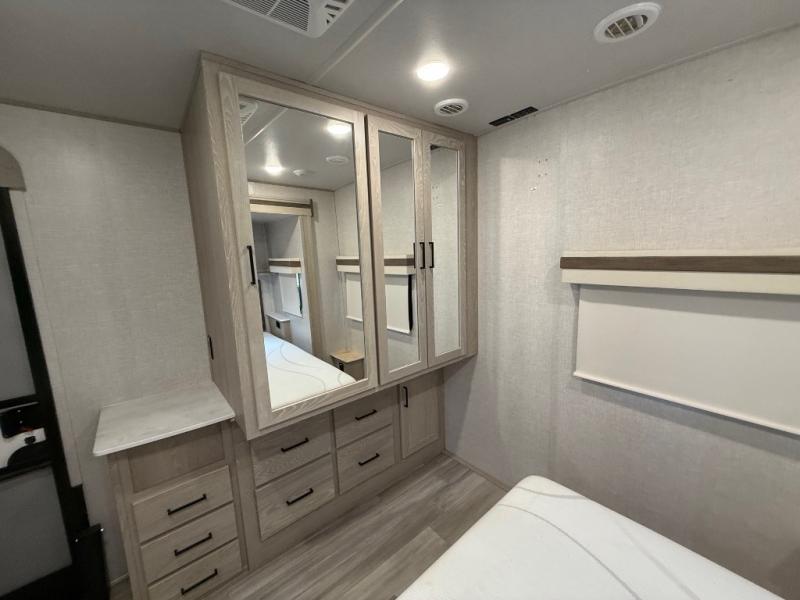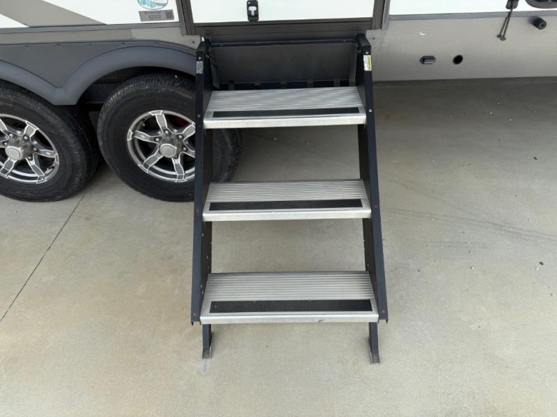 Trips to the lake or full-time living, you can do it all in this travel trailer that can sleep five each night. Once you arrive at your destination, grab your camp chairs from the exterior storage, then make lunch on the outside griddle. If the weather isn't cooperating, you can prepare your food indoors on the three burner range. You'll find a booth dinette here, as well as a 60" theater seat and a 60" hide-a-bed sofa. The fireplace will make this area feel more like home, and there is an LED TV for movie night. This travel trailer also features dual entry doors, allowing you to enter in through the main living area or the rear master bedroom!