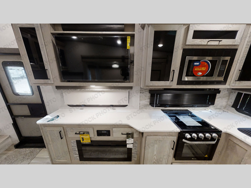 When you camp, why not have enough space for all your RVing friends to visit? This RV offers the perfect living and kitchen area with a large slide giving everyone more floor space, plus there is a king U-shaped dinette and a hide-a-bed sofa to sit on, a fireplace to enjoy and an LED TV to watch a game or movie together. The cook will love the rear kitchen with extra counter space along a side wall to leave all the snacks and treats for everyone. You might even take everyone outside to enjoy the 20' power awning that offers an outdoor living area with some protection and LED lighting, just grab your camping chairs from the pass-through storage. There is an outside griddle to utilize as well. At night, you can retire to the front bedroom with a queen bed and a wardrobe slide that stretches into the double entry bathroom and includes linen storage.