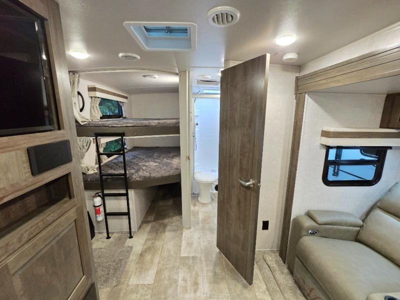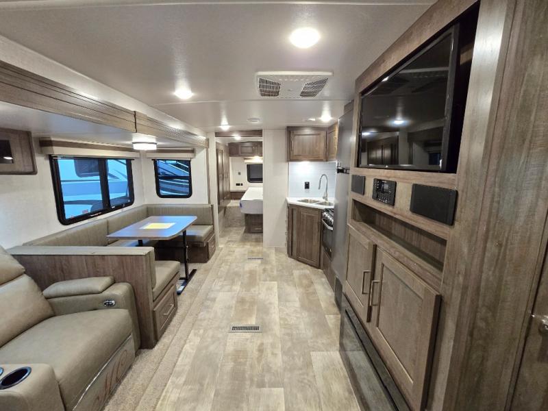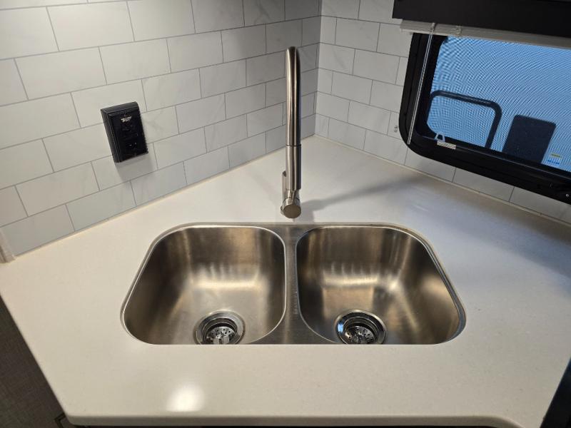 Looking for a trailer that sleeps eight, allows you to cook indoors or outdoors, and offers dual entry for convenience when you travel with a bigger group? This trailer provides for those wants and needs, and offers even more! The outside camp kitchen gives you more choices when feeding the masses along with the outside griddle, and the interior kitchen includes an L-shaped area for the cook to have their own space with full amenities including a counter extension and a walk-in pantry to bring along everything they need. The full bathroom will keep everyone refreshed, and the theater seating along with the U-shaped dinette offer seating inside to enjoy the LED TV and fireplace. There is plenty of storage found throughout the interior, and along the exterior you will find several places to stow your outdoor items including in the drop frame storage.