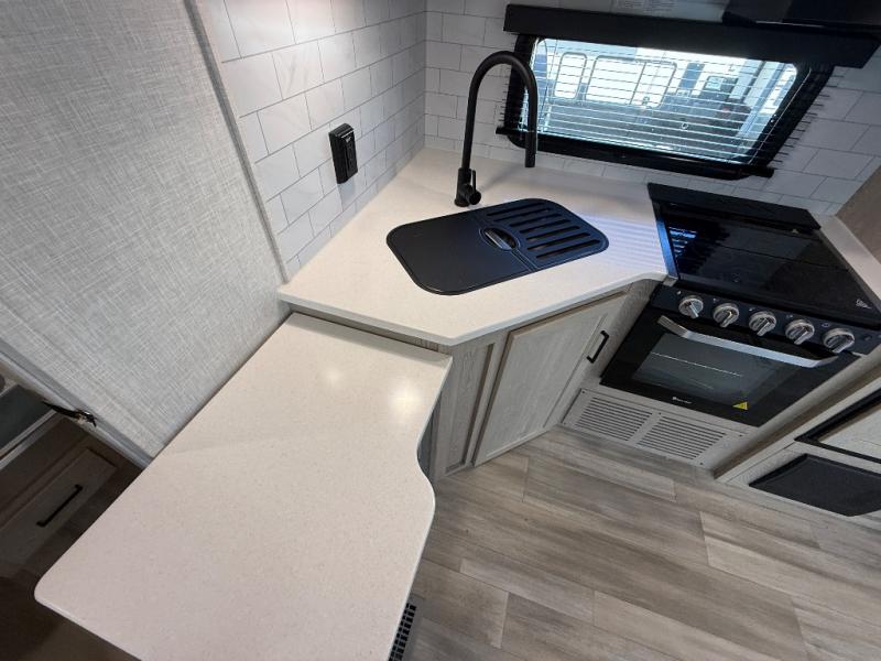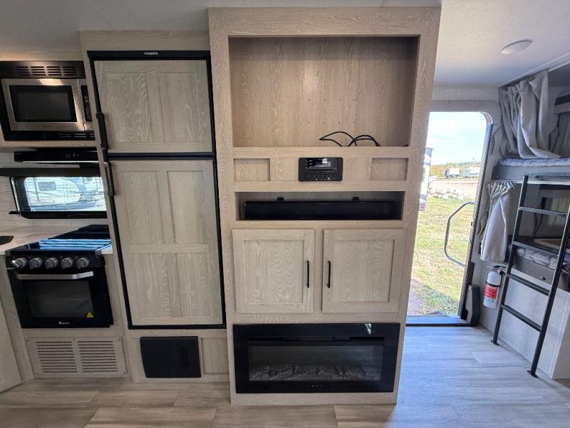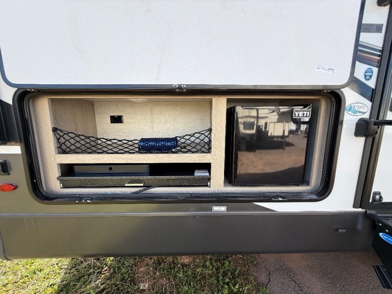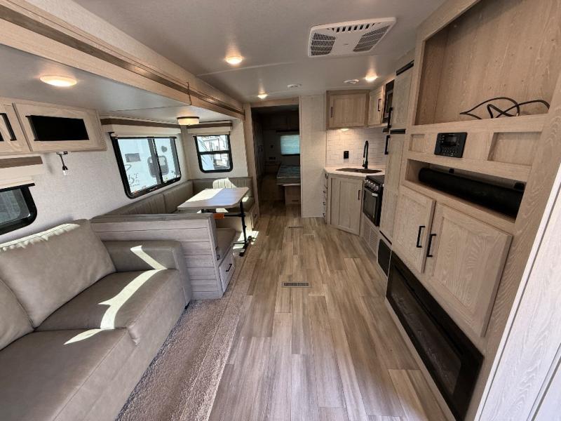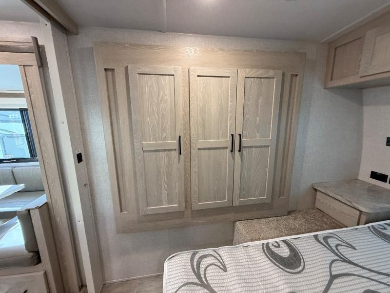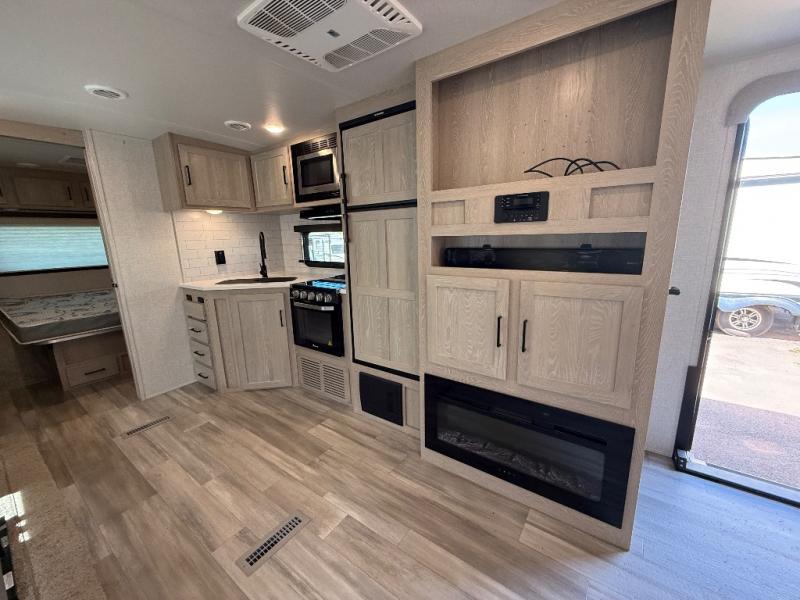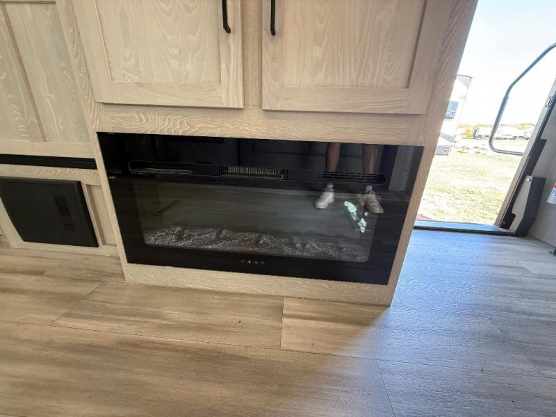 Looking for a trailer that sleeps eight, allows you to cook indoors or outdoors, and offers dual entry for convenience when you travel with a bigger group? This trailer provides for those wants and needs, and offers even more! The outside camp kitchen gives you more choices when feeding the masses along with the outside griddle, and the interior kitchen includes an L-shaped area for the cook to have their own space with full amenities including a counter extension and a walk-in pantry to bring along everything they need. The full bathroom will keep everyone refreshed, and the theater seating along with the U-shaped dinette offer seating inside to enjoy the LED TV and fireplace. There is plenty of storage found throughout the interior, and along the exterior you will find several places to stow your outdoor items including in the drop frame storage.