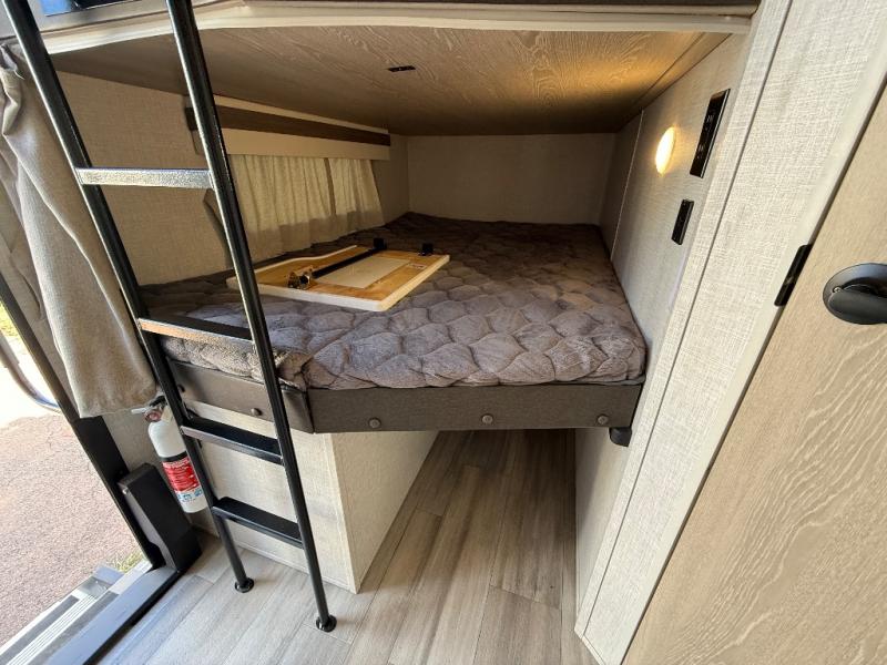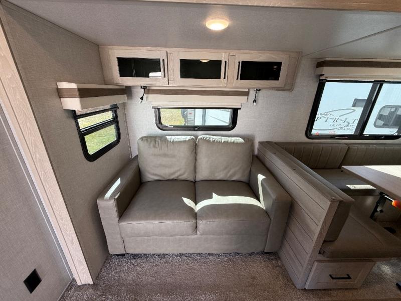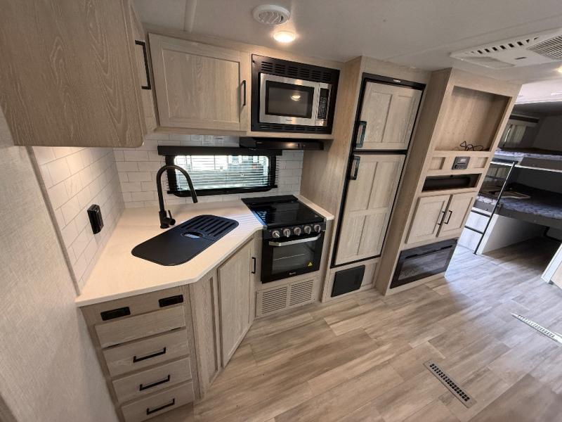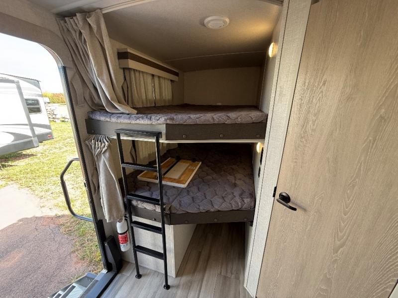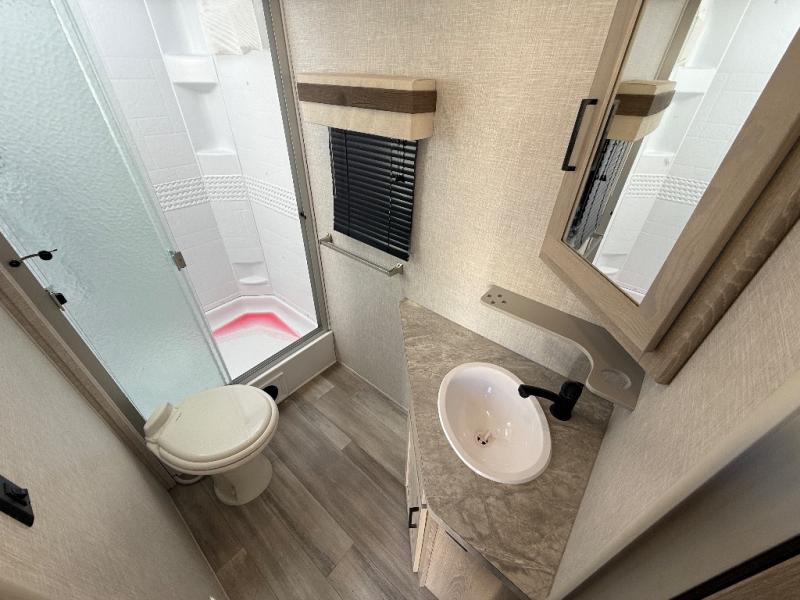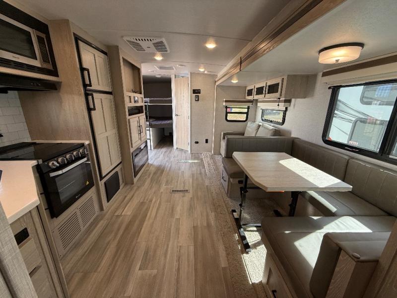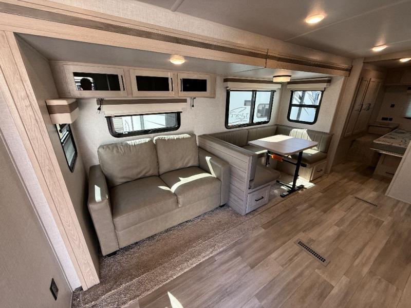 Looking for a trailer that sleeps eight, allows you to cook indoors or outdoors, and offers dual entry for convenience when you travel with a bigger group? This trailer provides for those wants and needs, and offers even more! The outside camp kitchen gives you more choices when feeding the masses along with the outside griddle, and the interior kitchen includes an L-shaped area for the cook to have their own space with full amenities including a counter extension and a walk-in pantry to bring along everything they need. The full bathroom will keep everyone refreshed, and the theater seating along with the U-shaped dinette offer seating inside to enjoy the LED TV and fireplace. There is plenty of storage found throughout the interior, and along the exterior you will find several places to stow your outdoor items including in the drop frame storage.